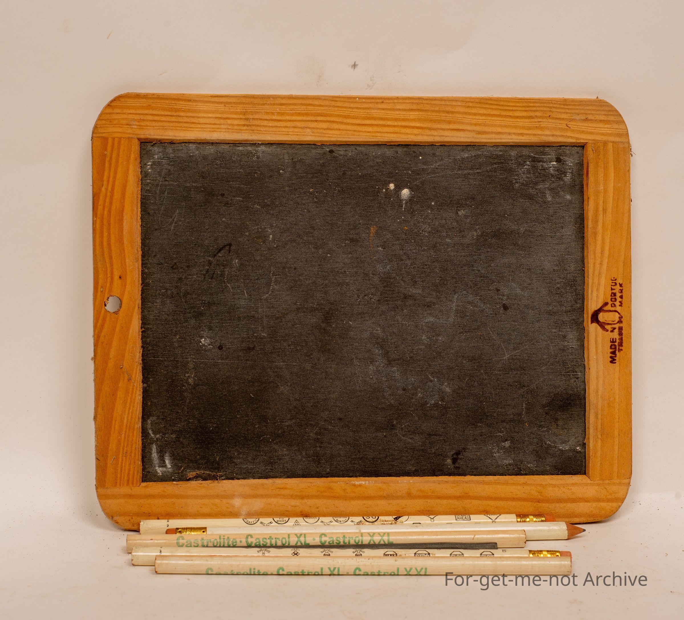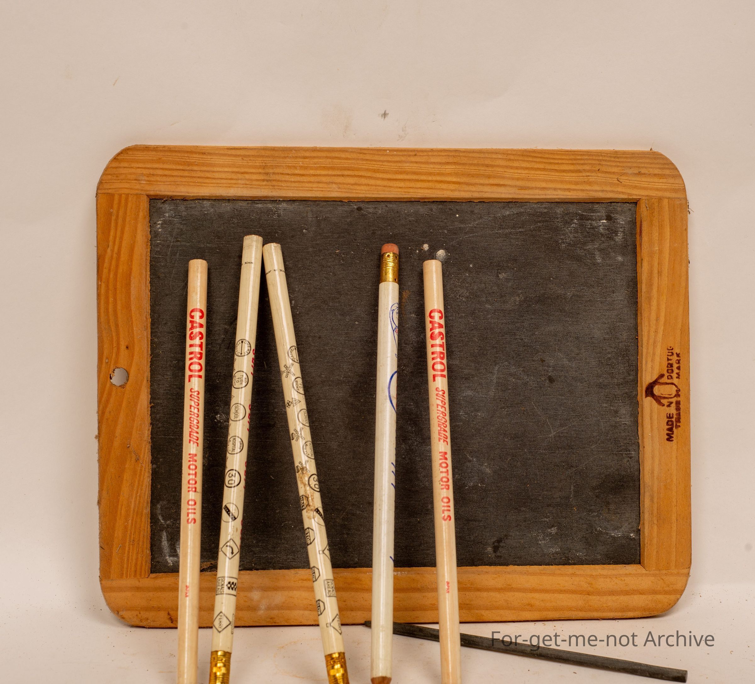 Kids slate blackboard with advertising pencils, Castrol, Esso, and traffic symbols, and a slate pen