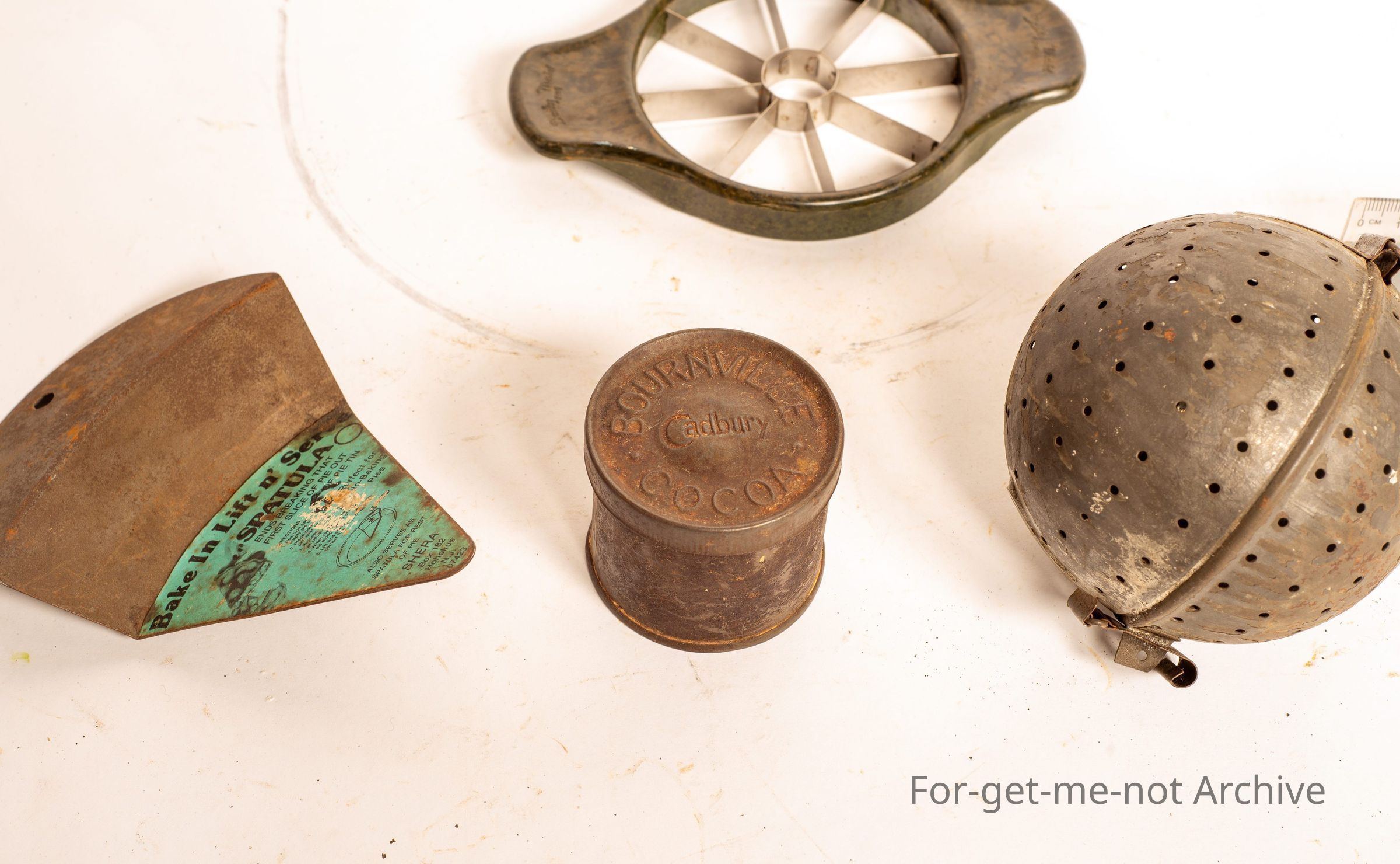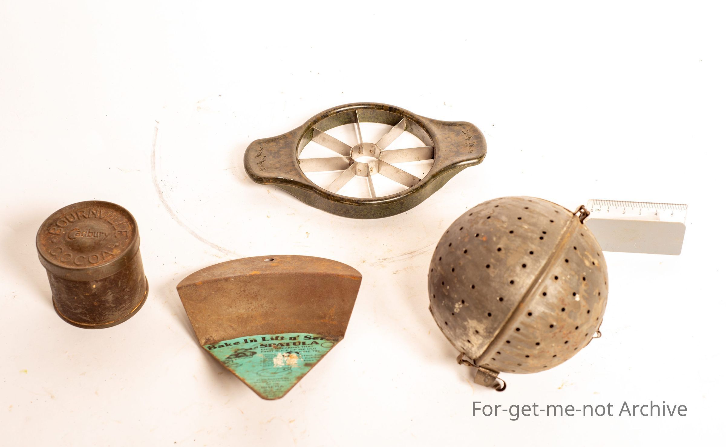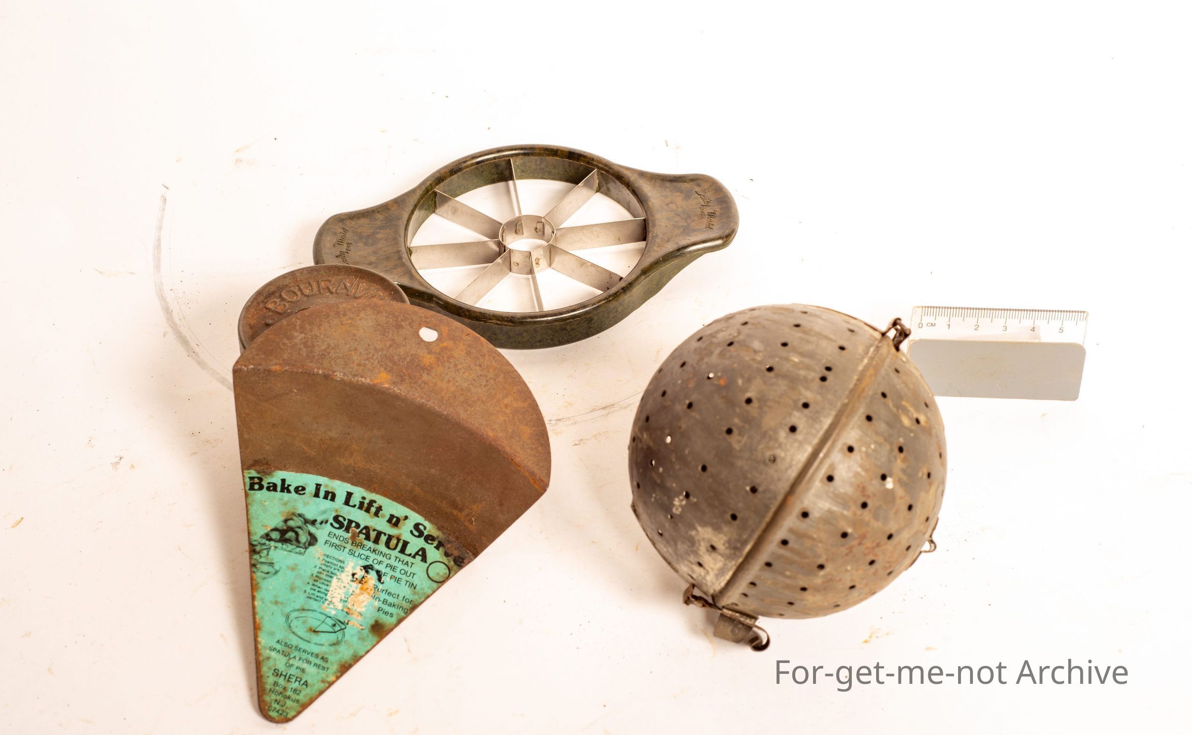 Tinware again. One as a segment for cutting, or lifting segments of pie from a dish. Another one has a slicer of perhaps apples and a rice cooker. Group of 4 with a little kitchen tin, as well, of cocoa.Collection