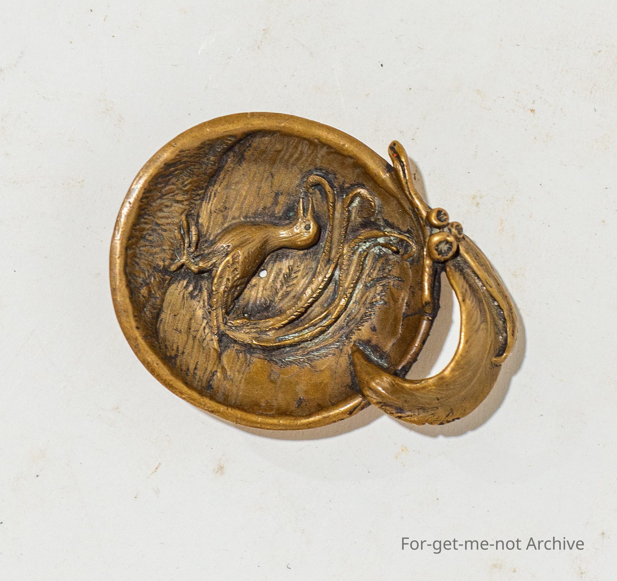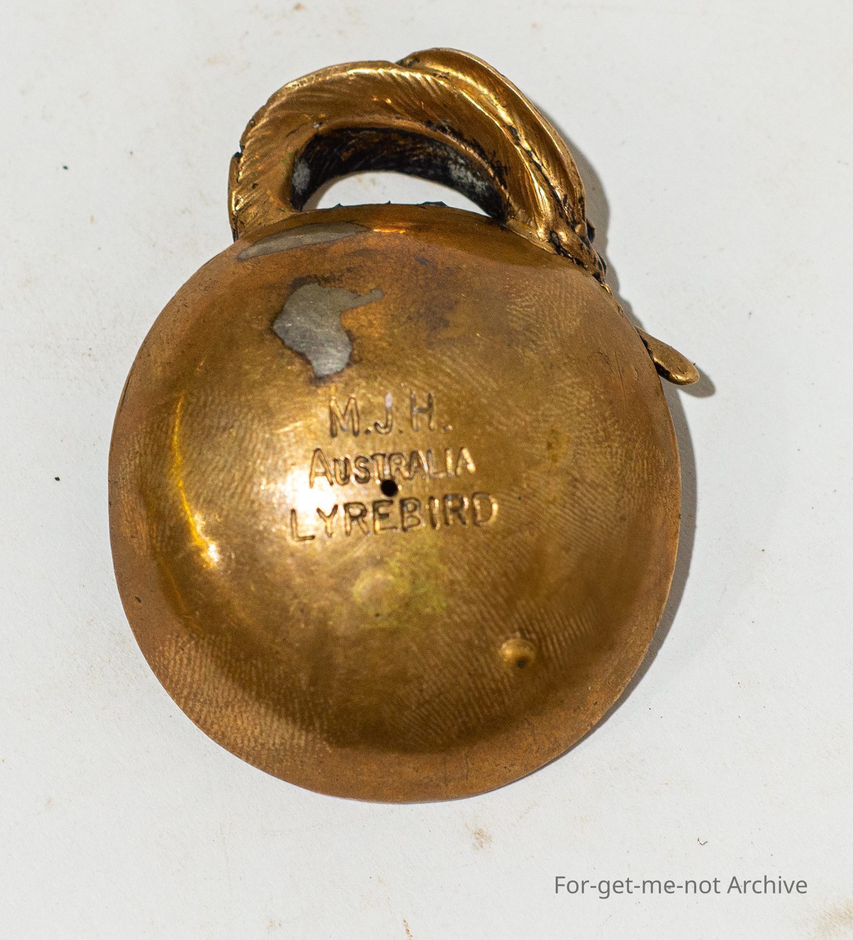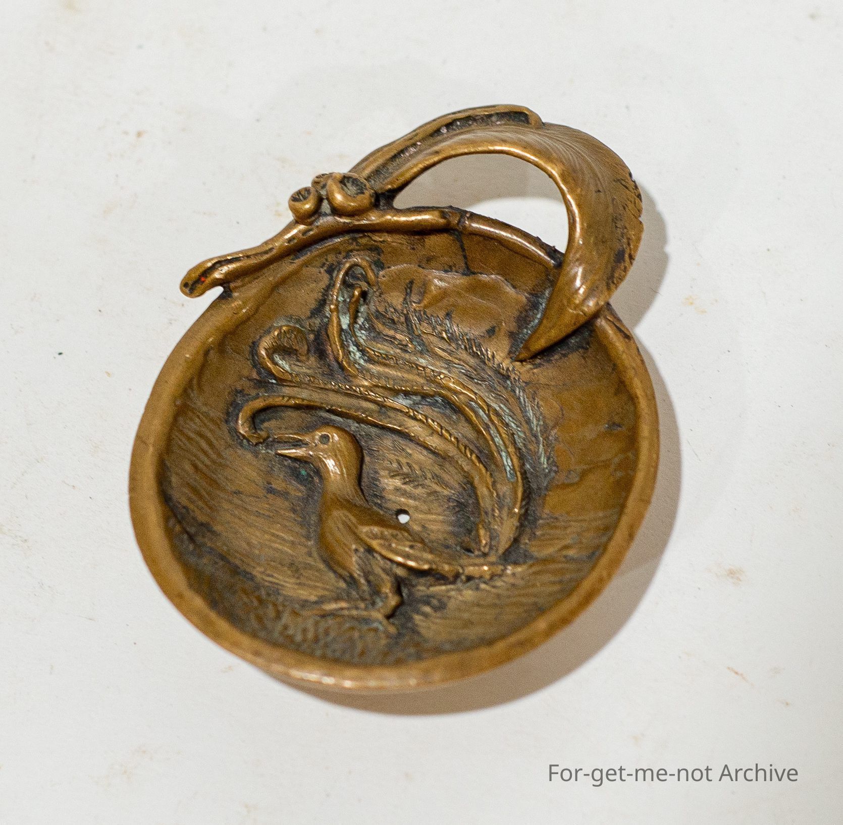 Small Brass dish, 50mm, Australian made design, with a lyrebird image and gumnuts on dish, "M.J.H. Australia, Lyrbird"