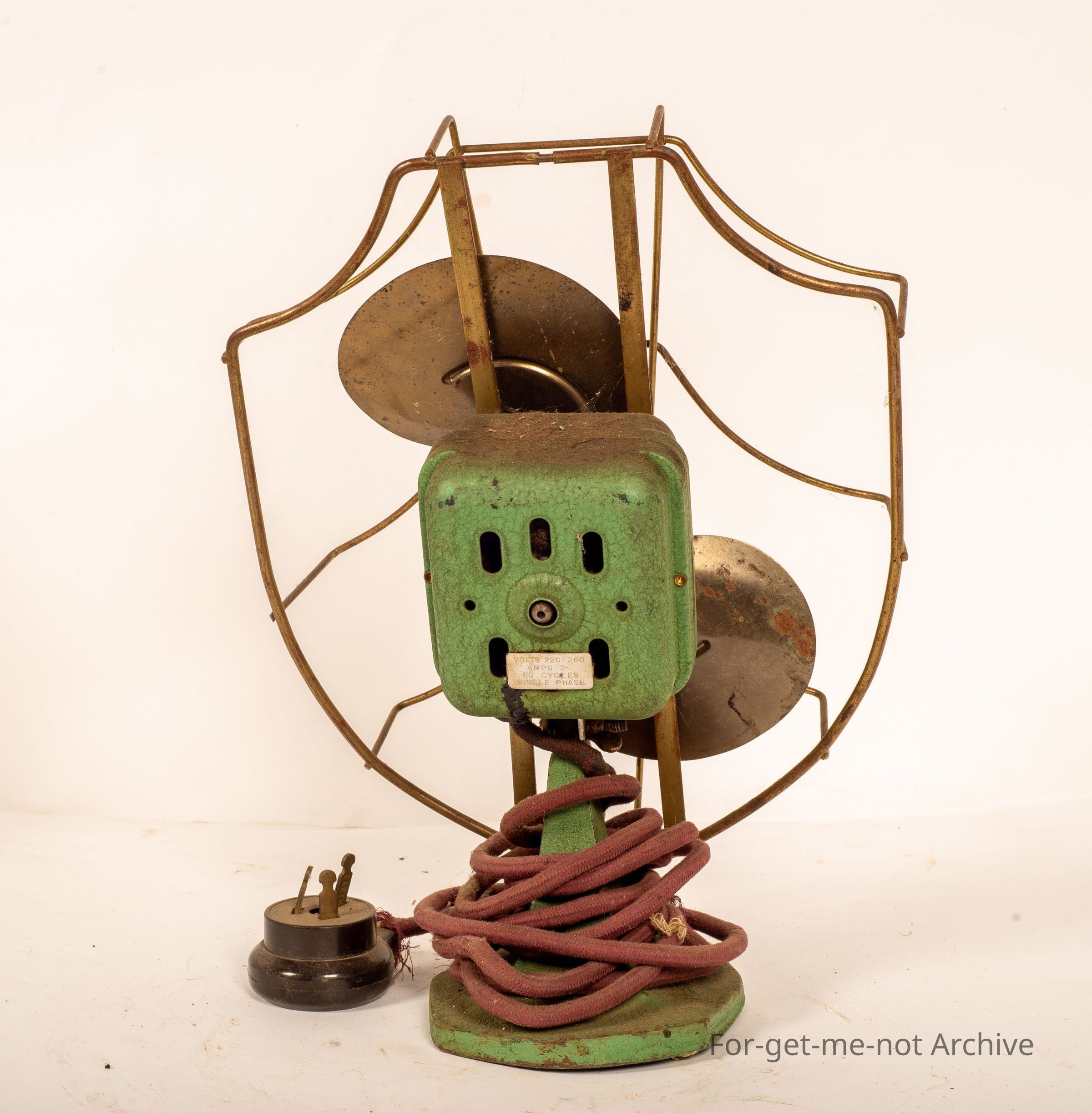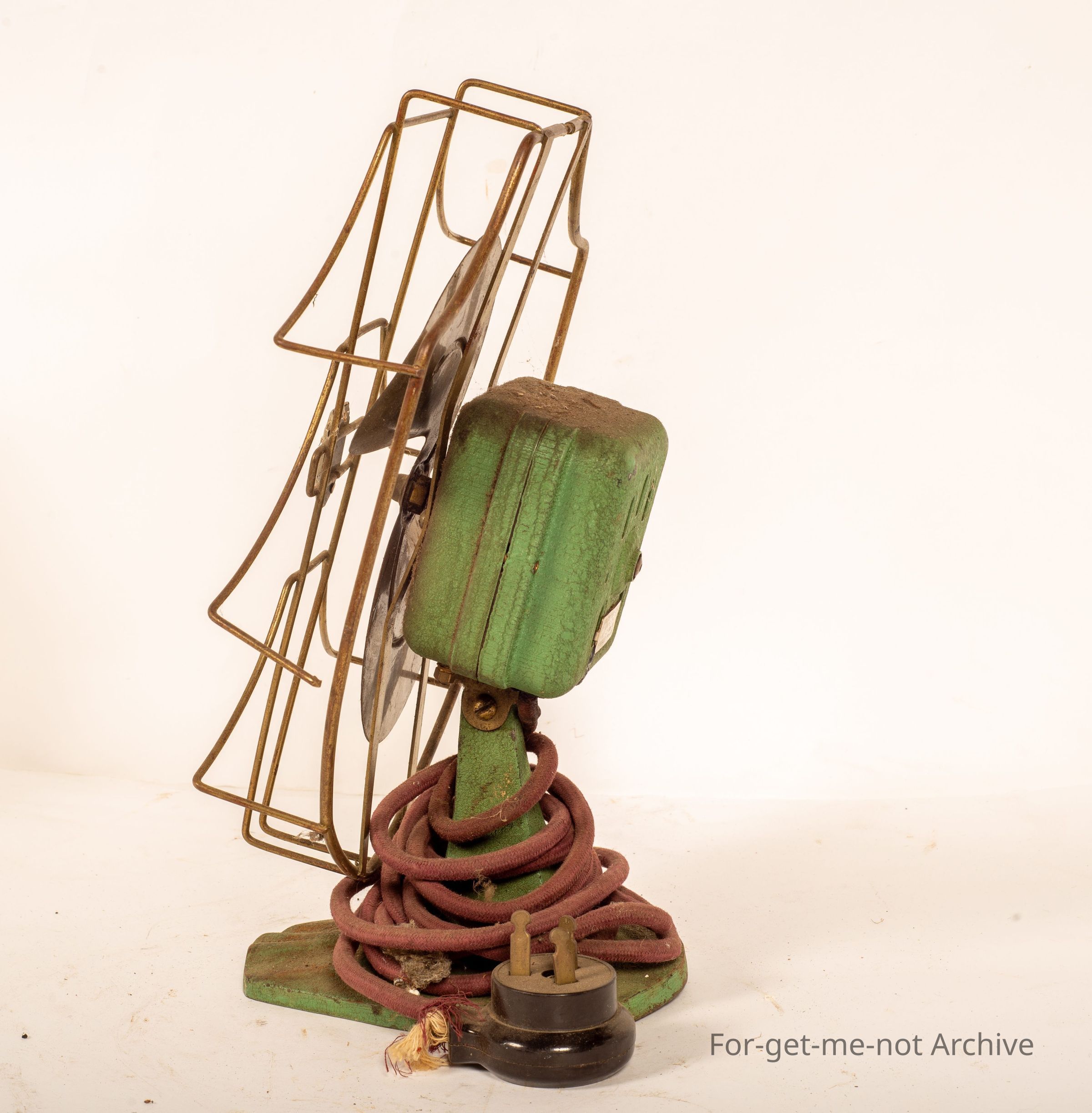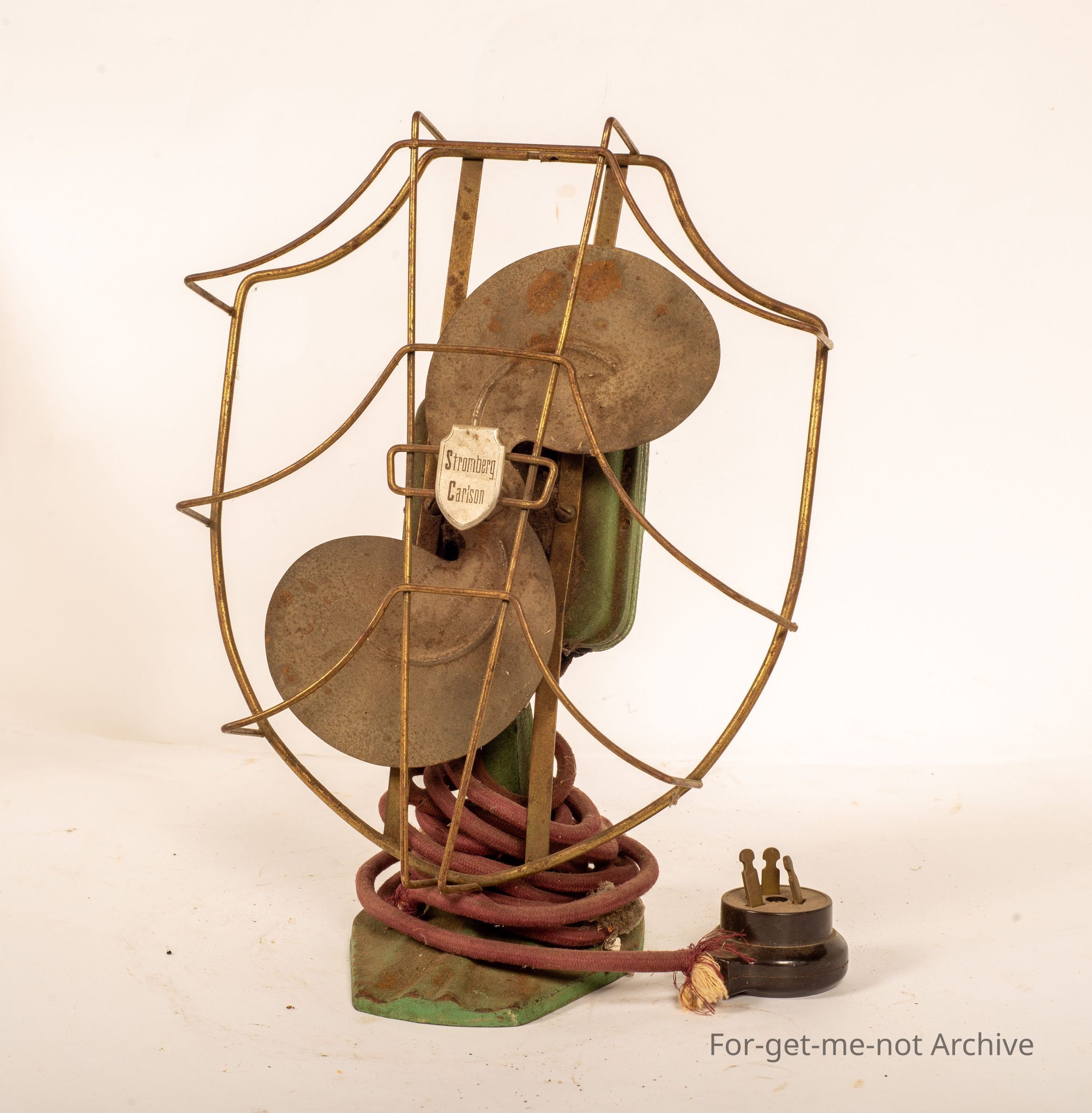 This is another household small fan, manufactured by Stromberg Carlson. A different pattern to the protecting frame. Otherwise, the cast iron frame, the motor, everything is the same. A wonderful little piece.Collection