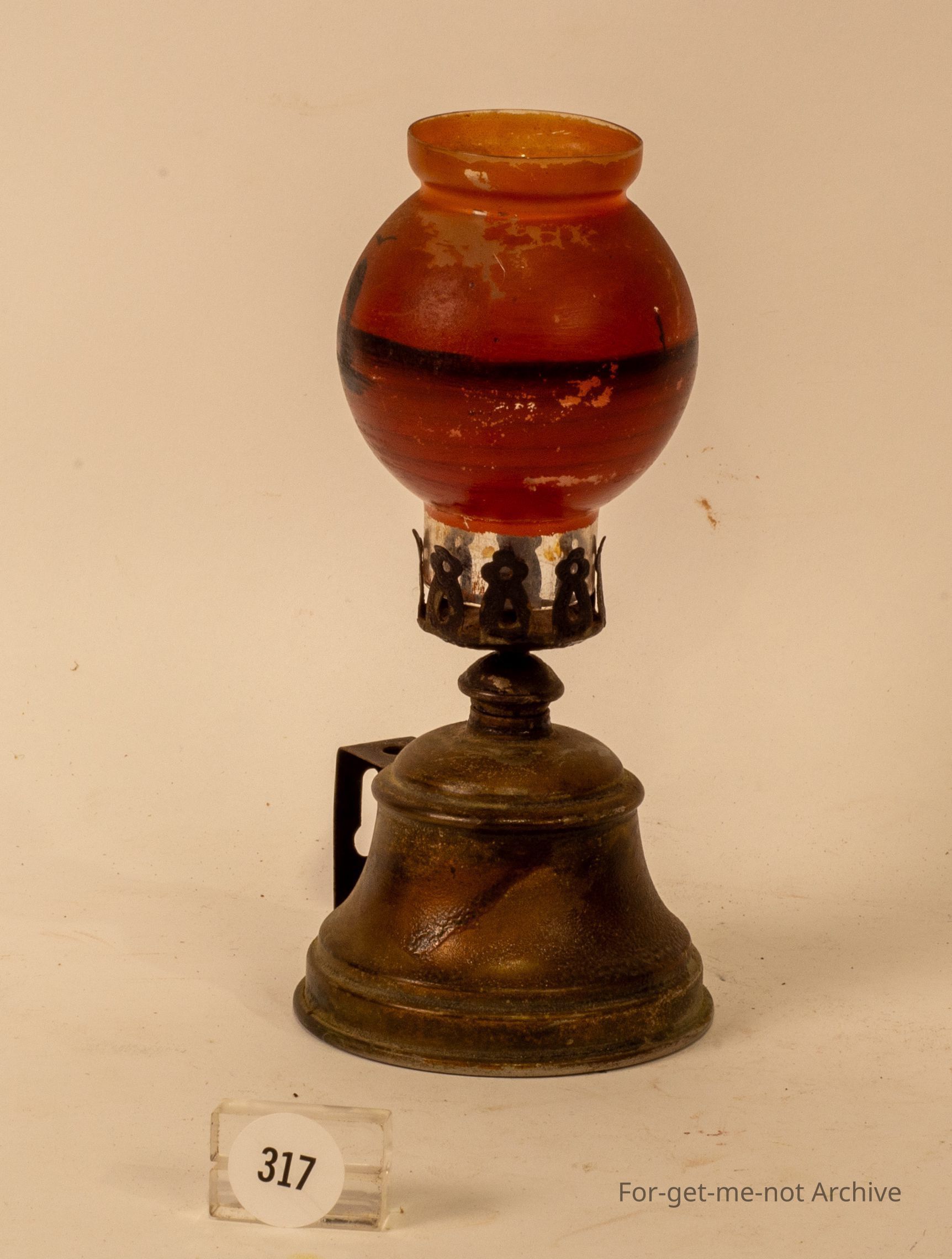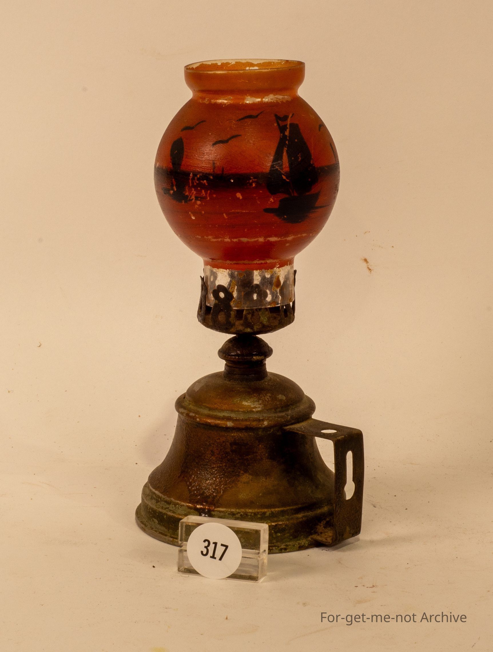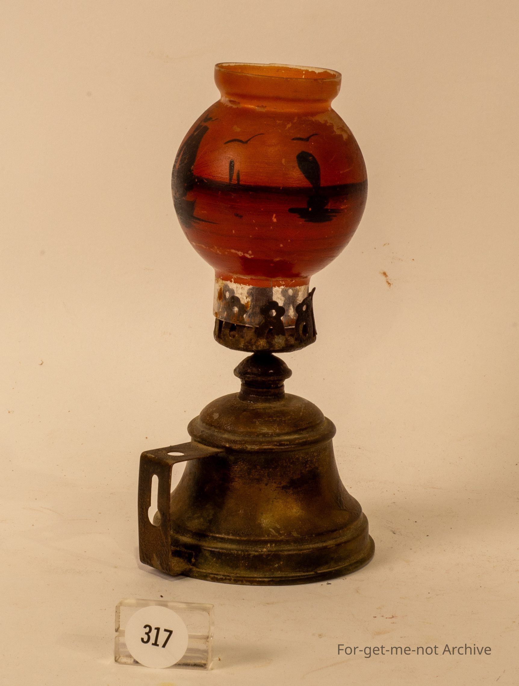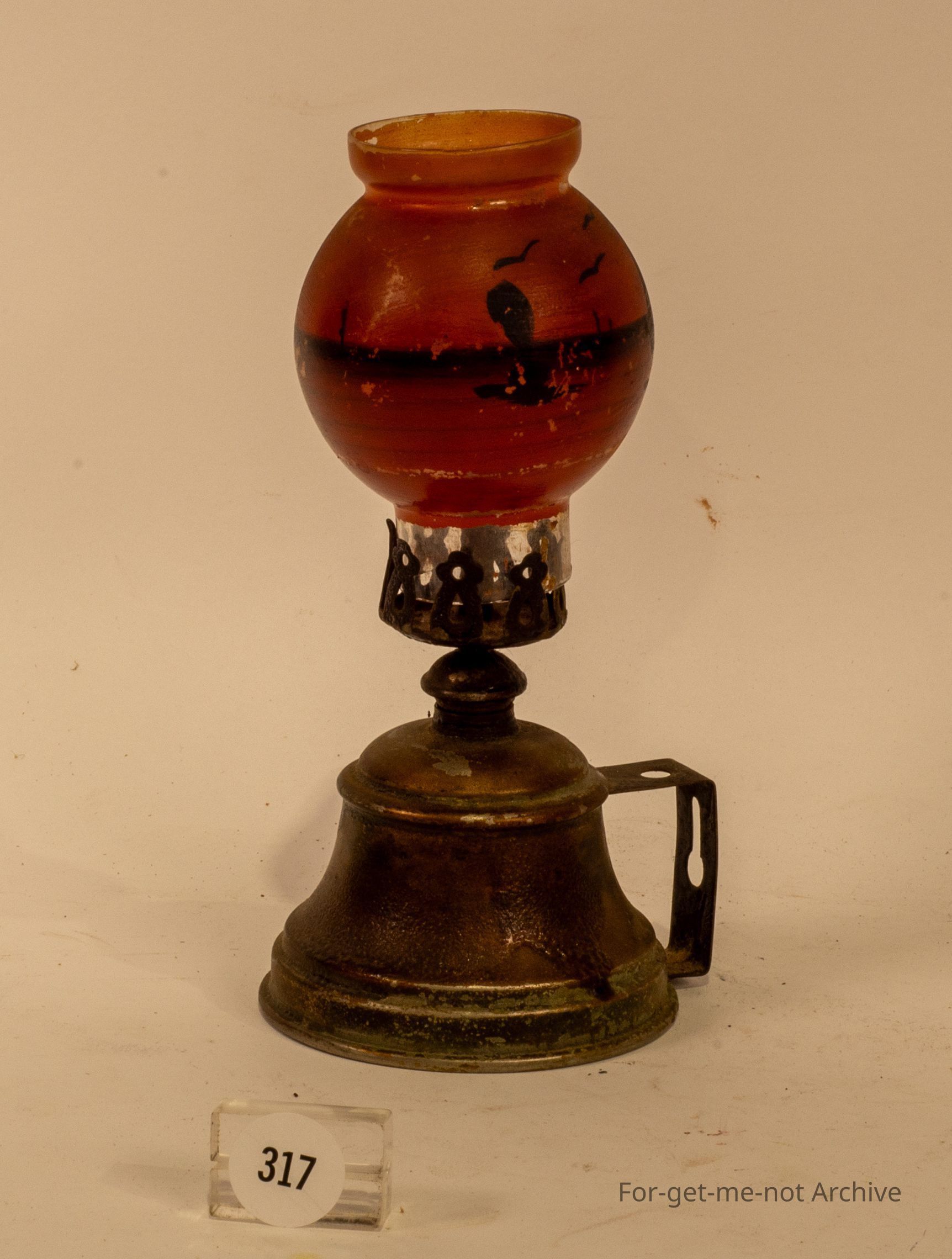 Small Japanese oil lamp brass Font, glass decorated chimney