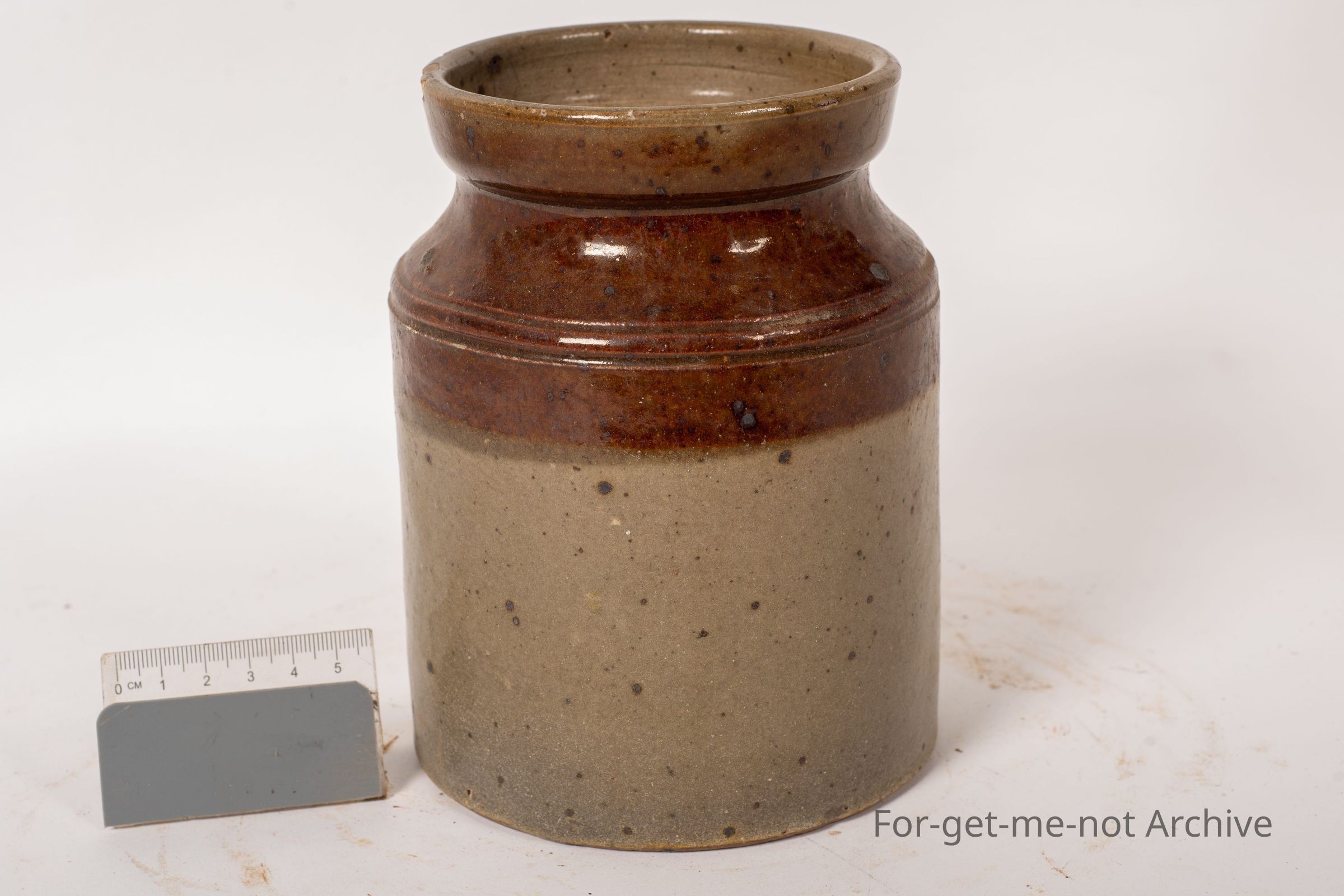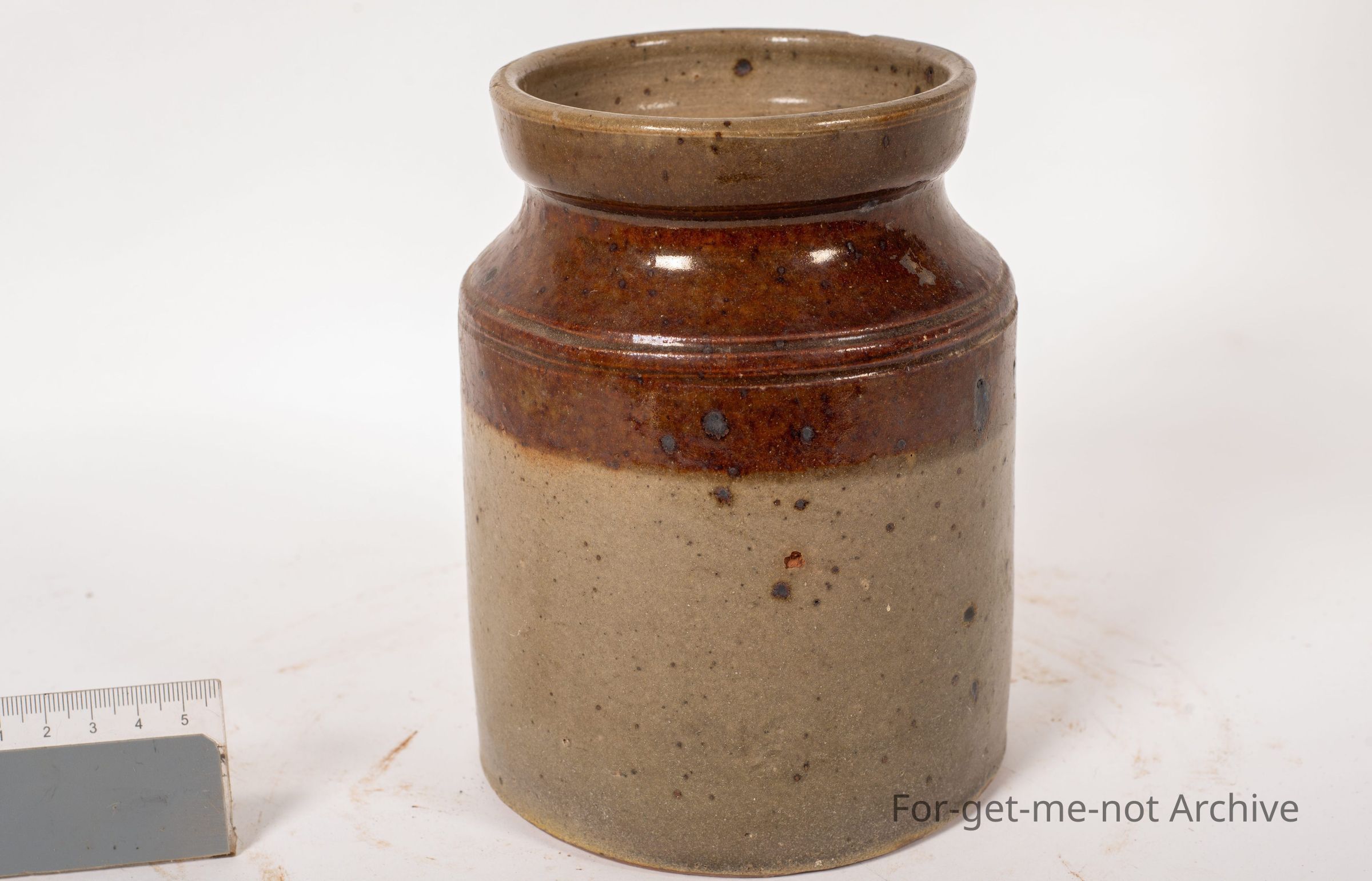 This is a small size storage jar. High neck variety. Does have a lid. No stamping or ink marks. Unusual clay body. Unusual glaze.