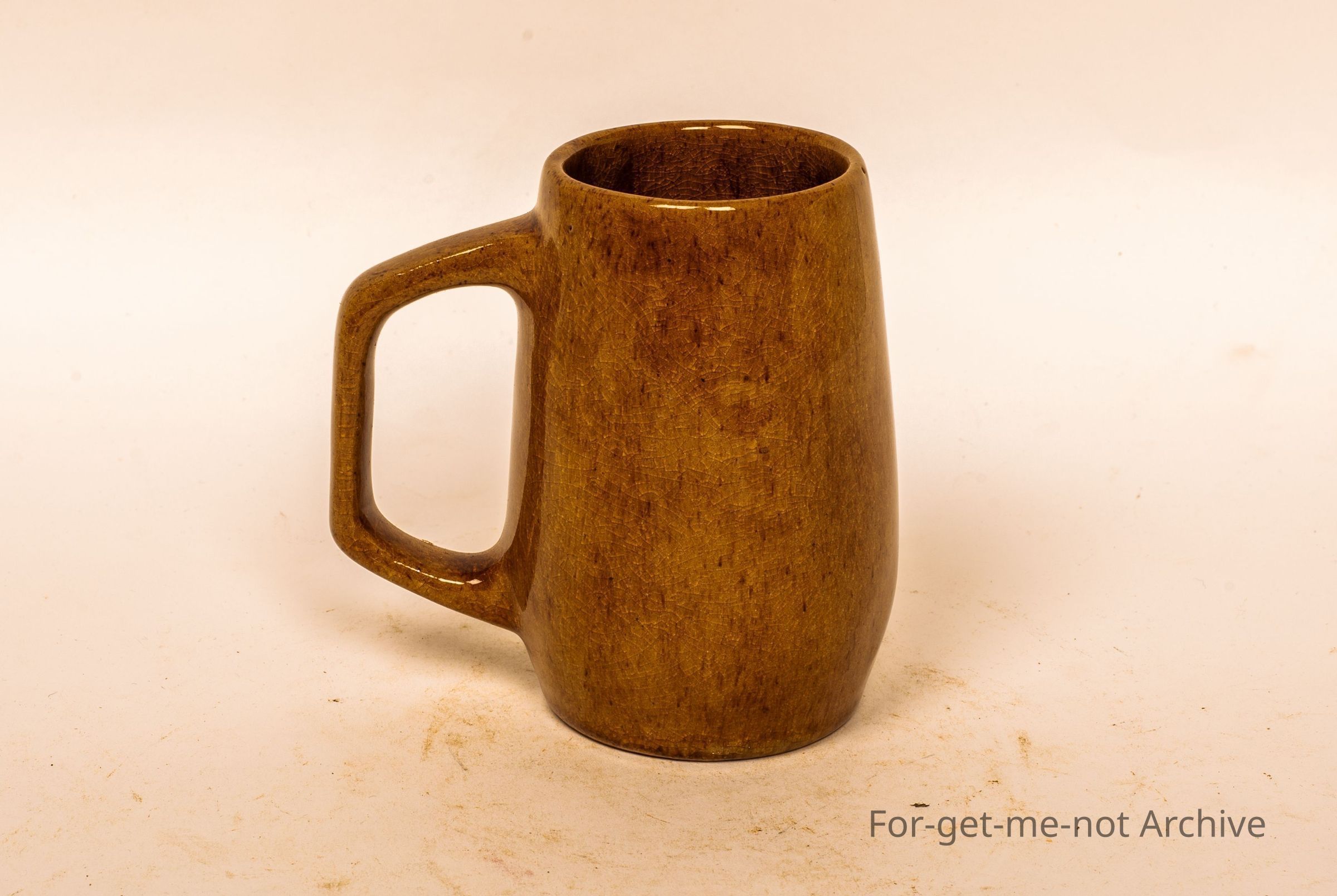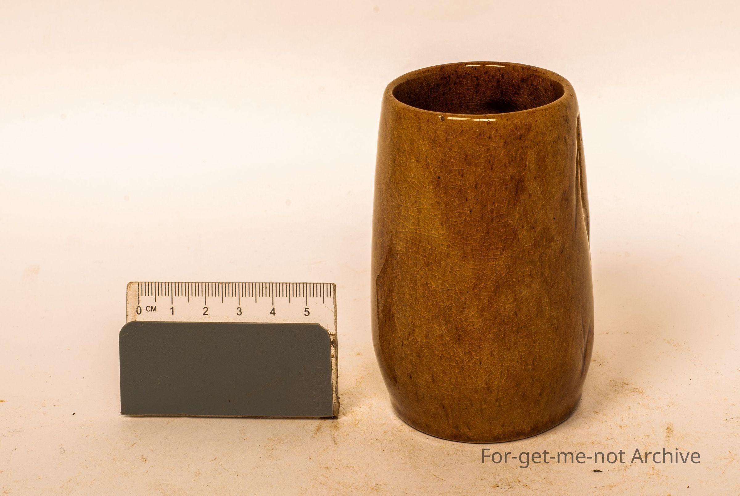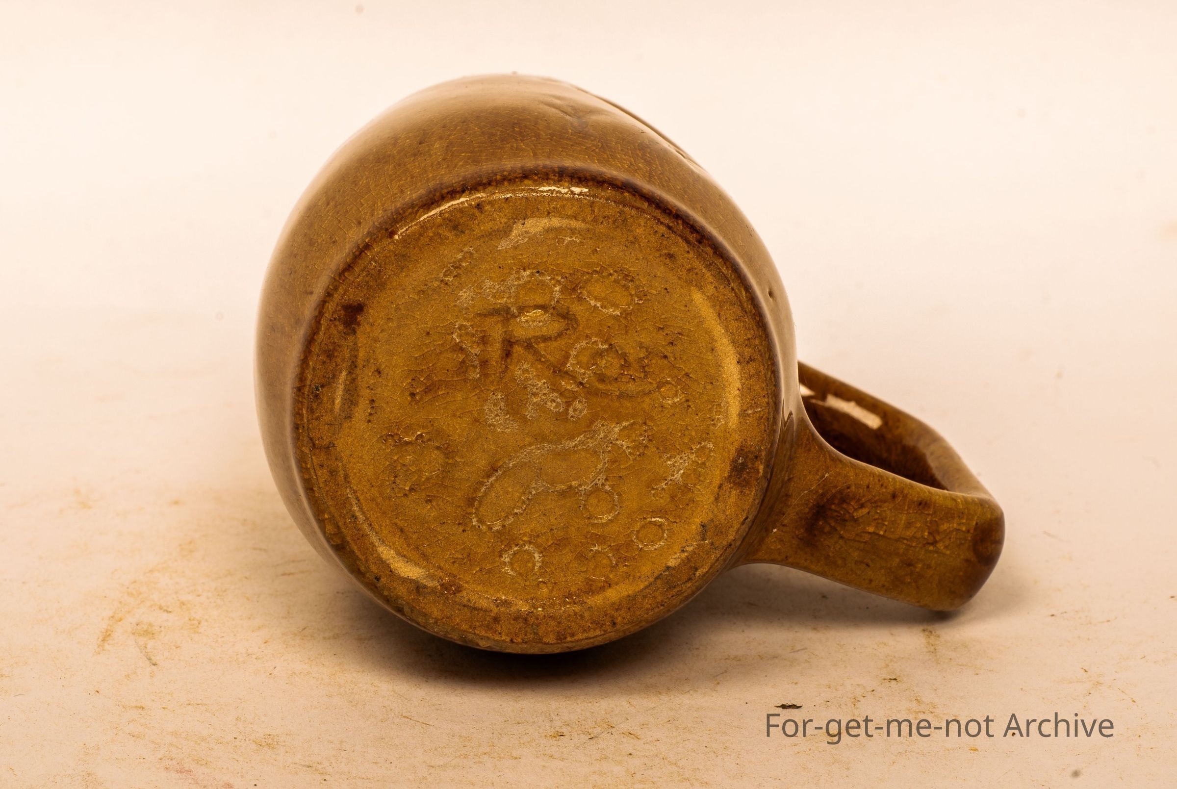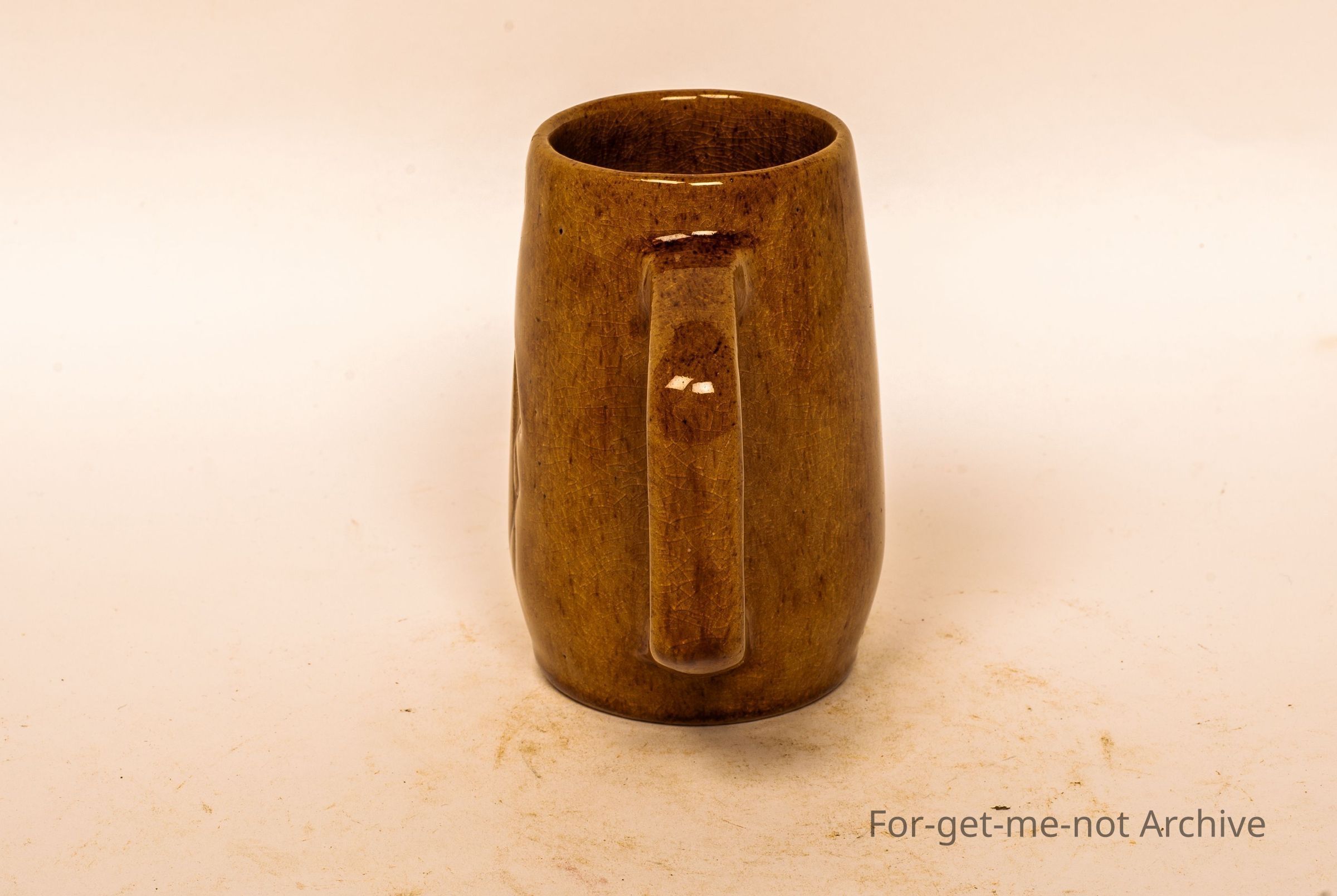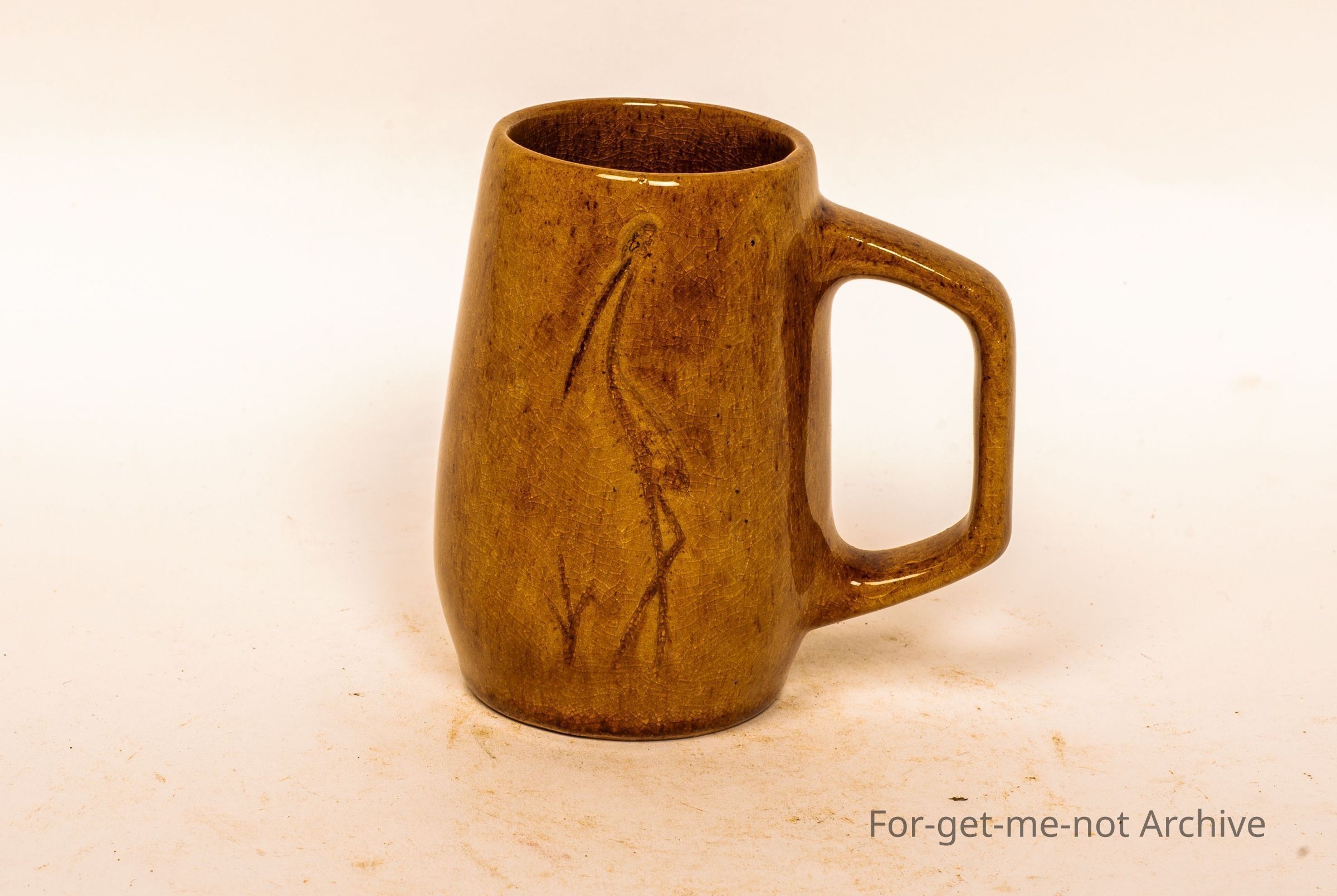 Small cylindrical vase with handle, brown glaze, etched into the image of a bulgar. Signature on the bottom with A elongated R Identification at this stage, unclear.