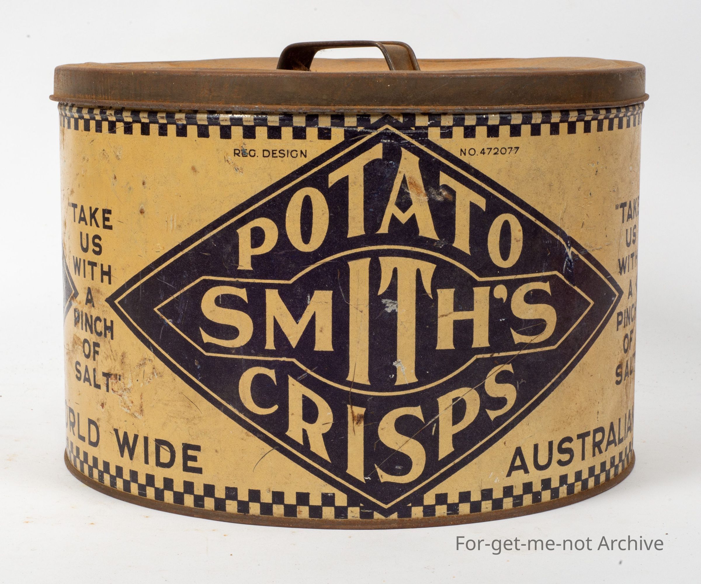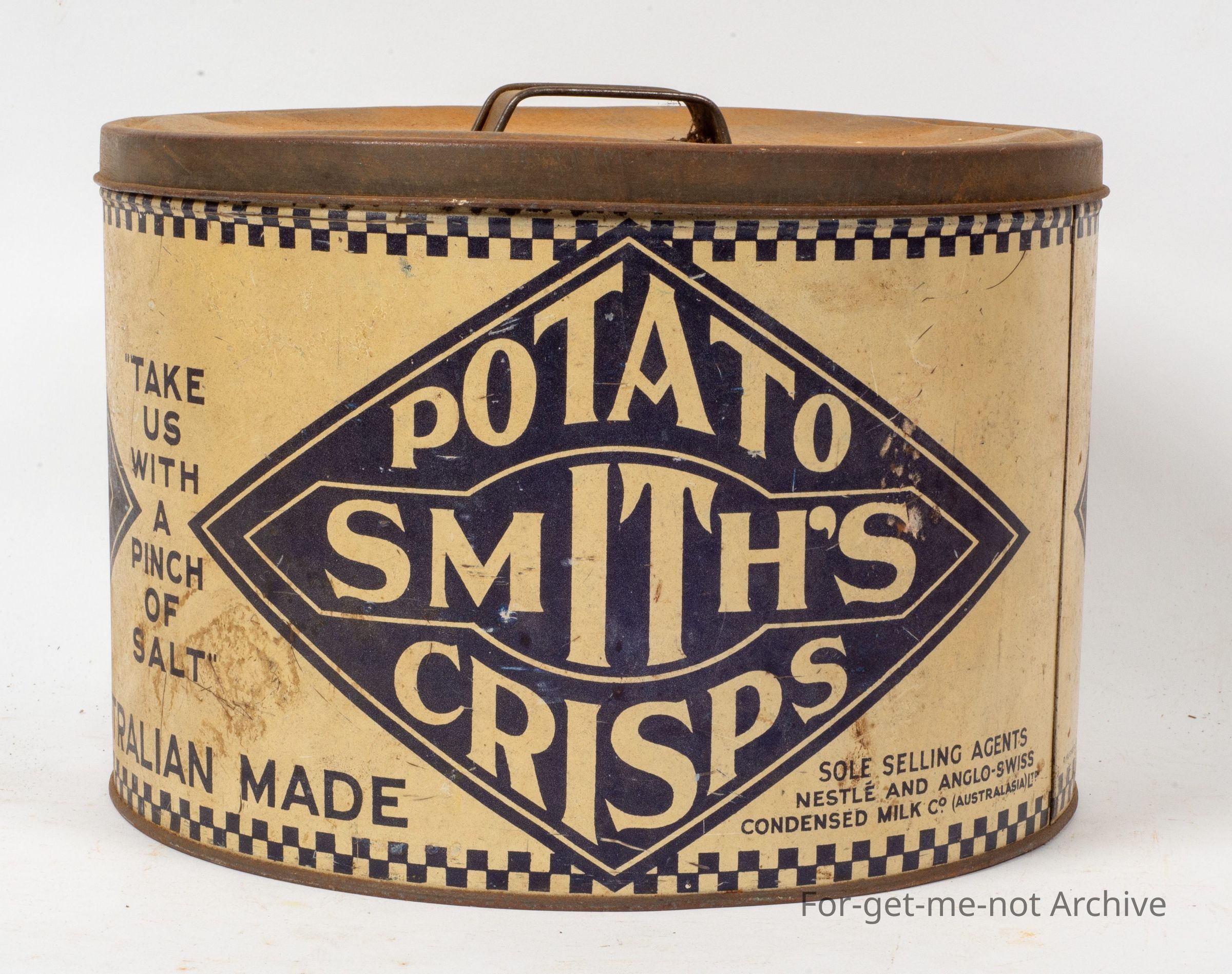 large size smiths potato crisps, very good condition, quite a rate tin, circular in shape, made by Hughes, Sydney