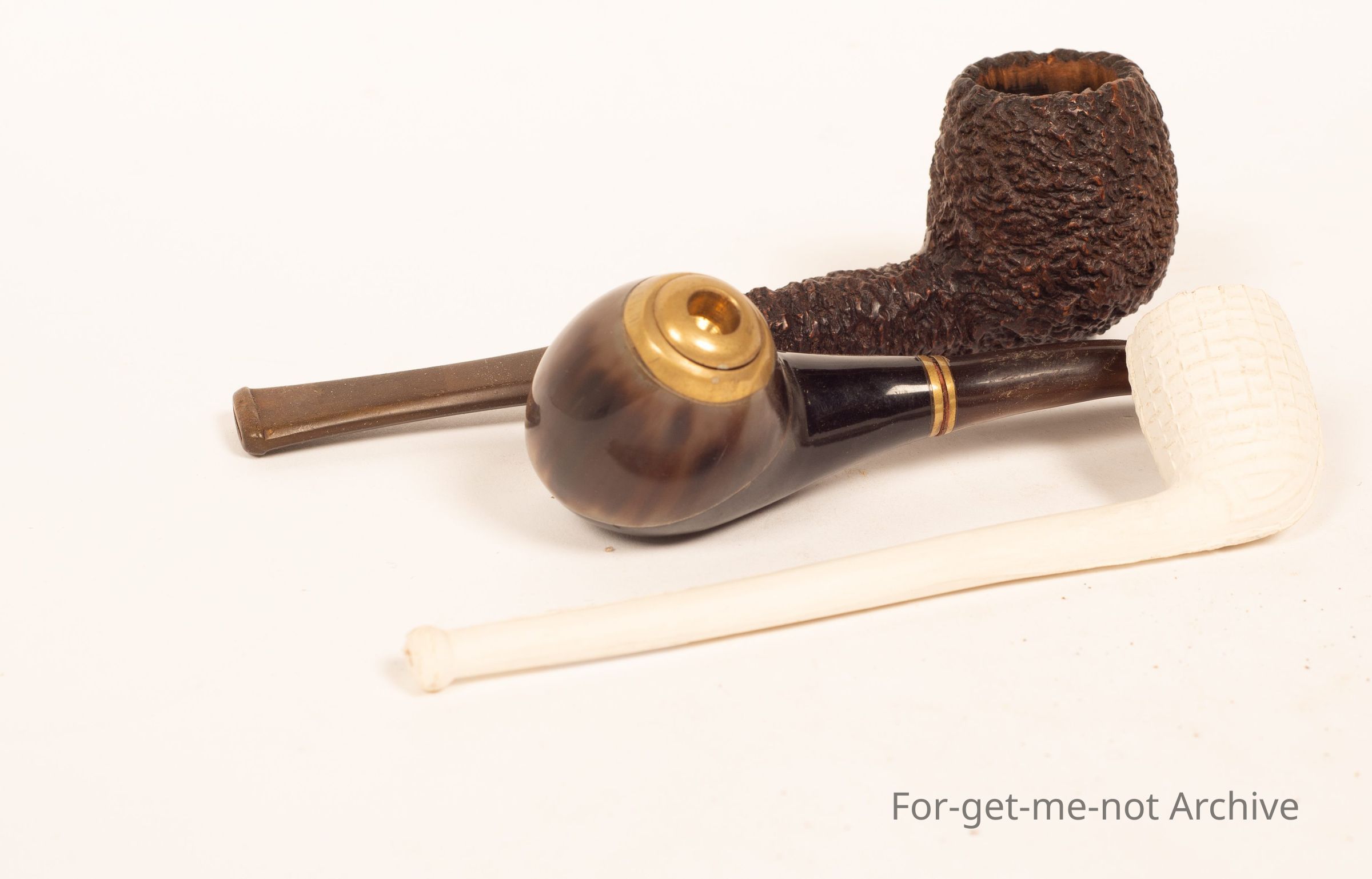 A group of 3 smoking pipes, 1 clay, complete, unbroken. Next one, unknown material, looks plastic, but probably not. The third one is Briarwood, Nothing bad, Nick