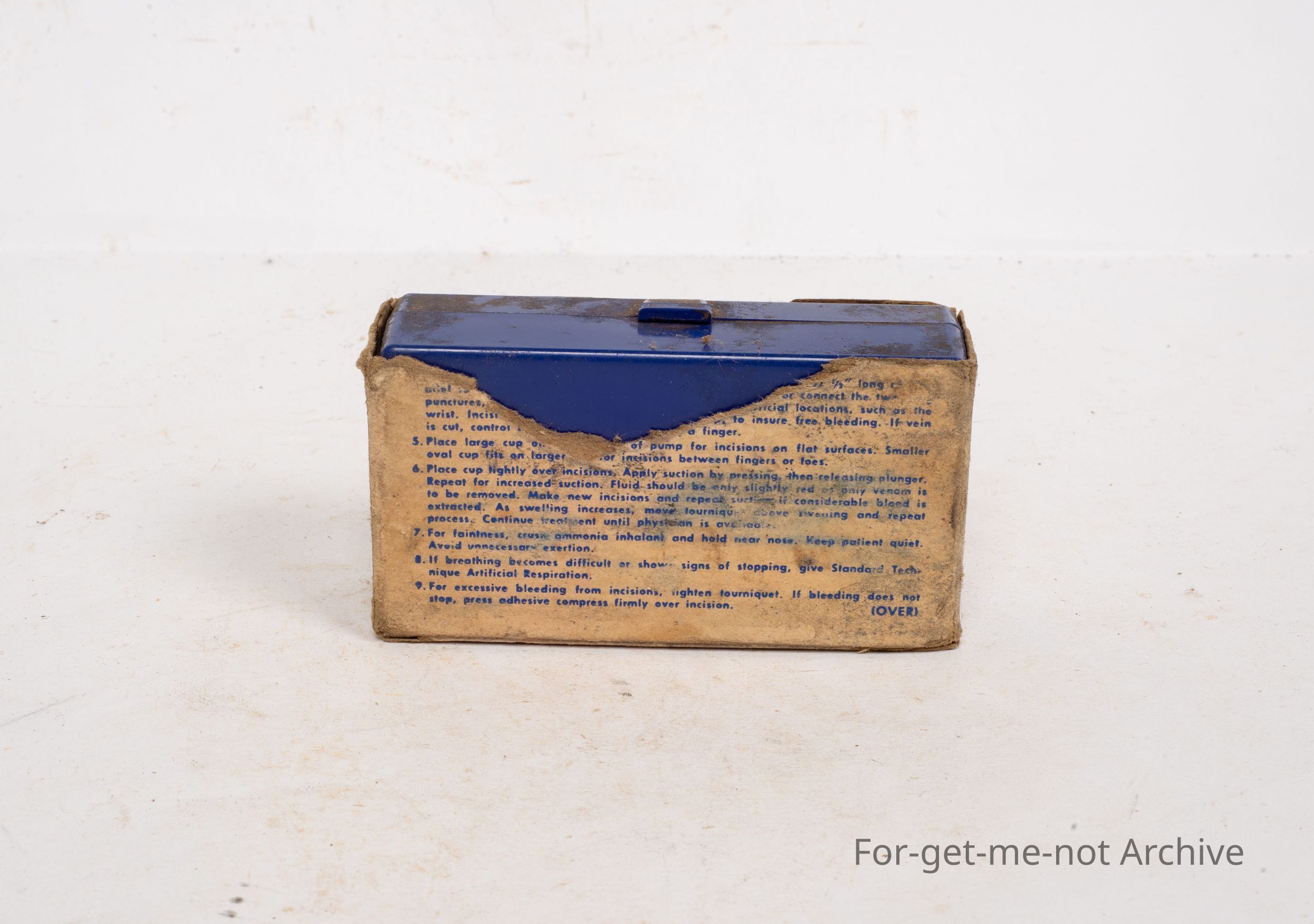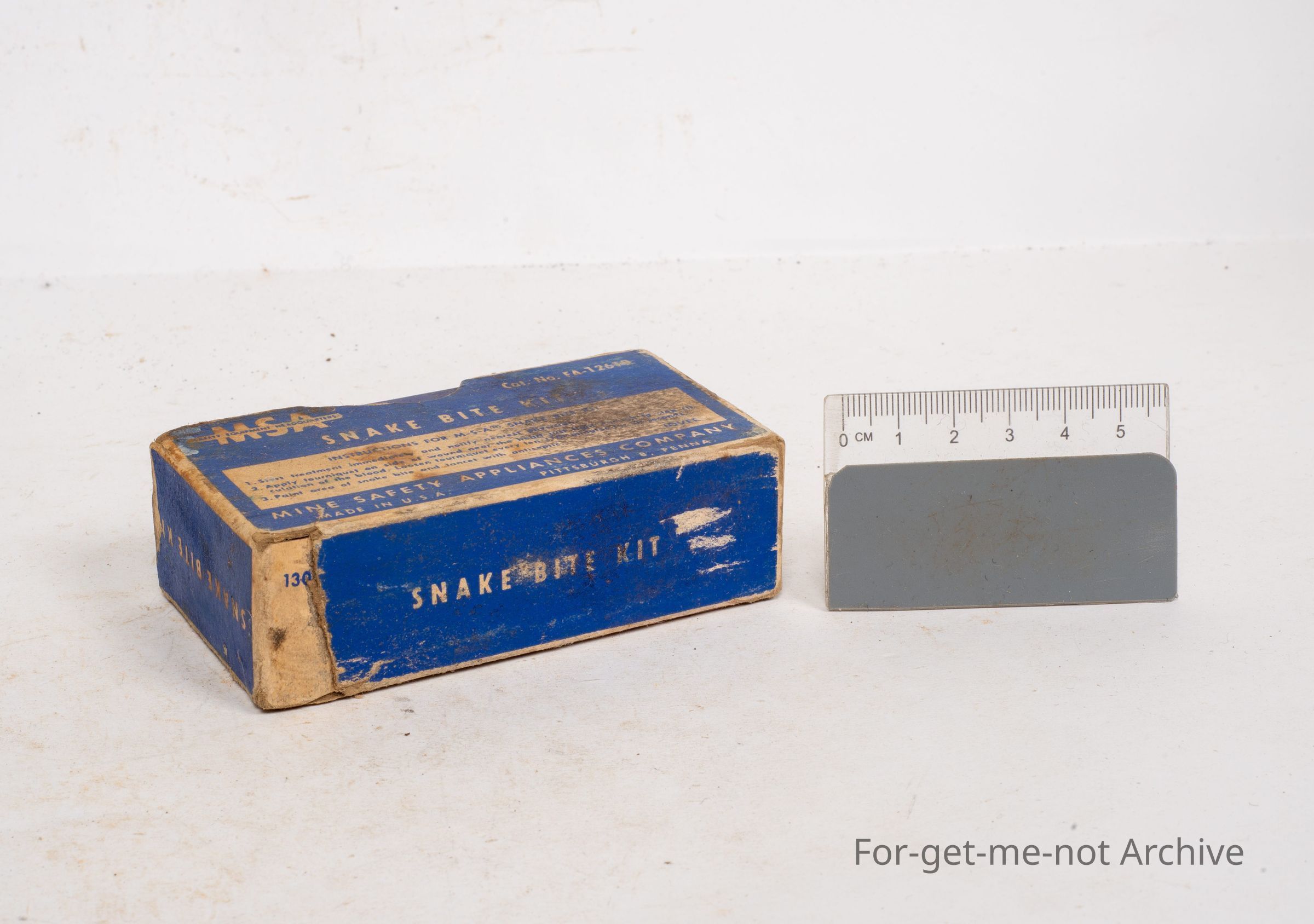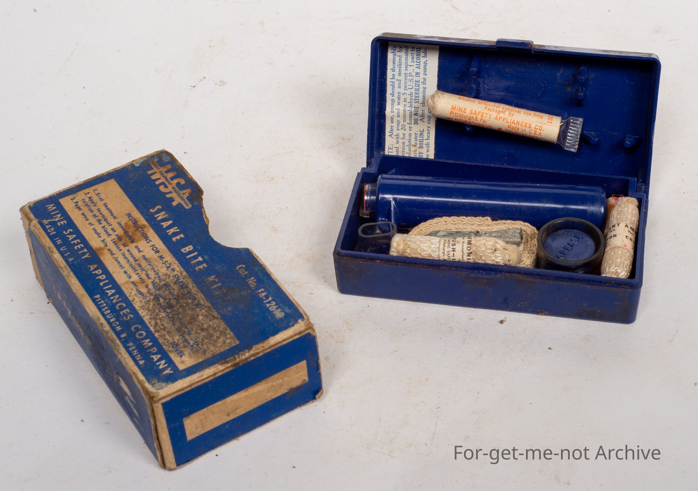 Is a Snakebite Kit made by Mine Safety Appliance Company, Pennsylvania, USA, with instructions. The kit is inside the box, presumably, with all the necessary bits and pieces. This is very unusual because of the fact that it's put out by a mining company, maybe for rattlesnakes.Collection