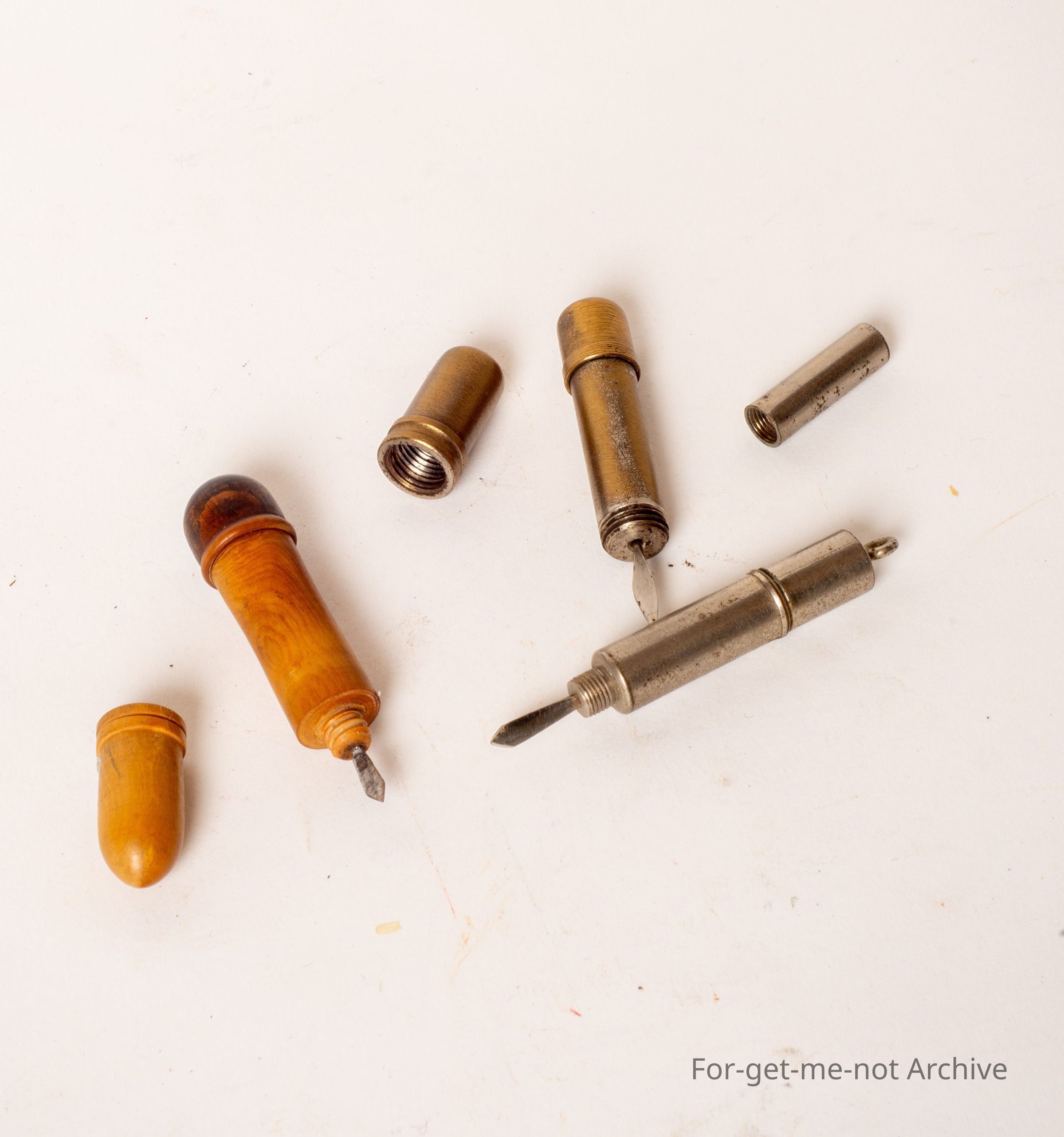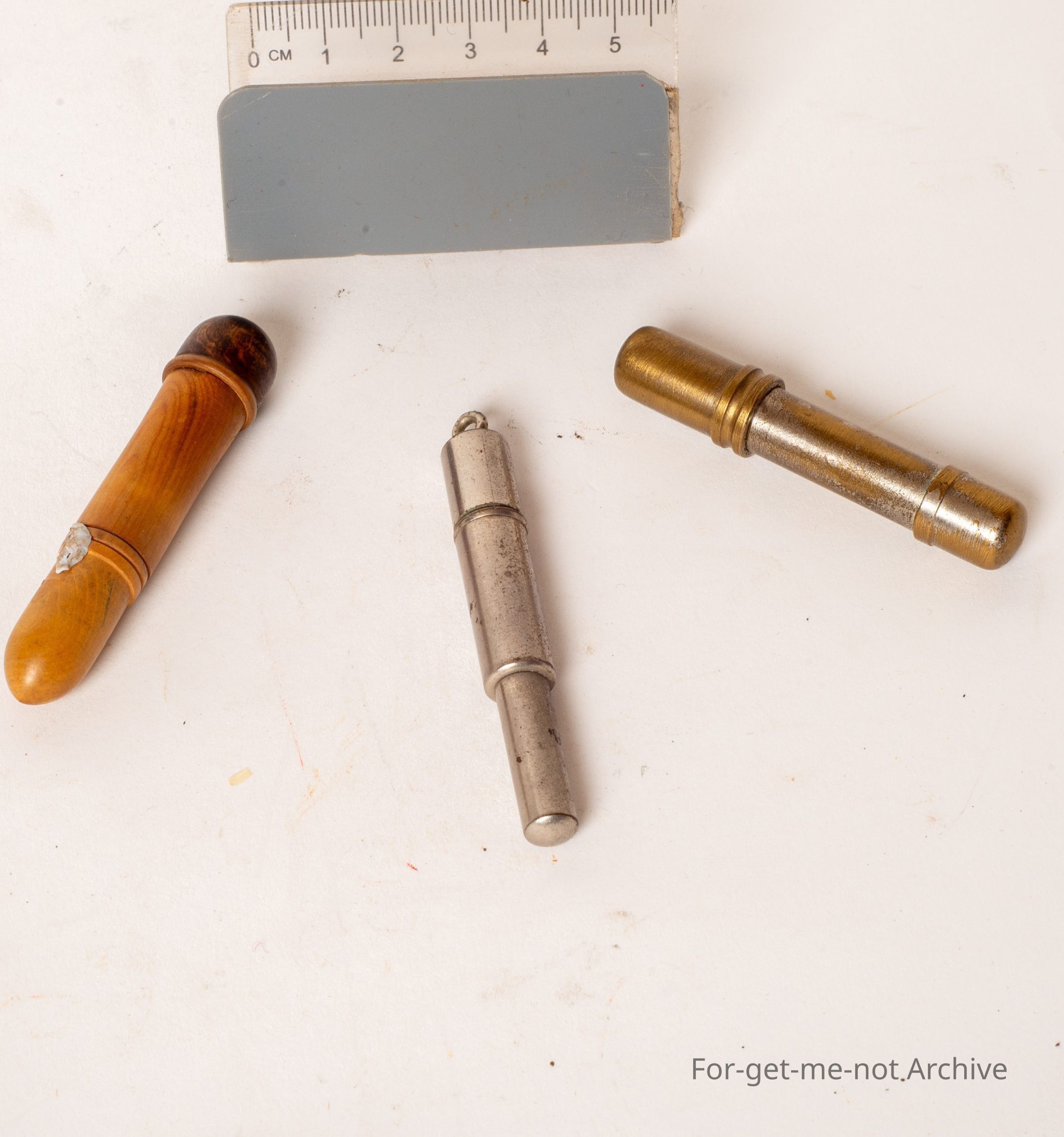 3 snakebite kits, 1 in the common wooden sleeve, the other 2 in metal, all with the little blade and the potassium permanganate pouch in the end.