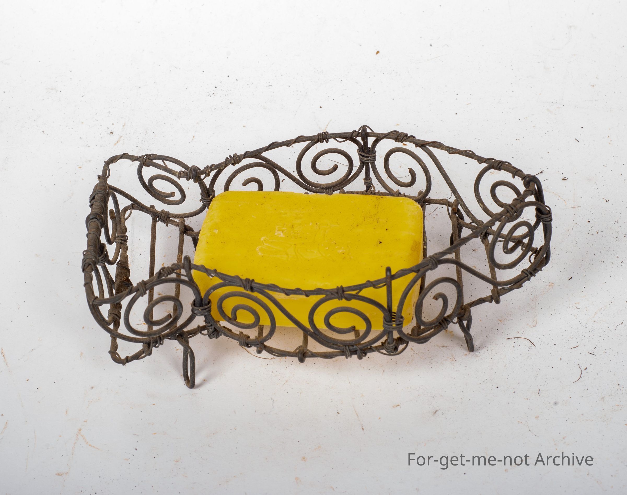 A lovely little wire work made soap container with 4 legs. This is made for sitting on the hand basin or the edge of a tin bath to hold the soap so it drains and doesn't become sodden. This is very decorative.Collection