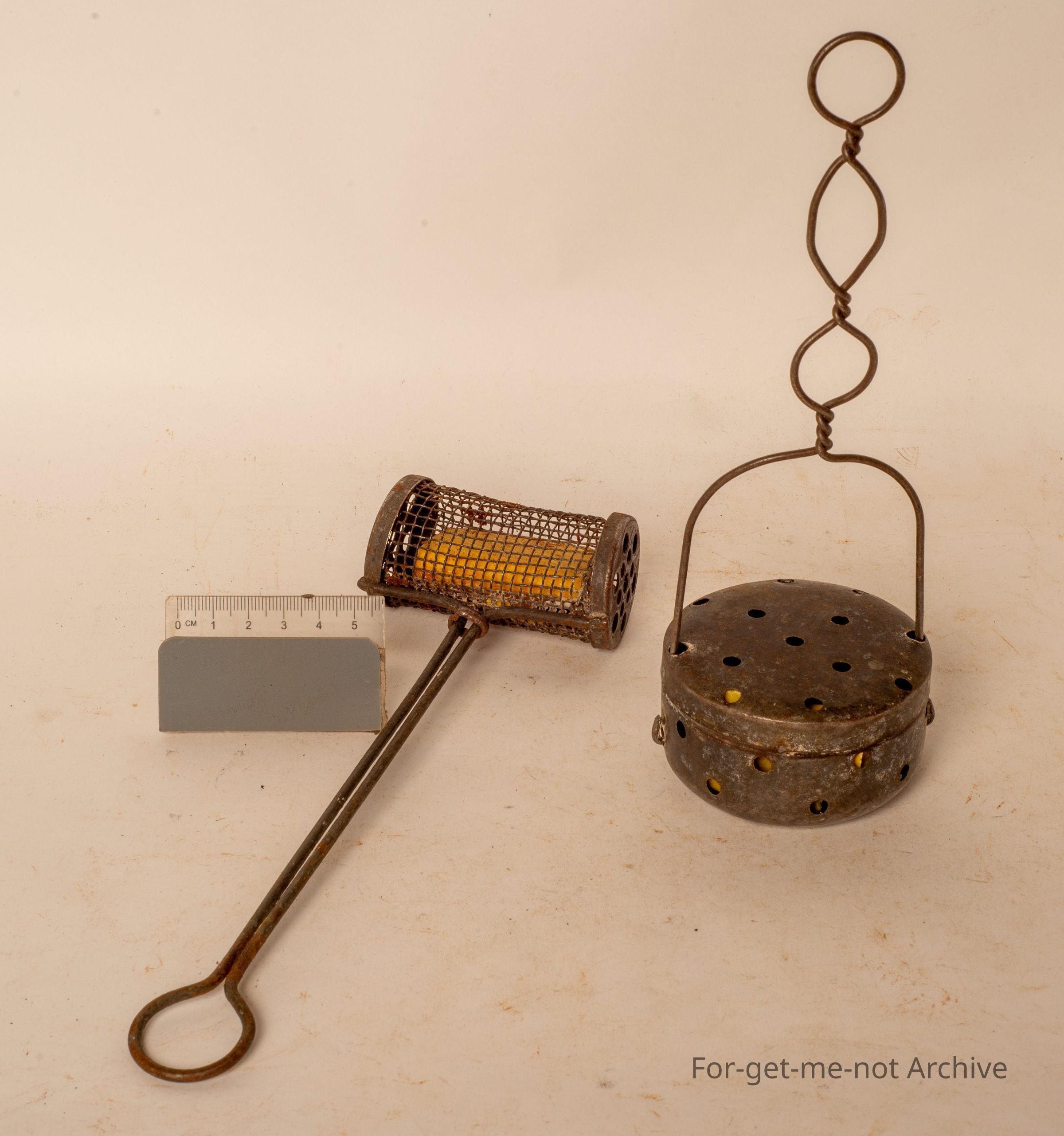 2 more soap savers. 1 a beautiful depression piece made from a tobacco tin, wire work handled. The other one, the handle made of wire. The rest, formed together, built from bitter mesh and 2 perforated metal ends.Collection