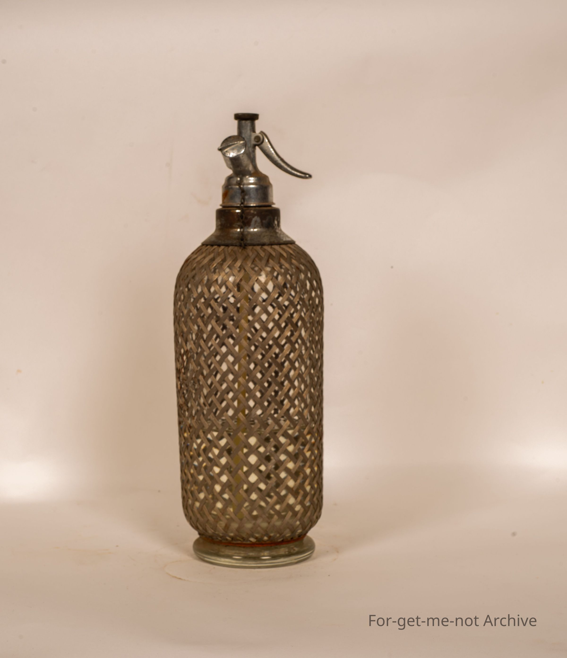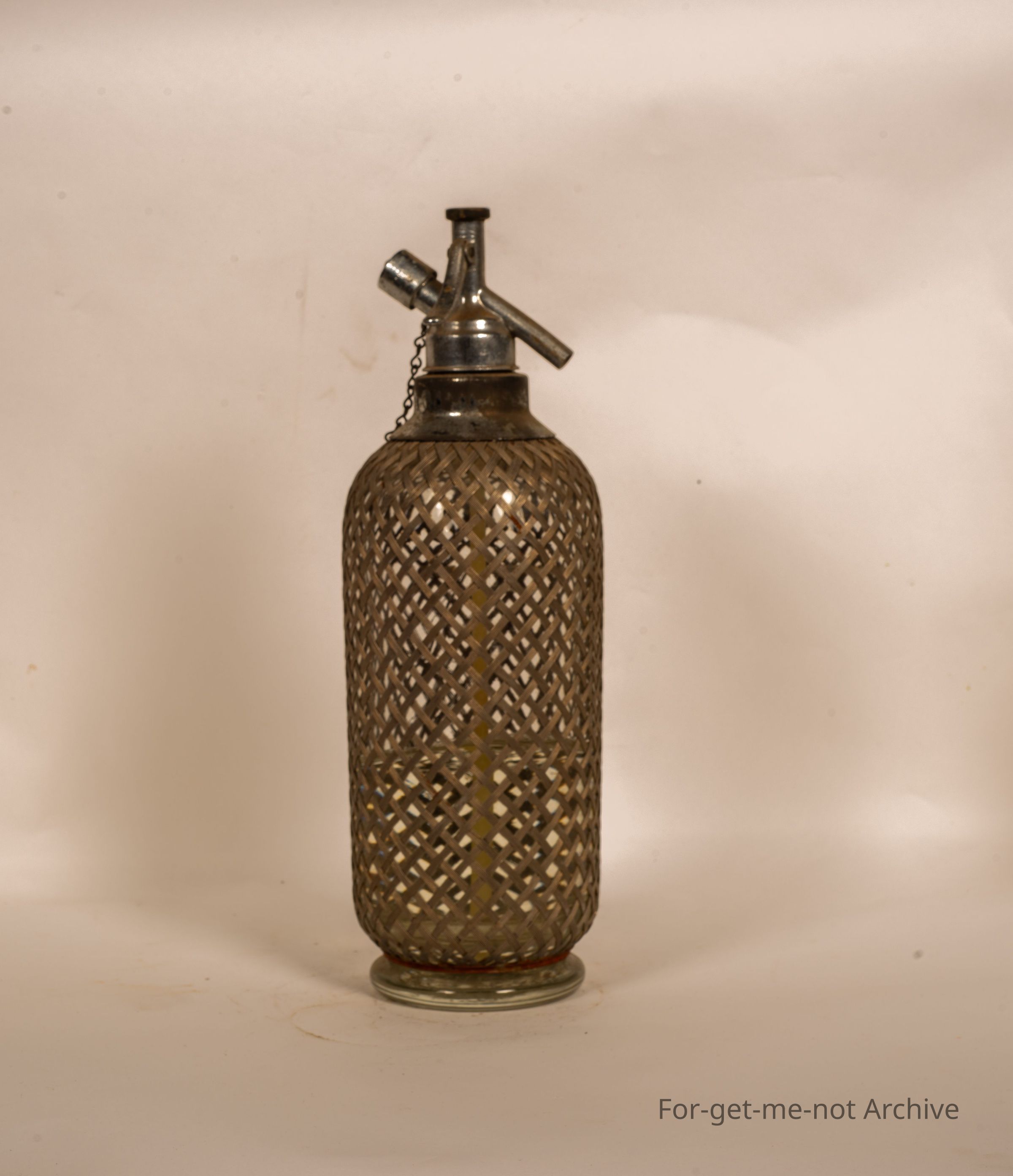 A small glass soda siphon. This one has the safety wire mesh, around the outside, all in good nick.