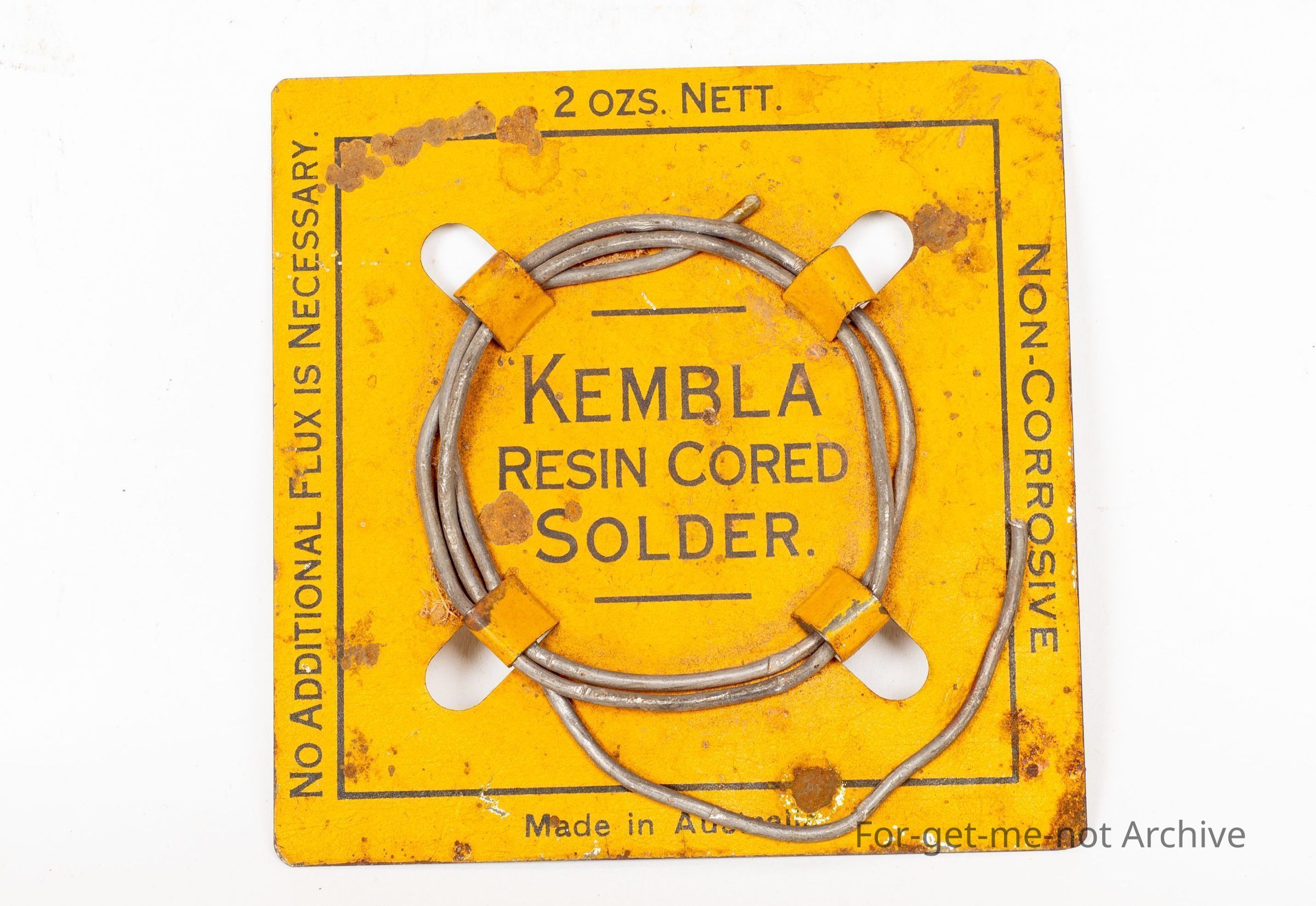 This is a small metal plate with "Kembla" resin cord solder. No additional flux is necessary. 2 ounce weight, non corrosive, made in Australia. Nice little unusual advertising pieceCollection