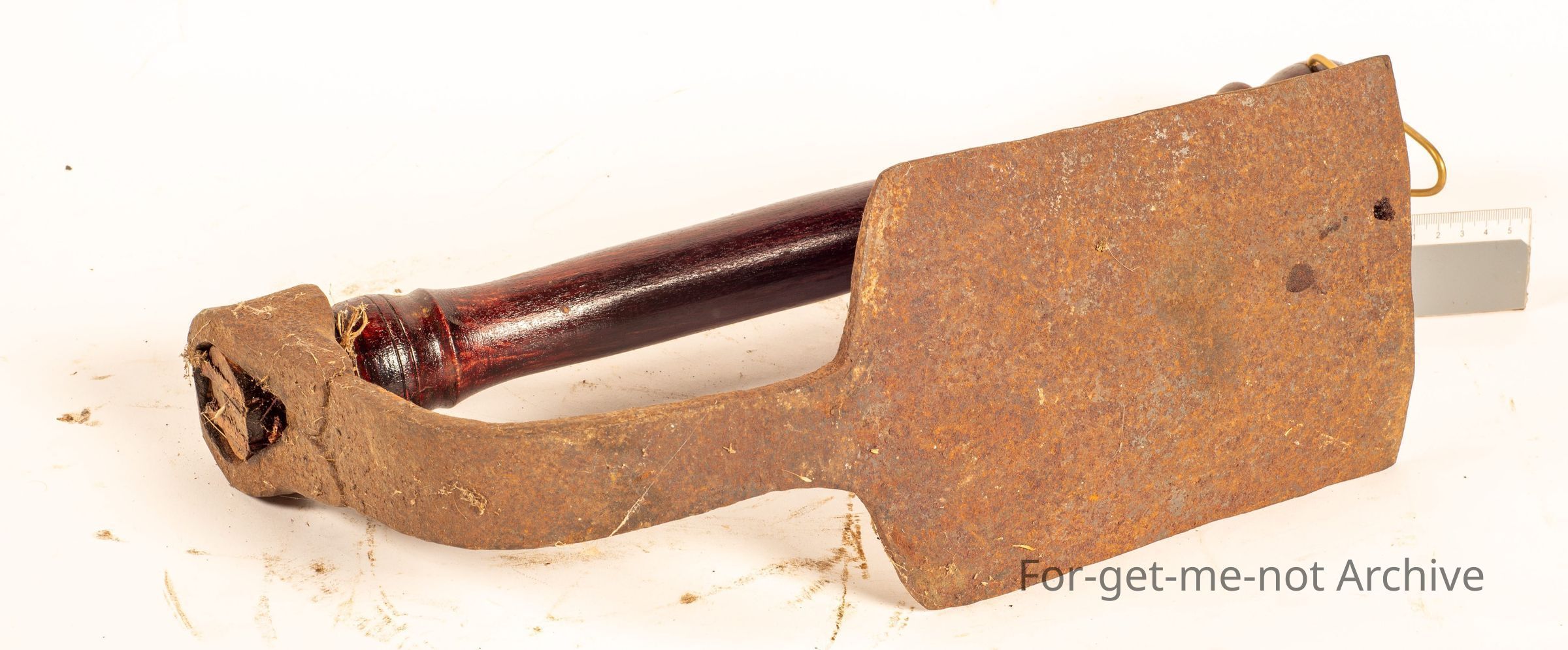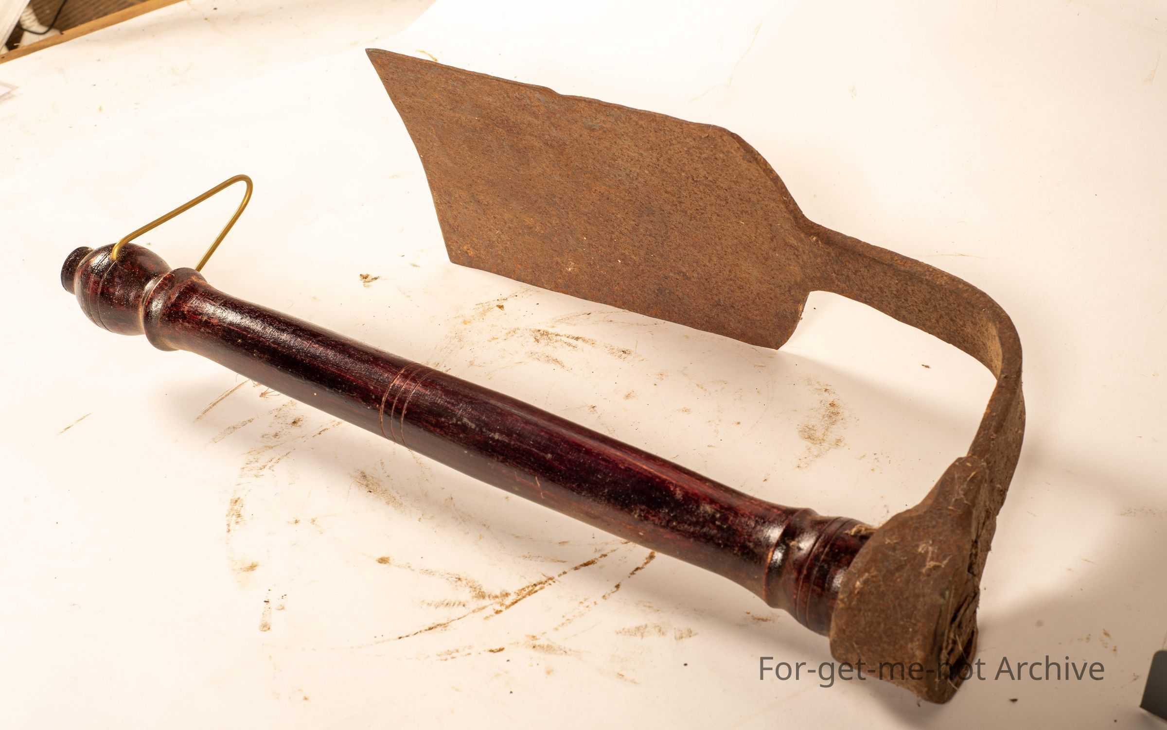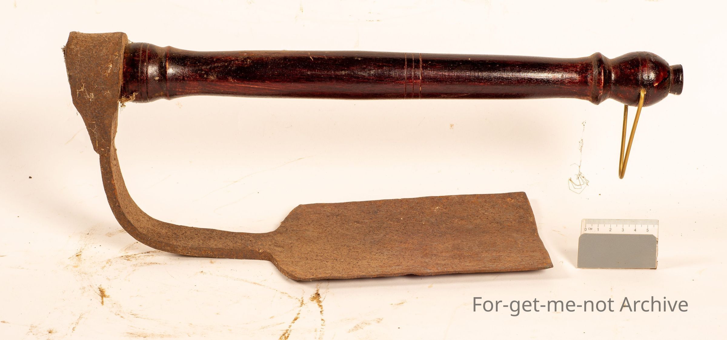 This is the most unusual shape design of a spade that was brought back to Australia from Nepal. Apparently, these are widely used in Nepal for cultivating the ground for vegetable growing. Pretty hard to fathom how they worked effectively. Had a handle put in it, but it's possibly too small.Collection