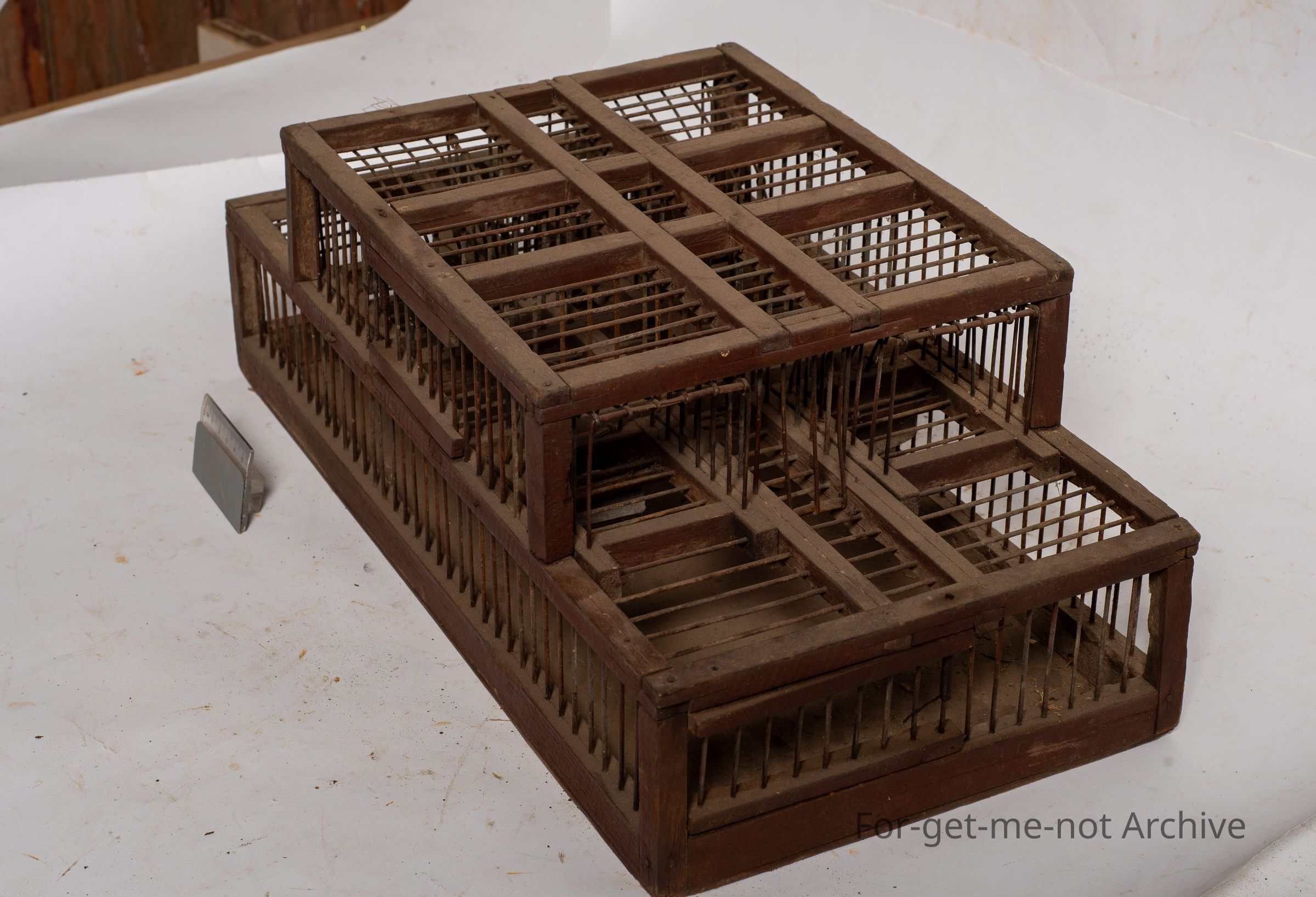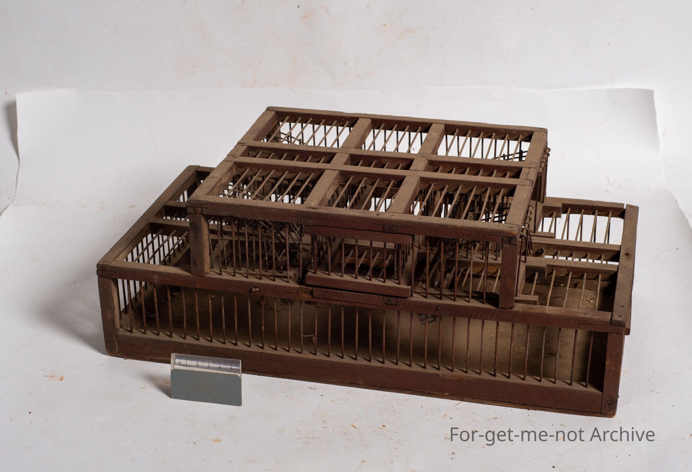 This is a very cleverly made, sparrow trap, bird trap. It has tilt floors in 4 catching positions. Grain is put in the in the ground on the, tray in the floor, which attracts the birds when they land on the tray, it tilts over and tips them into the cage. Clever piece, probably frowned upon today.Collection