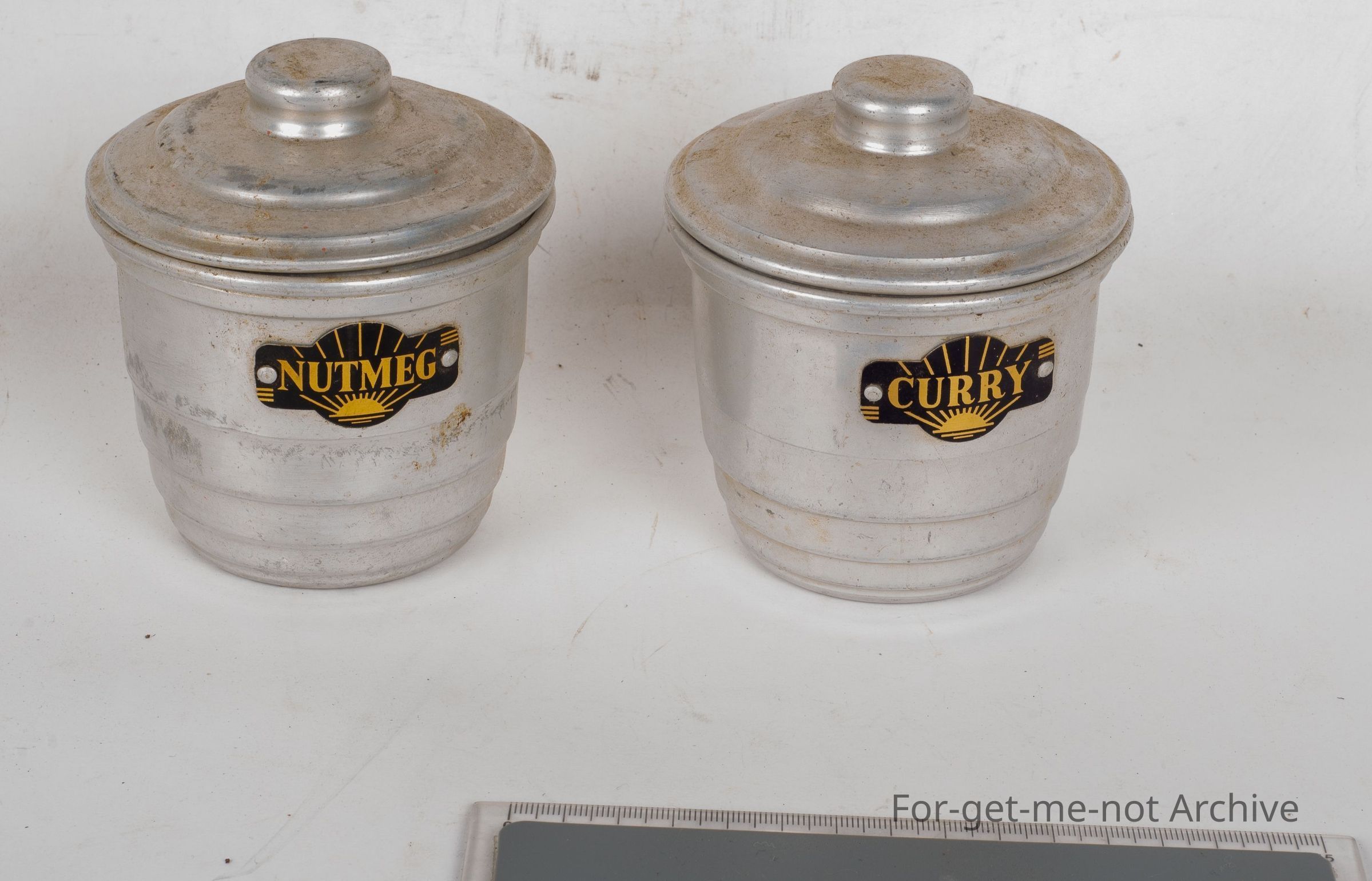 Two small aluminium spice canisters, nutmeg and curry