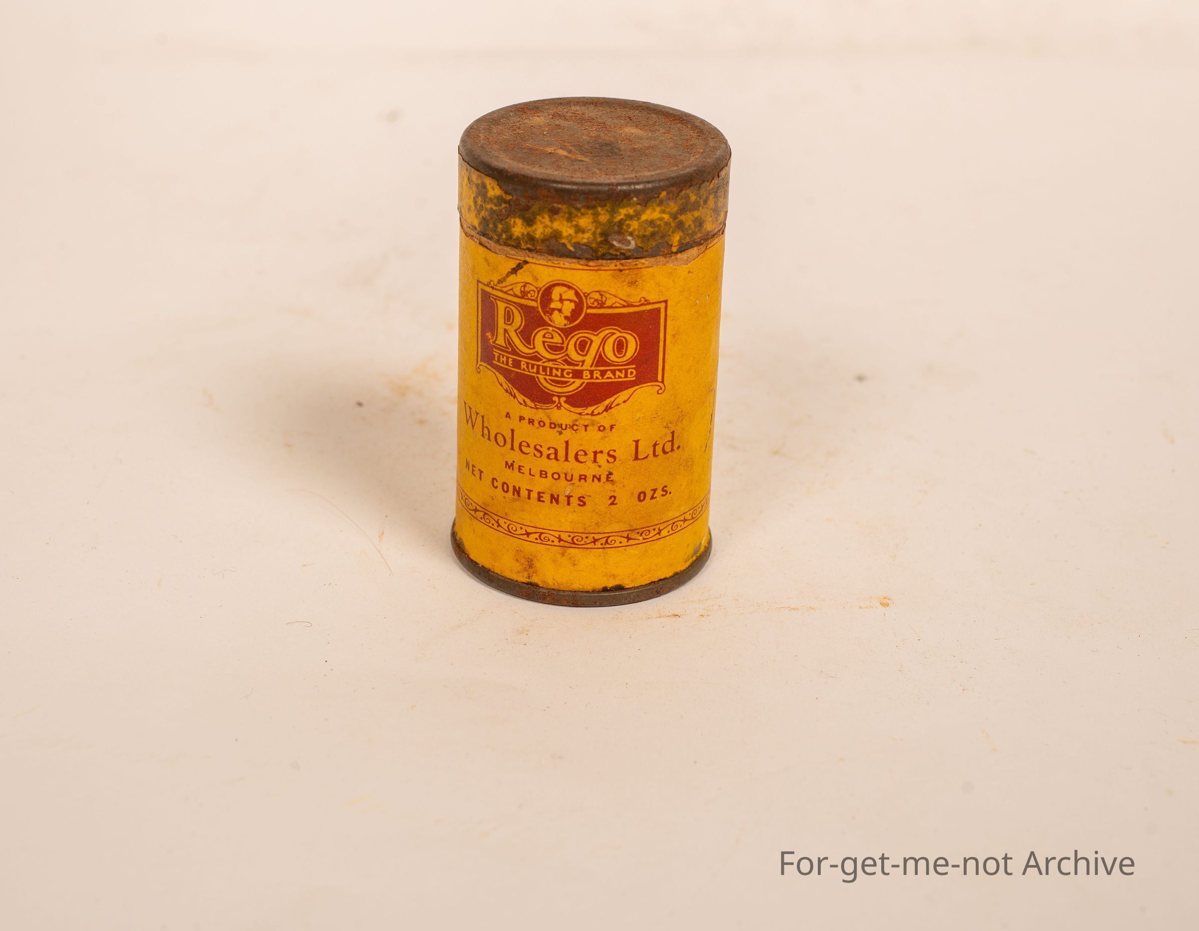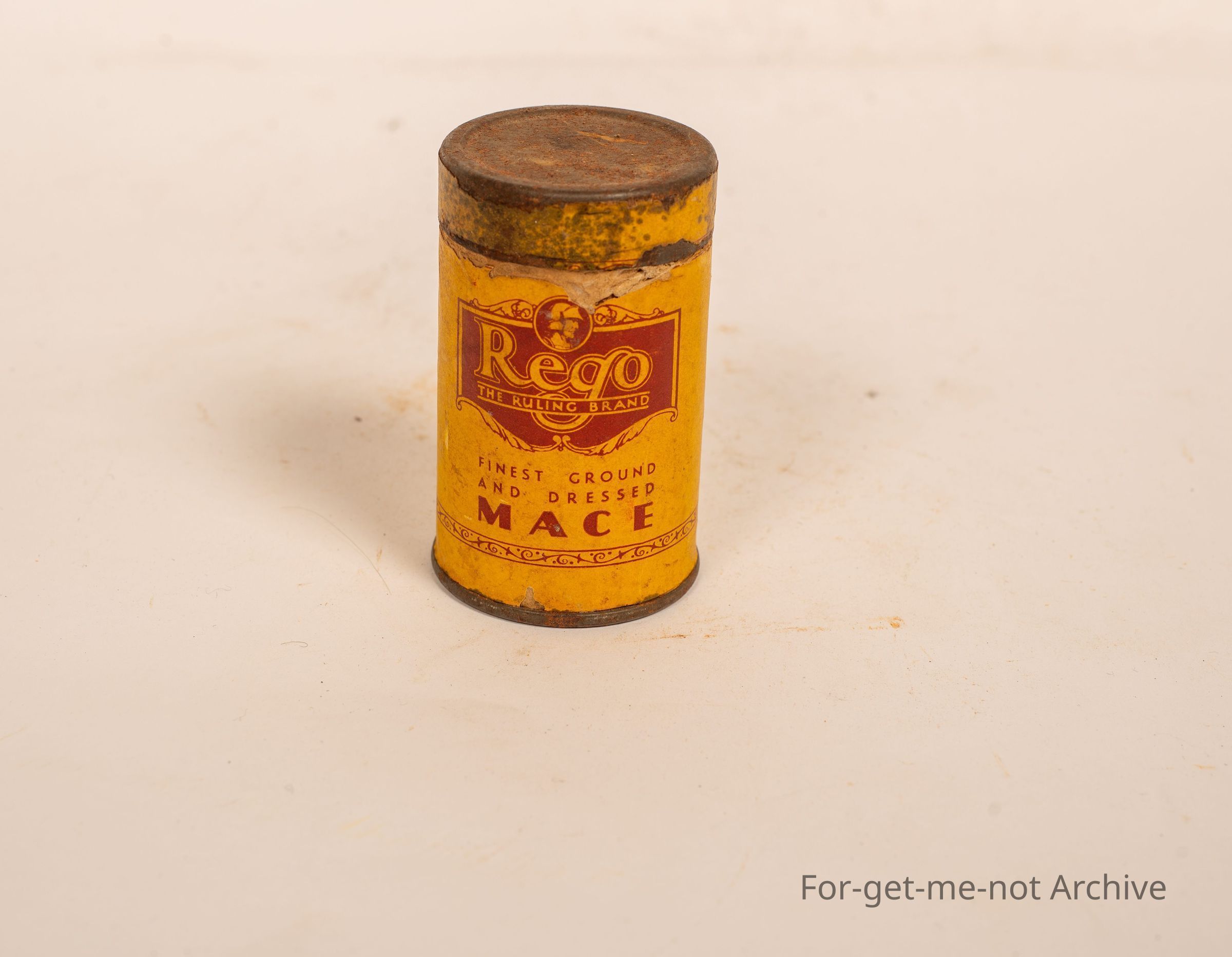 A tin of rego, the ruling brand finest ground and dressed Mace. Paper label, value 2 ounce tin.