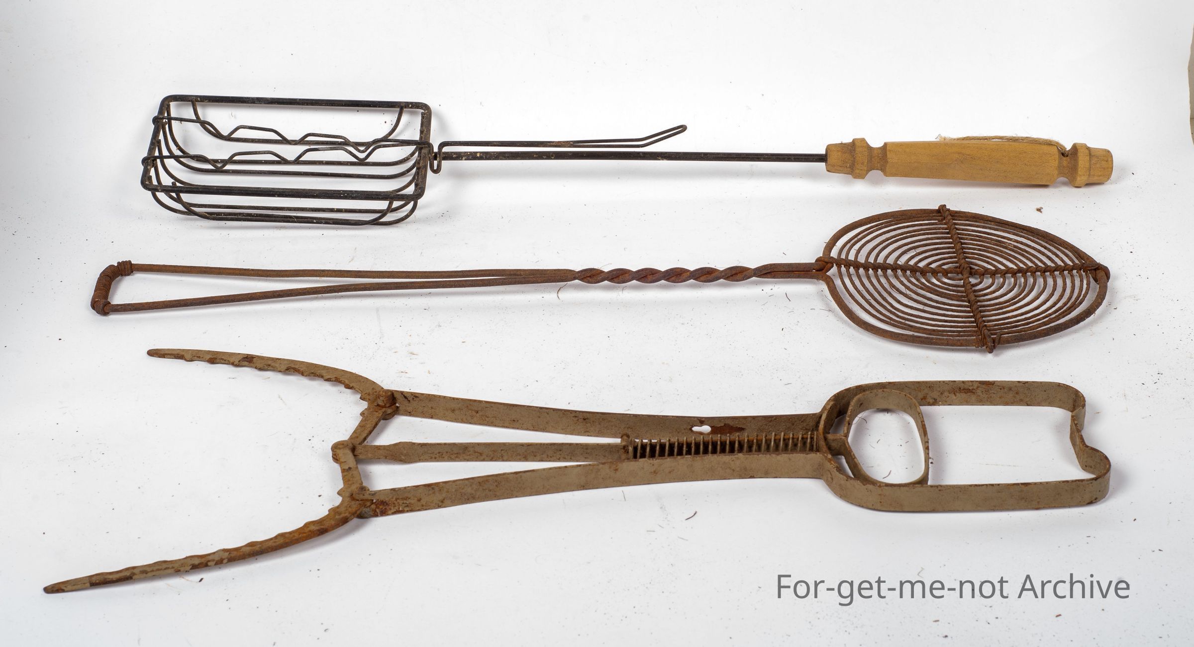A group of 3 different kitchen pieces. 1, a spring loaded grabber. The other one, for holding, it cuts a clamp over the top for holding something in when perhaps cooking. The third one is like a strainer type thing of perhaps cooking over a fireplace.Collection