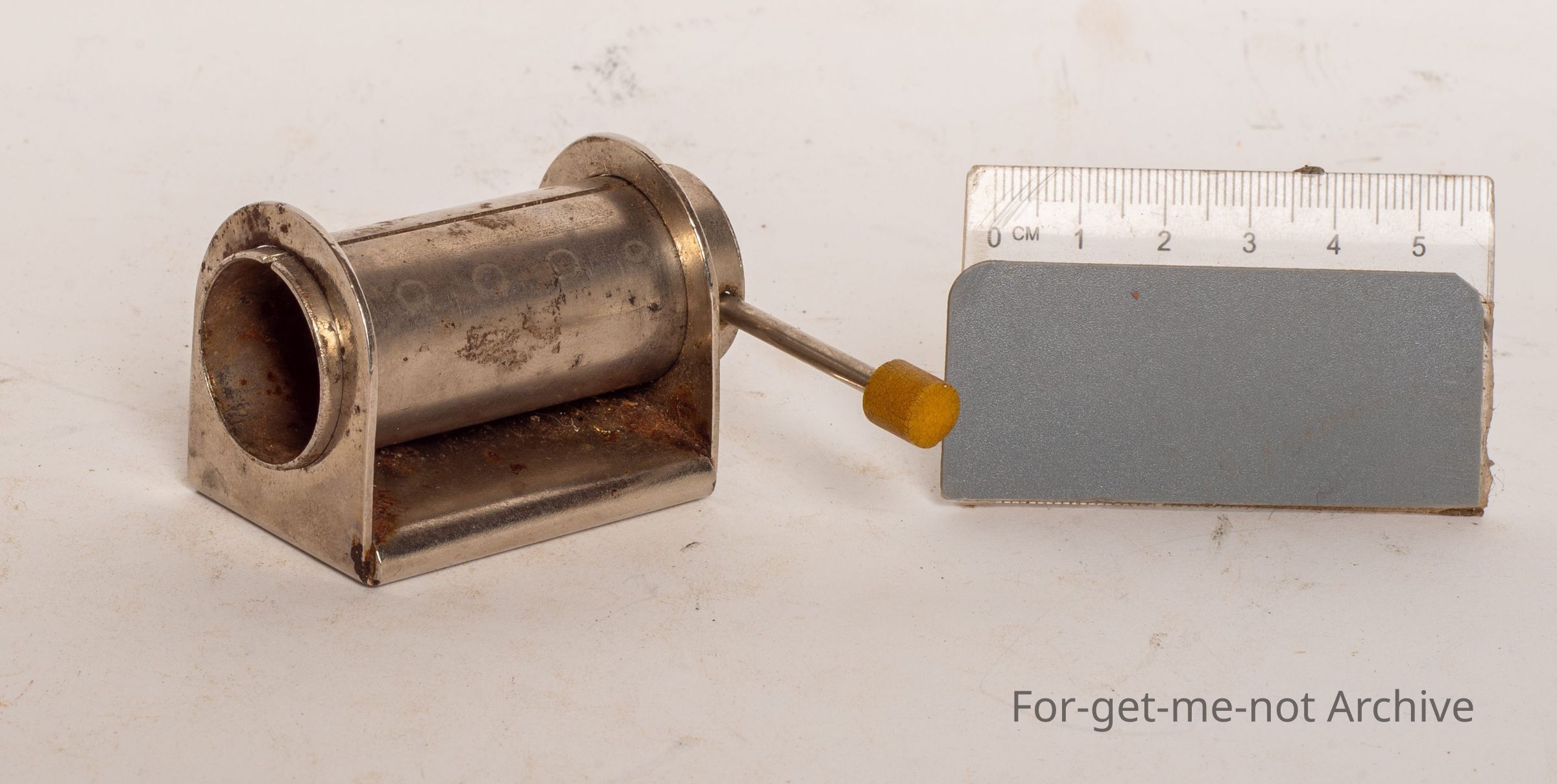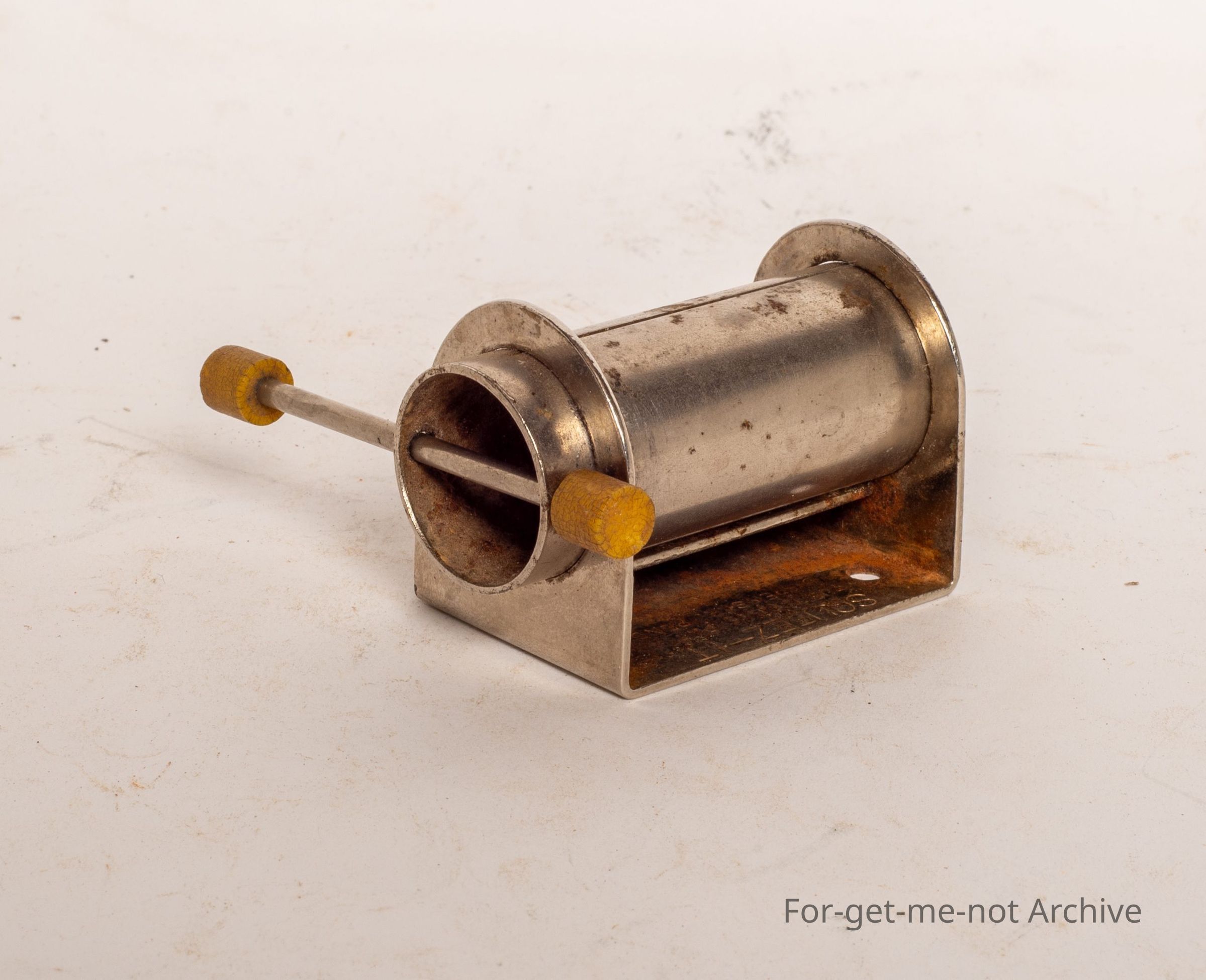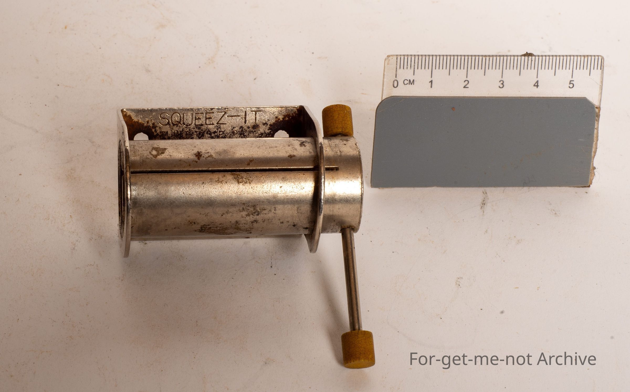 This is a little metal contraption called Squeeze It. You put the end of the toothpaste tube in underneath, turn the handle and it squeezes the last drop out of the out of the tube. Bit of a novelty thing. Only one I've ever seen.Collection