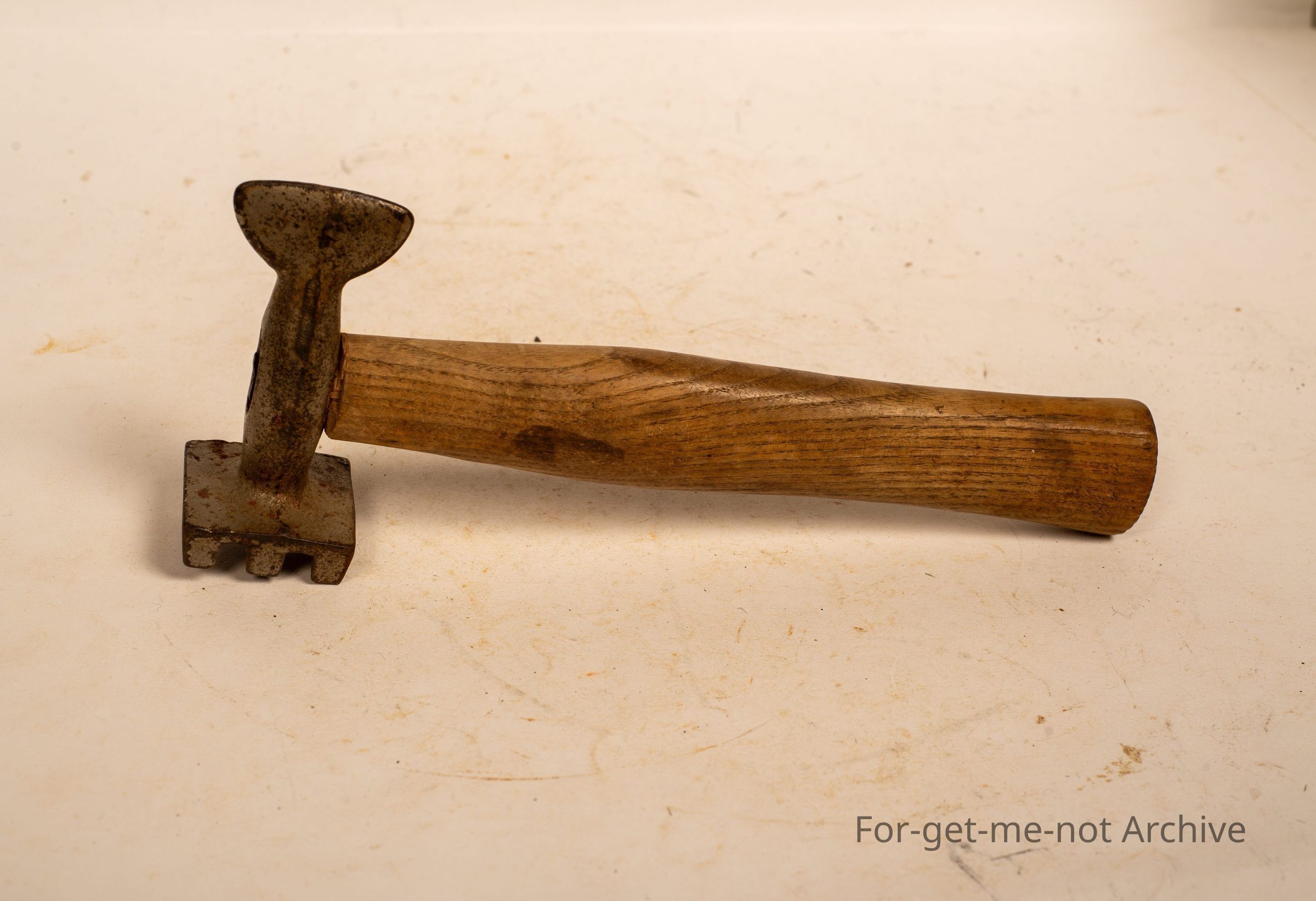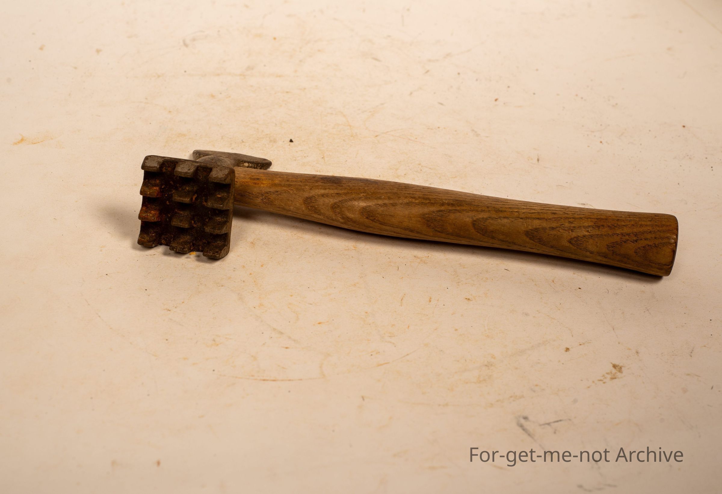 A wooden handled, steak tenderizer. No names in very little use condition.