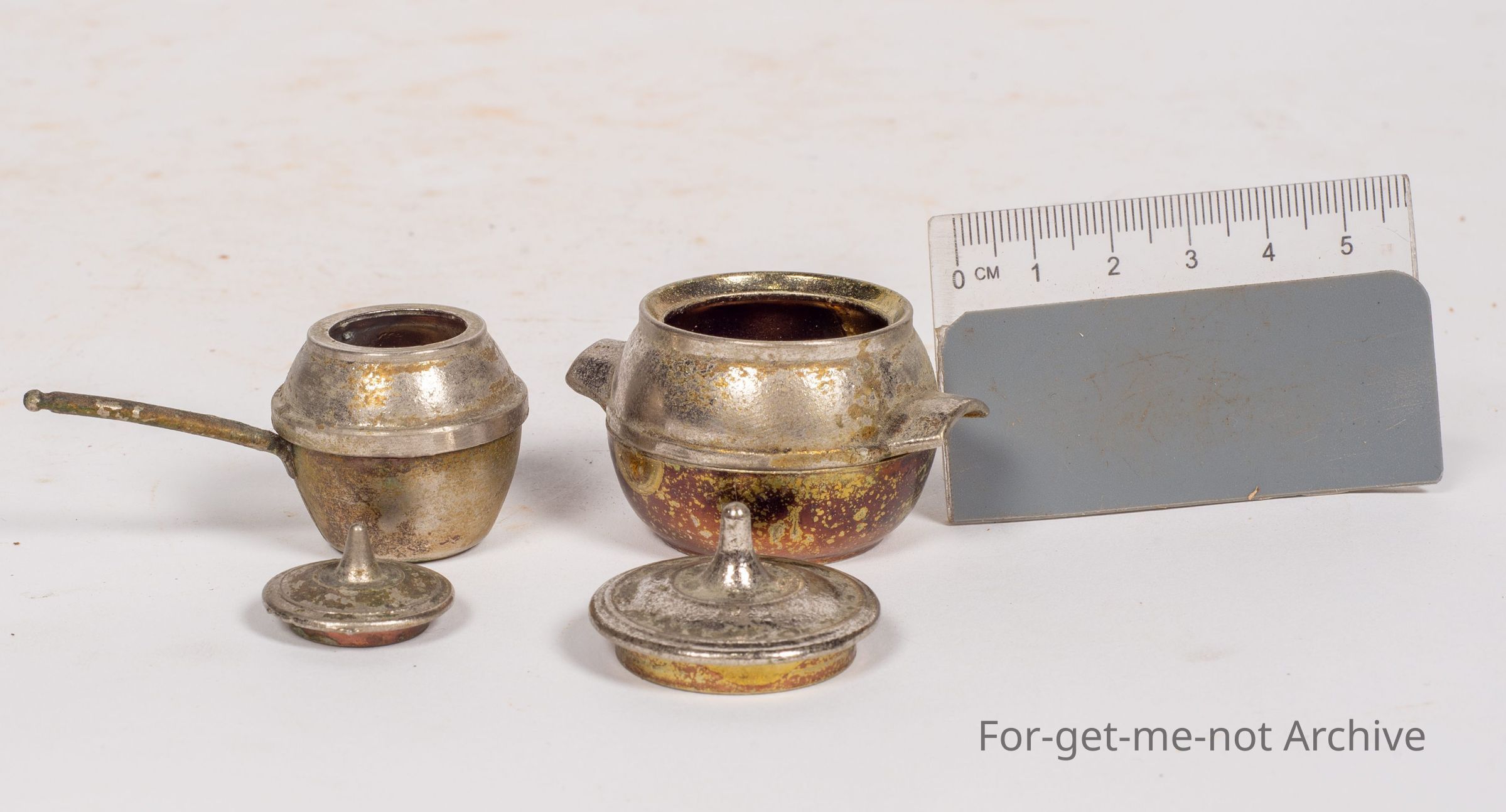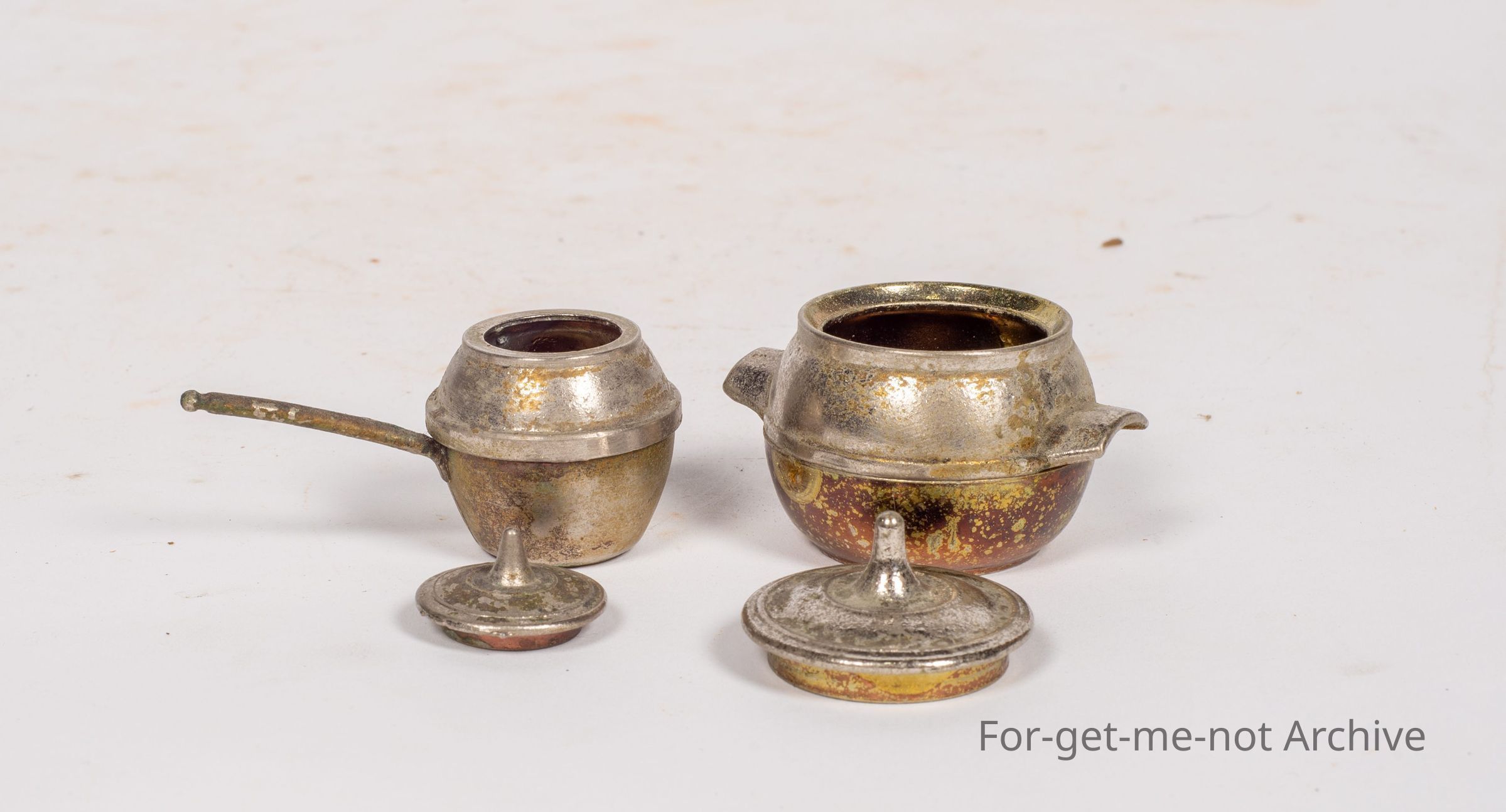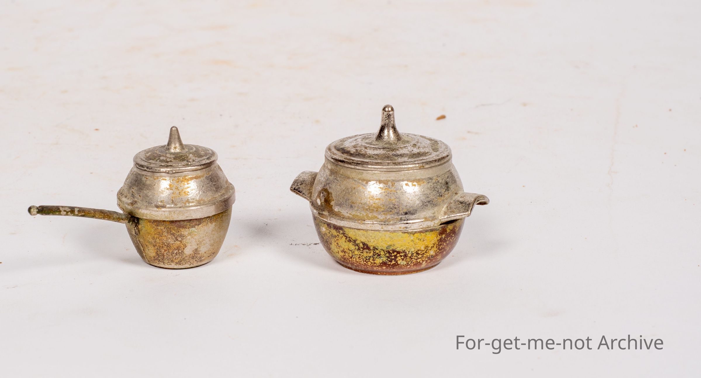 Monture pots x 2 little pots. 1 with a both with lids, one with handles on either side, like a cauldron, the other one with a long, slender handle, but both beautifully made, priceCollection