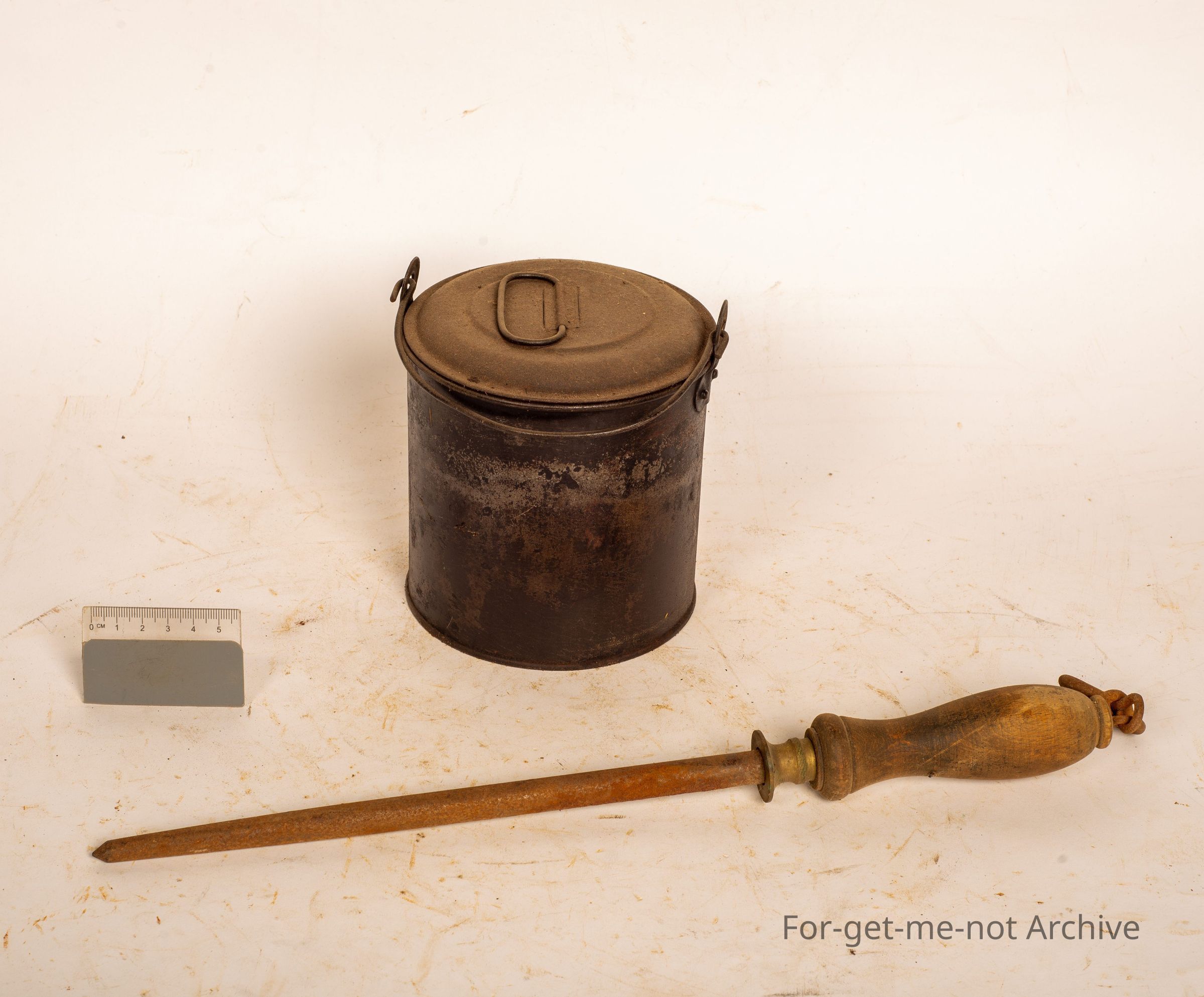 This is a wooden handled steel, probably in reasonable condition. And a little, billy that would have been a tea making billy on a bush camp scene,