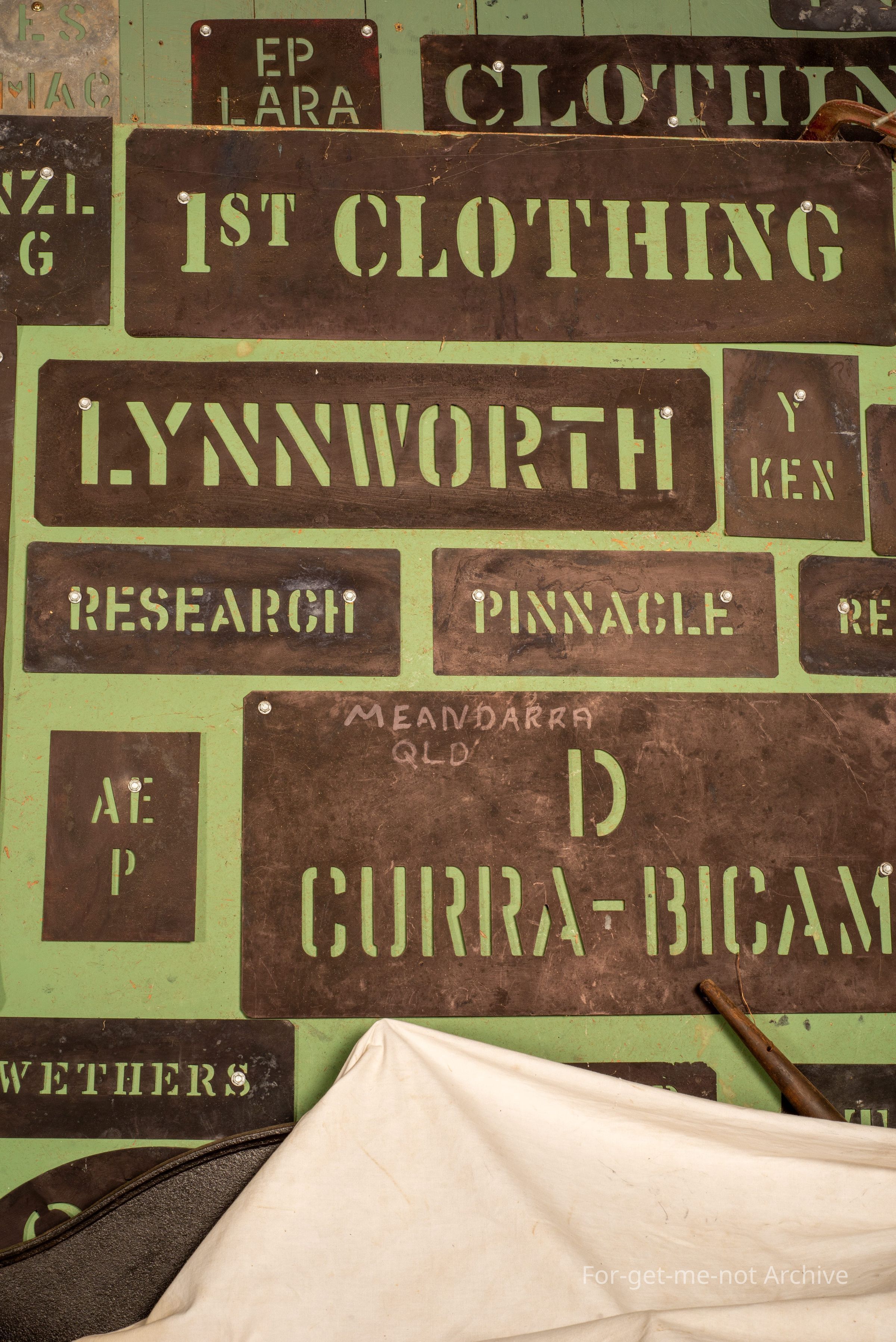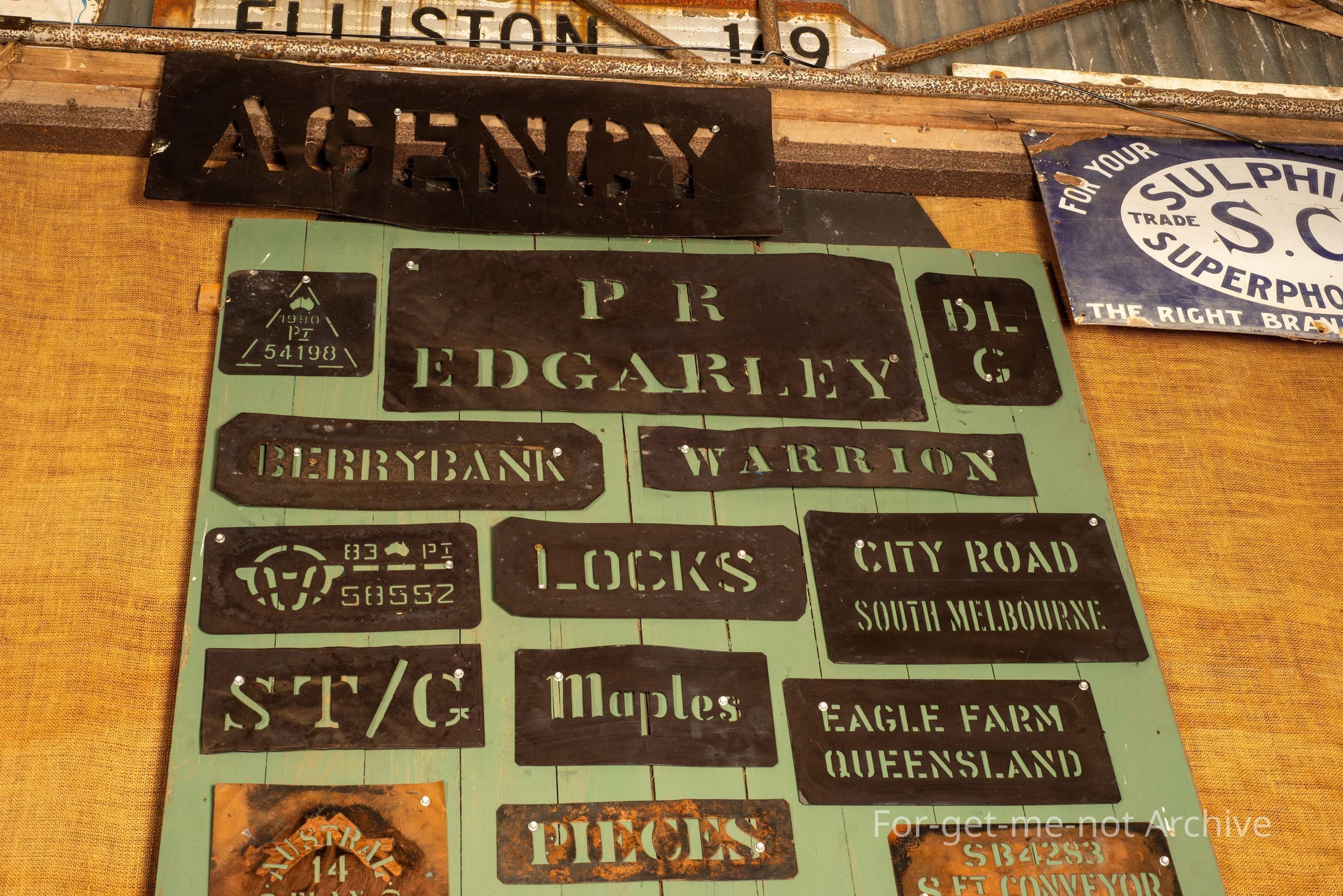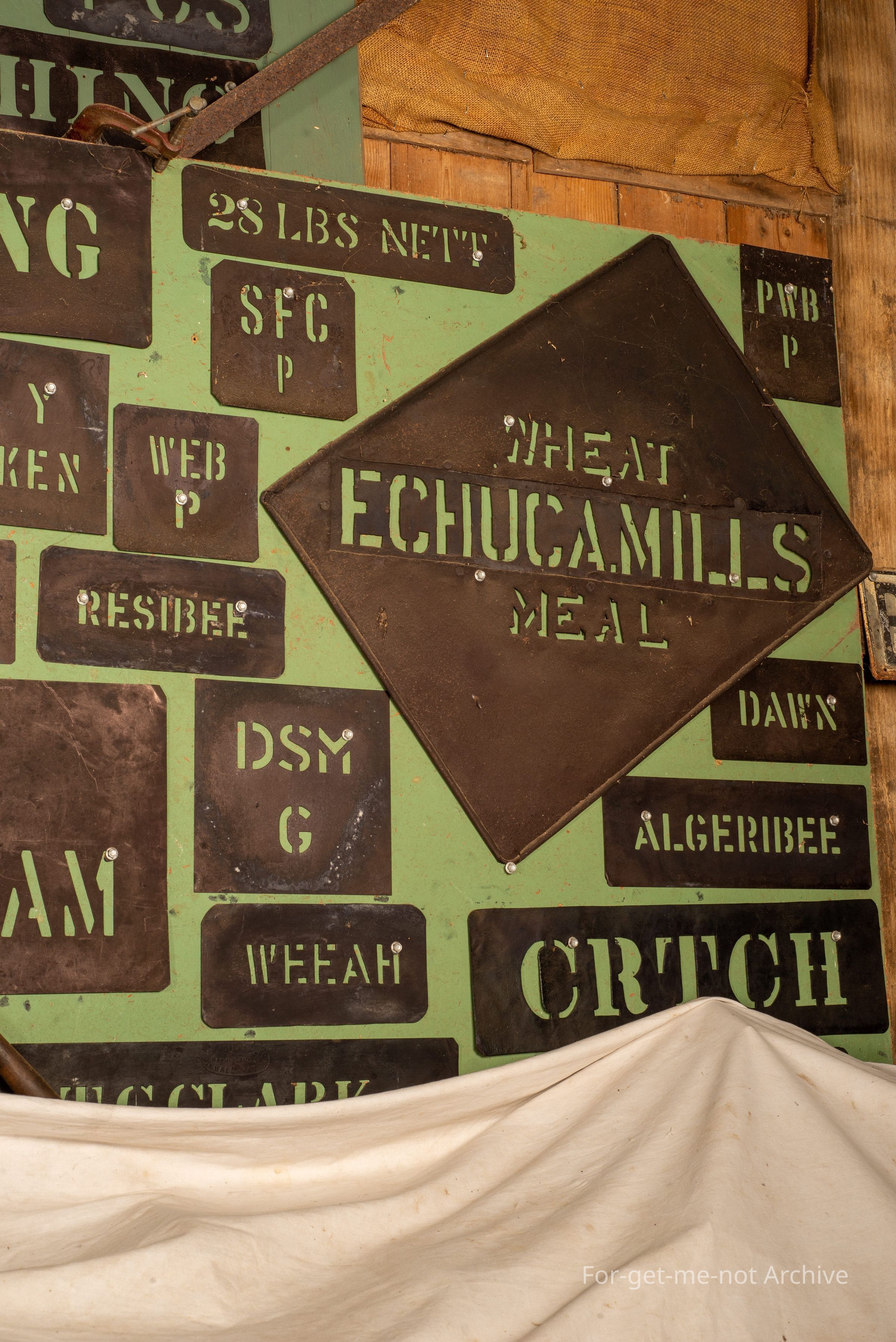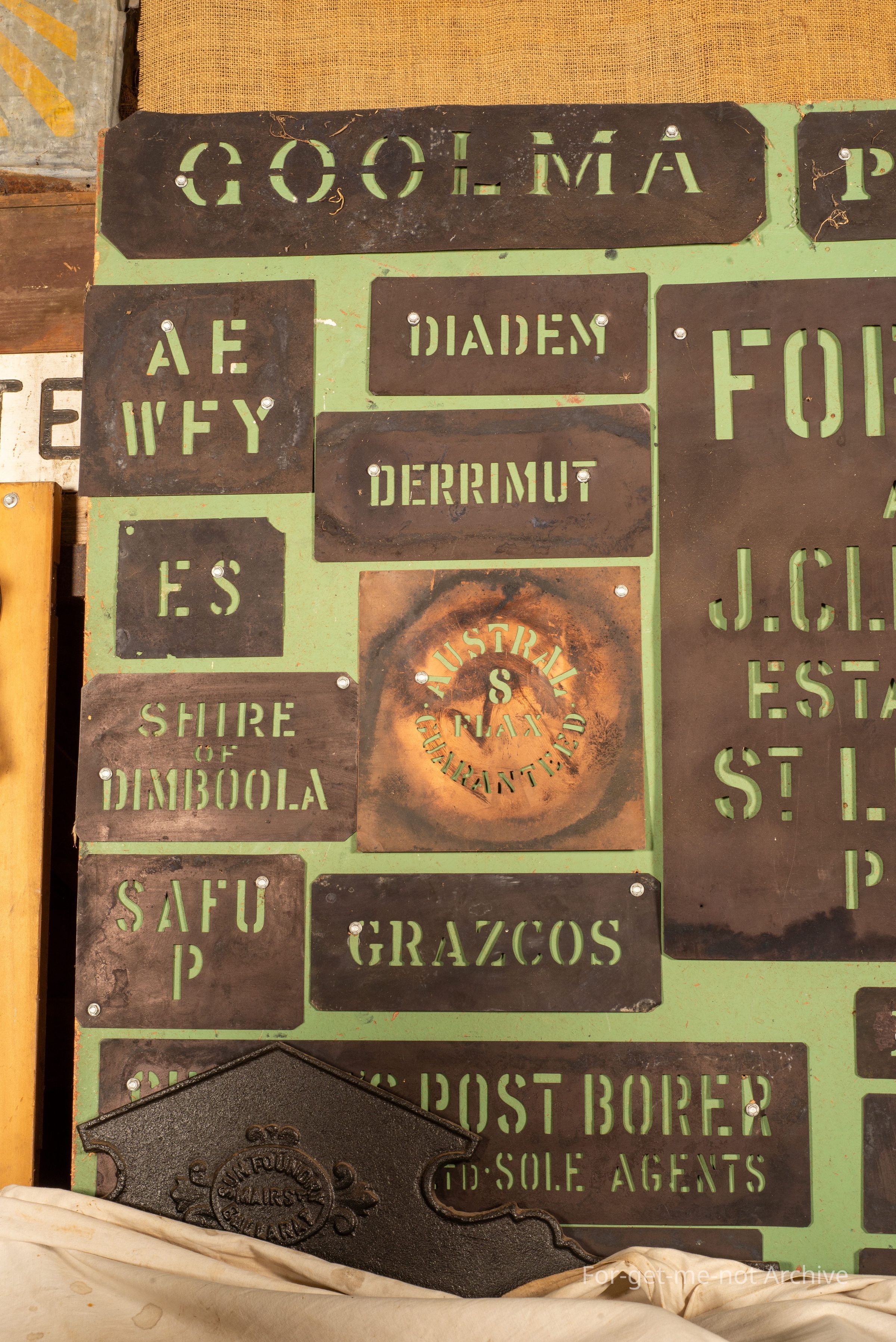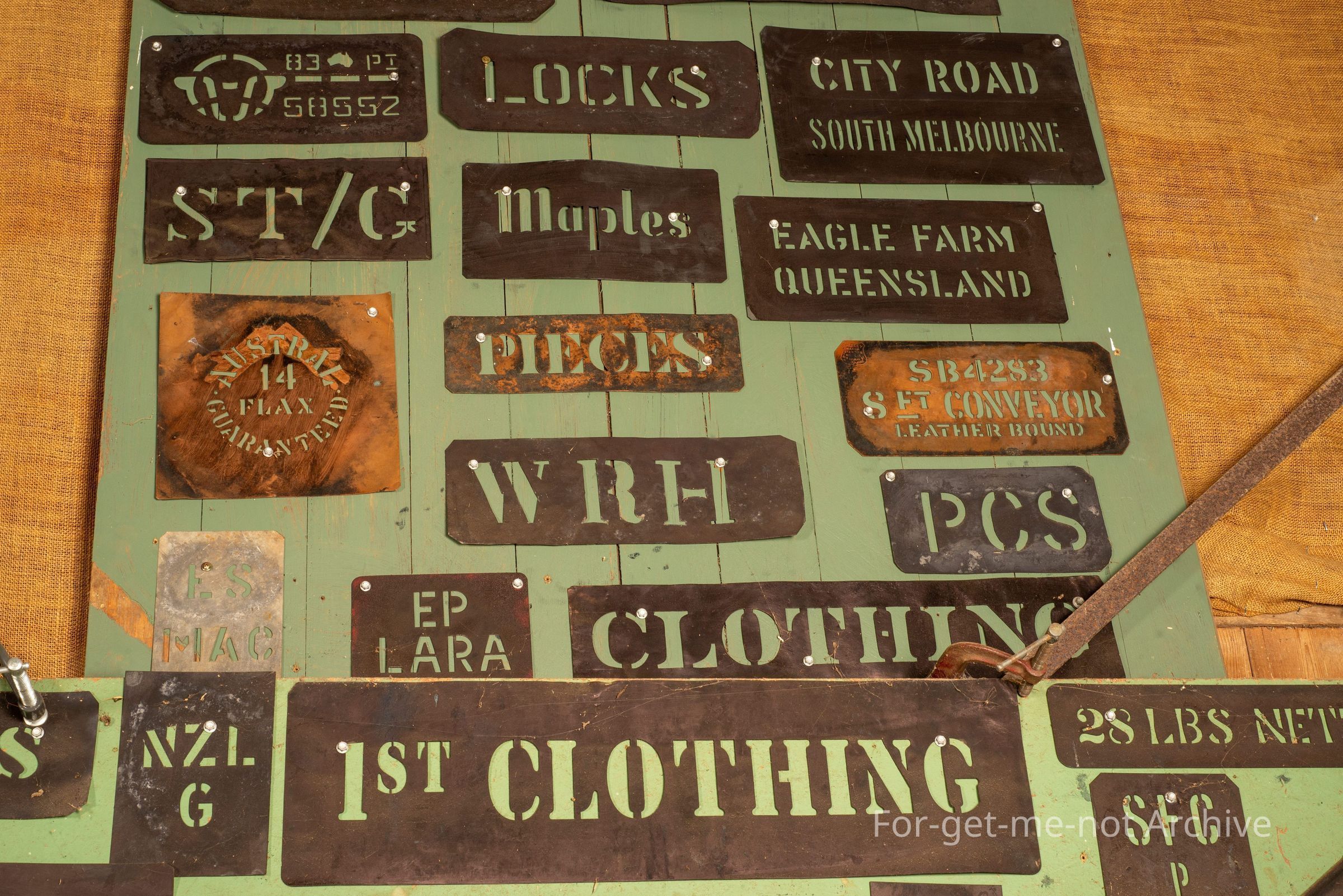 This is a large display of stencils, for various things from real estate agents to, brine mills, woollen industry, flax industry, brine industry. Too many to count.