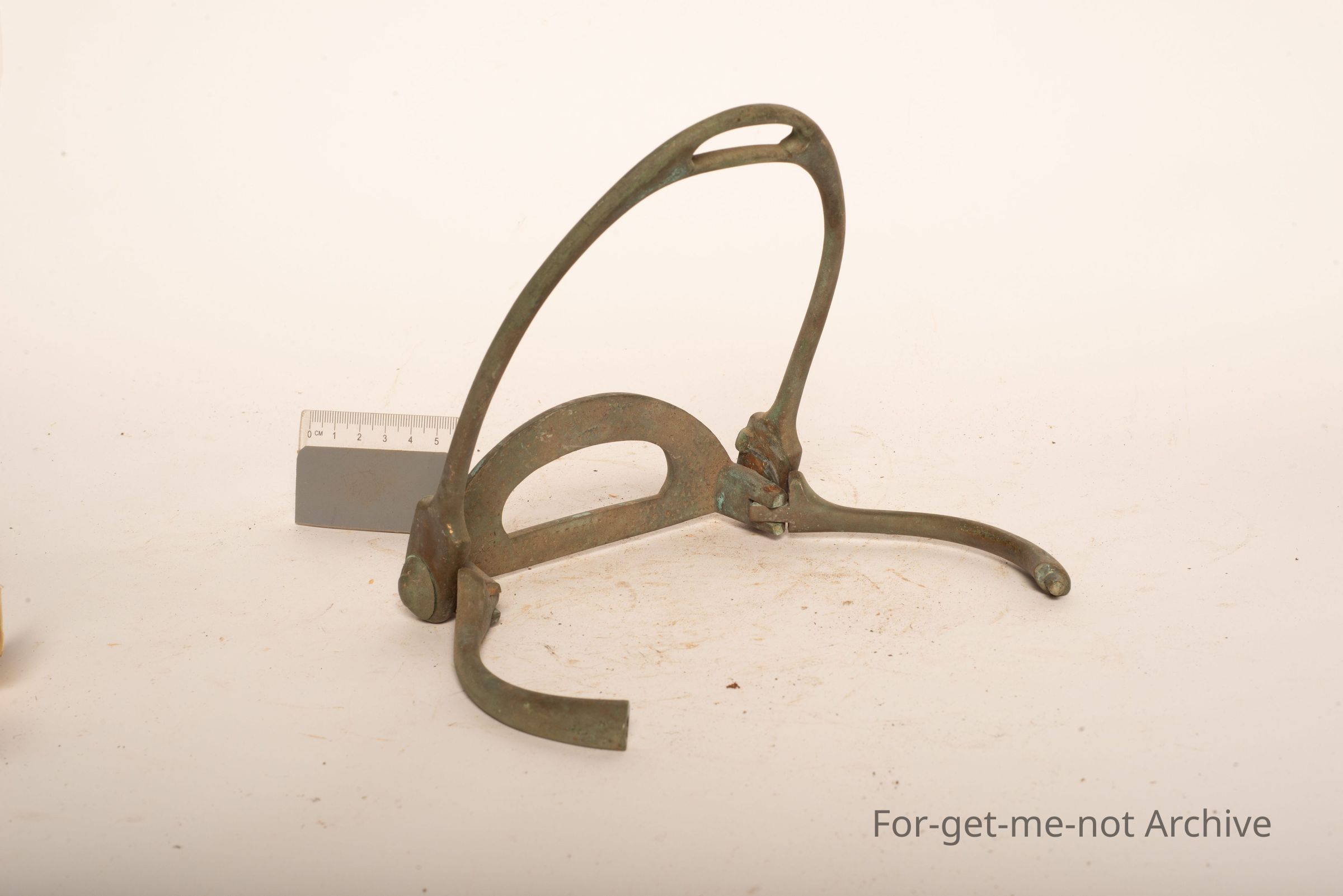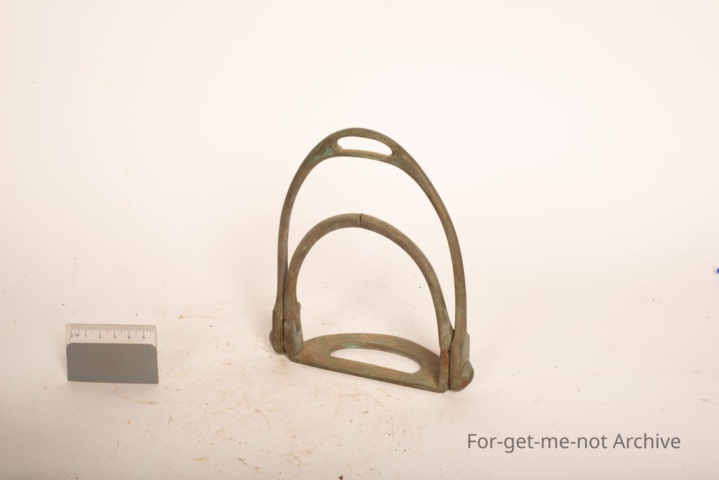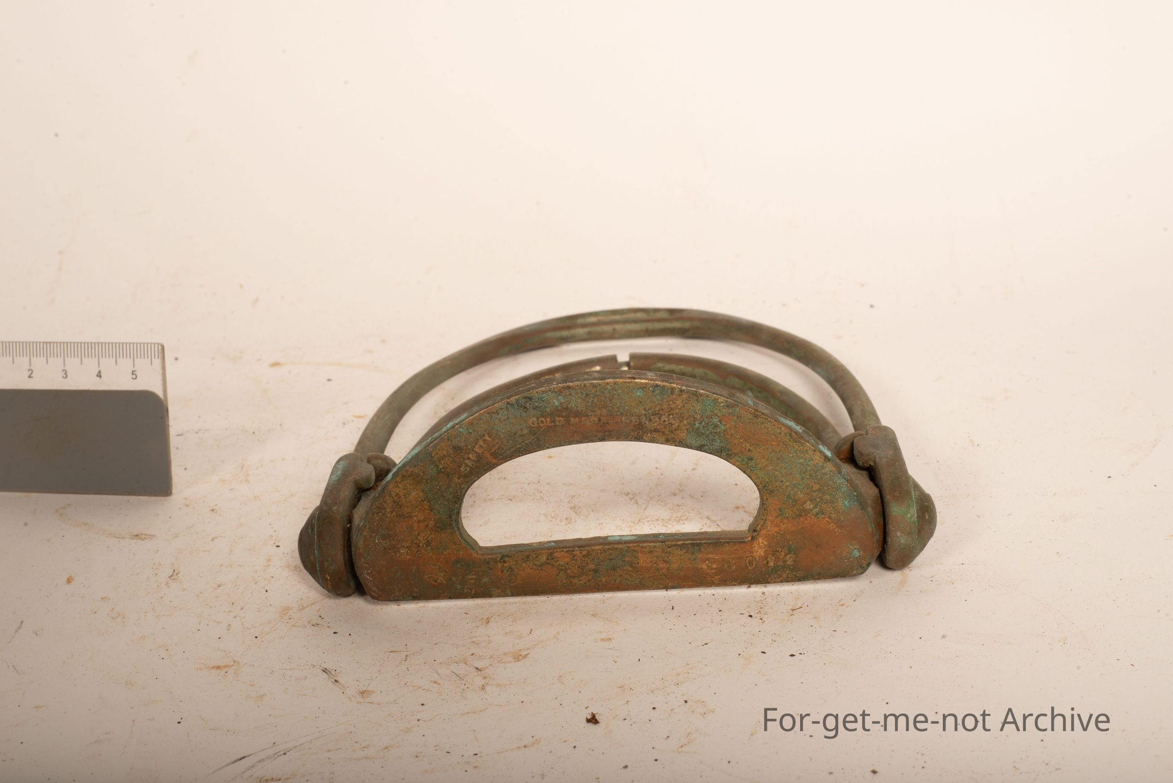 This is another safety stirrup for a horse rider. This time, a men's foot. This is stamped on the bottom. Gold medal, solid nickel, with a lot of patent dates and what have you, would clean up very well.Collection