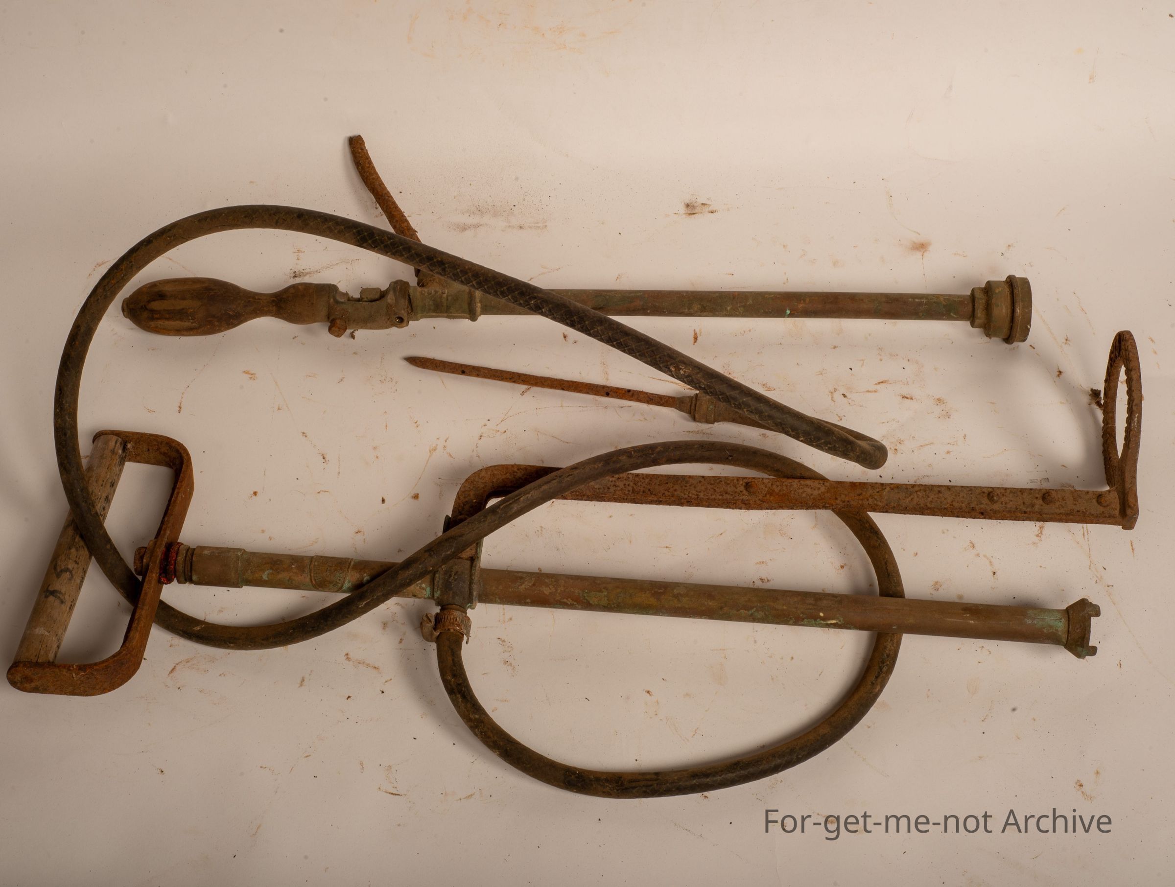These are 2, apparatus used by a butcher for salting large lumps of meat. The pump was operated, and the rubber hose had a needle which, injected the, salting material straight into the meat, or like corned beef.Collection