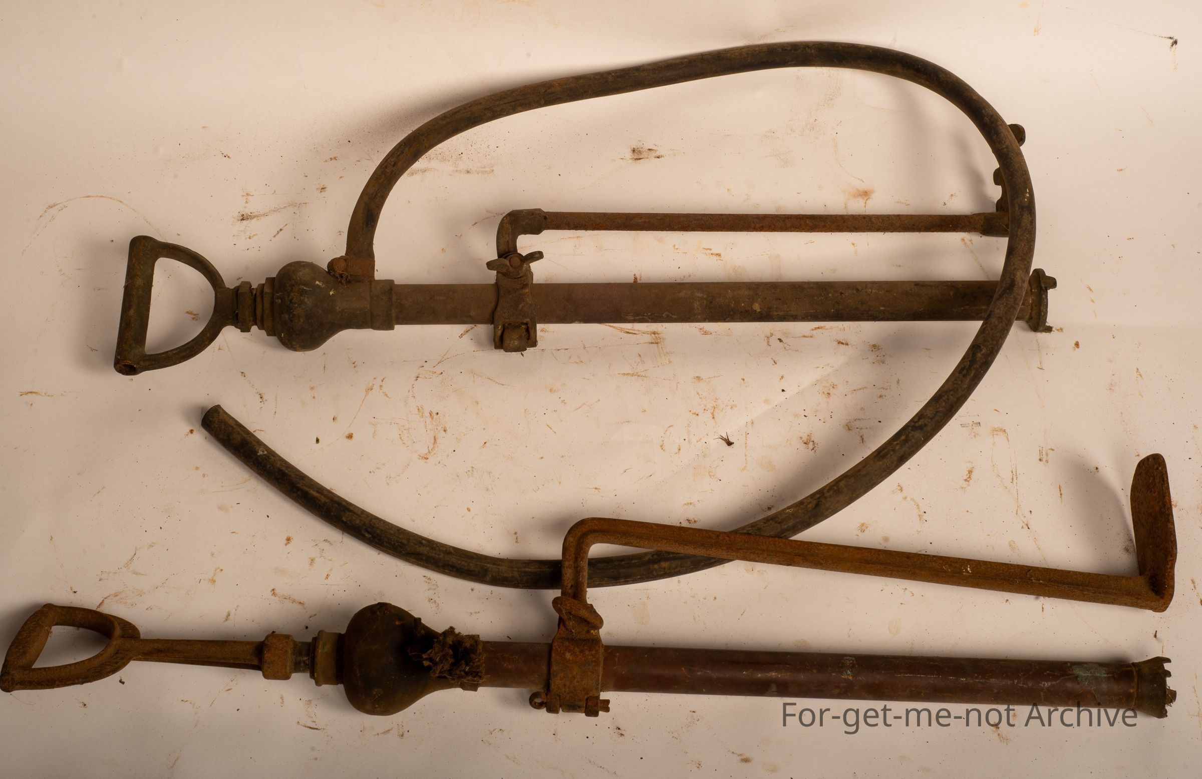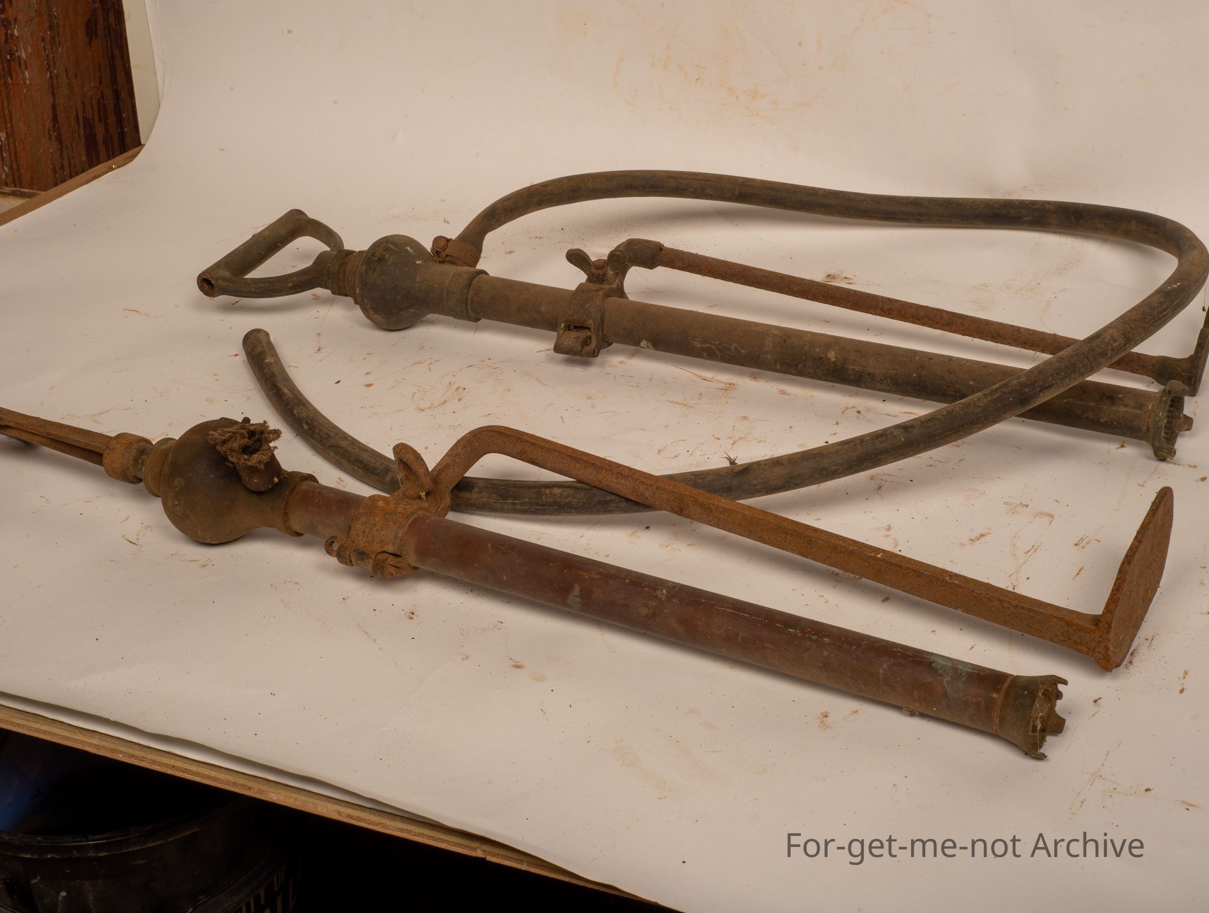 Rule of tools. These are 2 stirrup pumps, hand operated. You have a foot at the, base of the bucket with the plunger into the bucket. One of these is made by the Success Company from Queensland.Collection