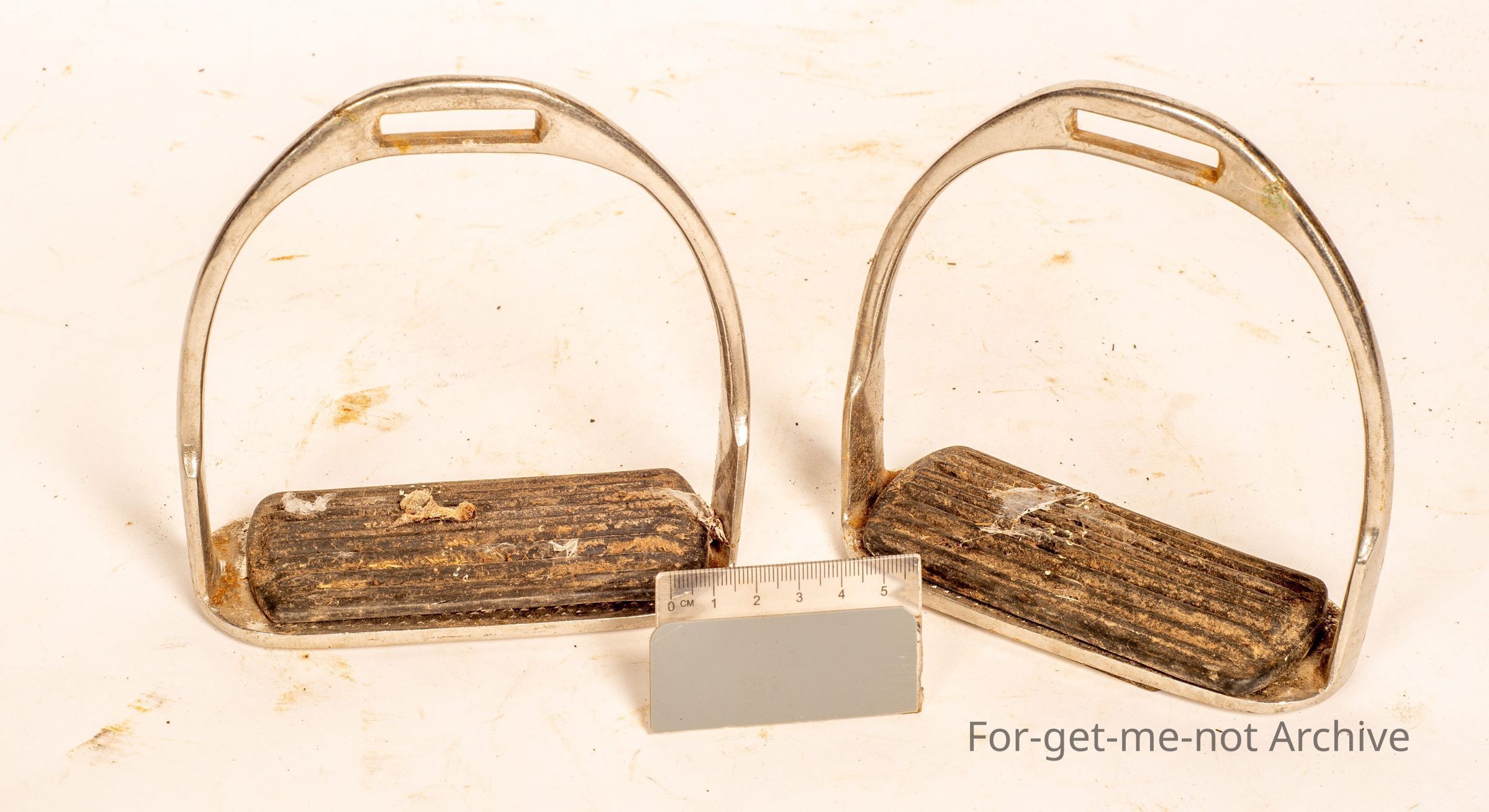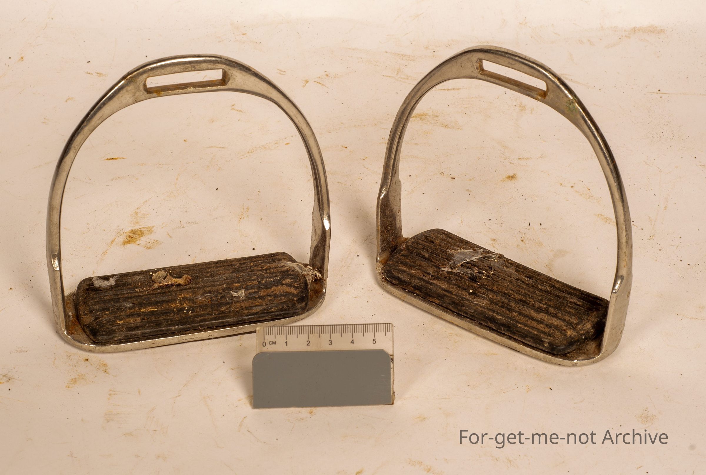 This is a set of what looked to be unused stirrup irons. Beautiful chroming, a leather, not leather, rubber, pad for putting the boots on in the stirrup. No identification but, top conditionCollection