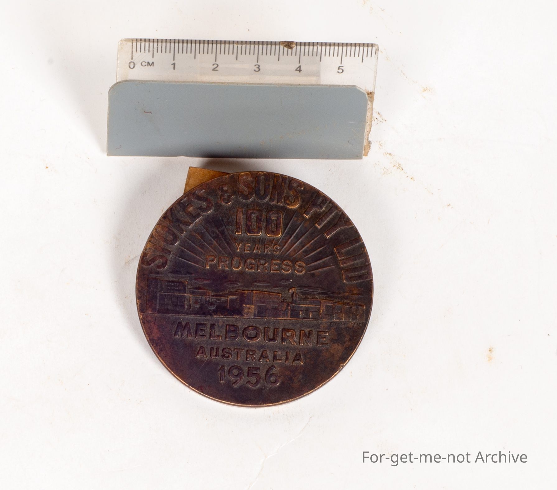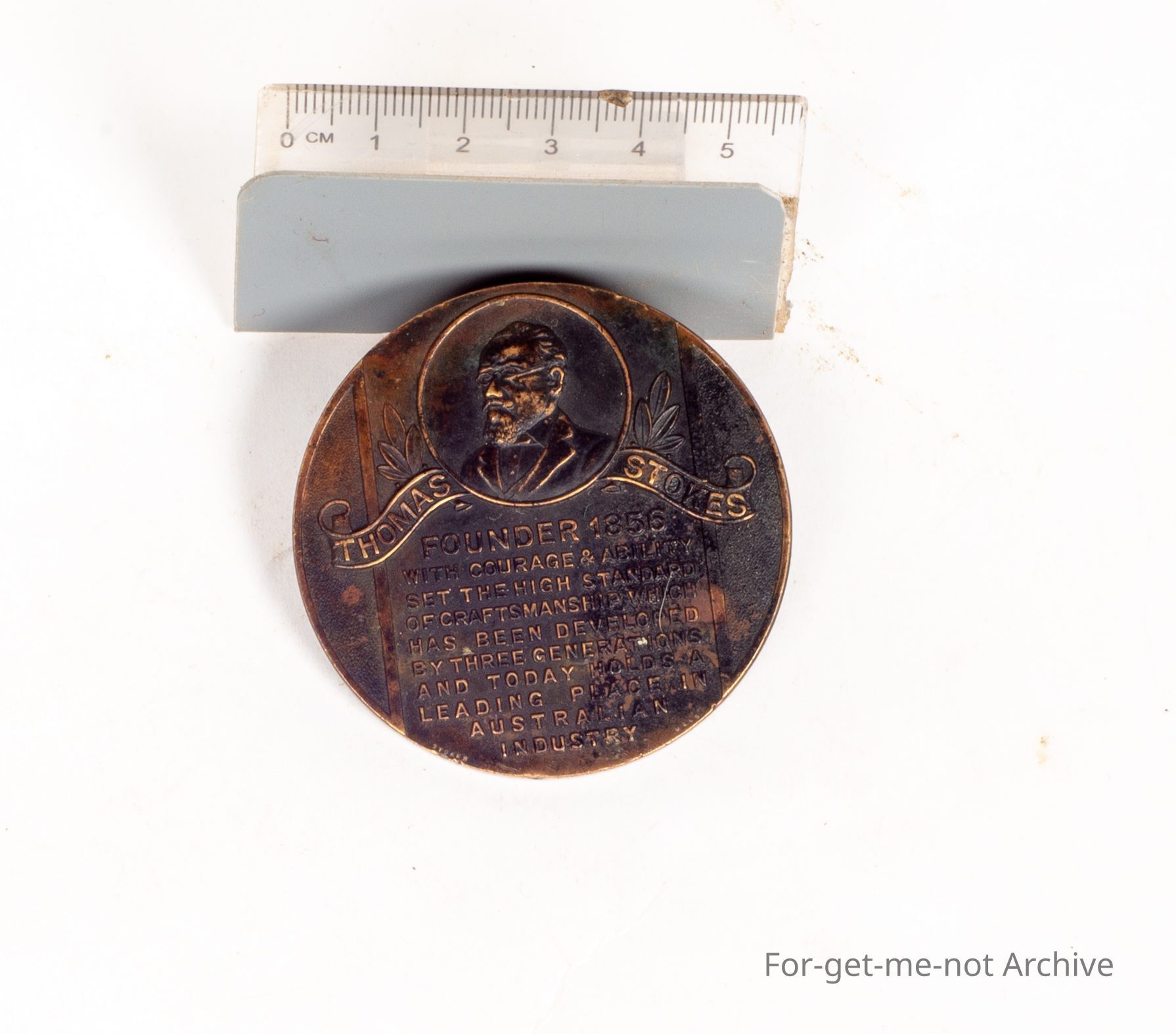 This is another, cast brass, celebratory pieces for the 100 years of Stokes and Son operating in Melbourne. This was issued in 1956. On the back is a profile of Thomas Stokes with the, brief history of his life. Another hard piece to find.Collection