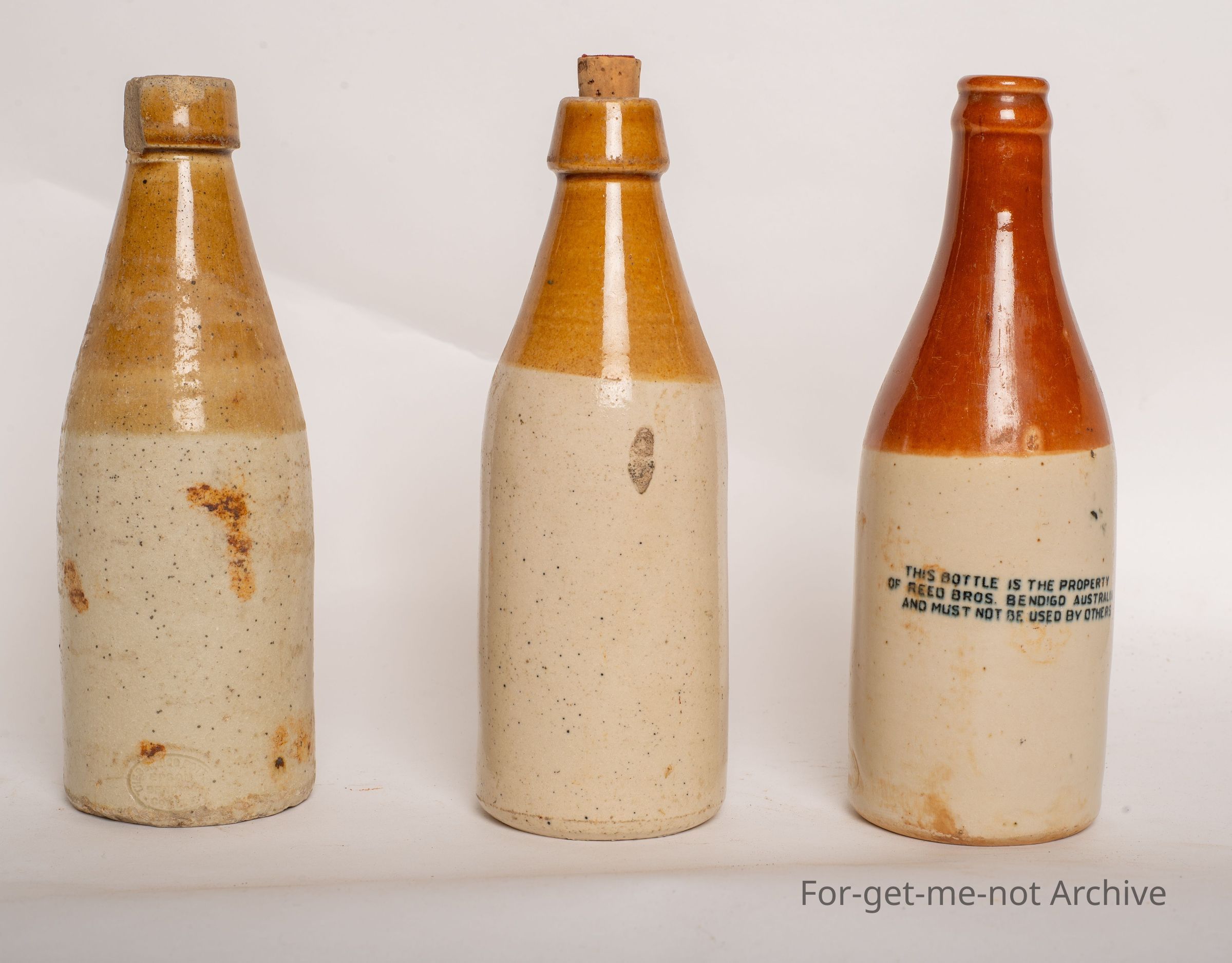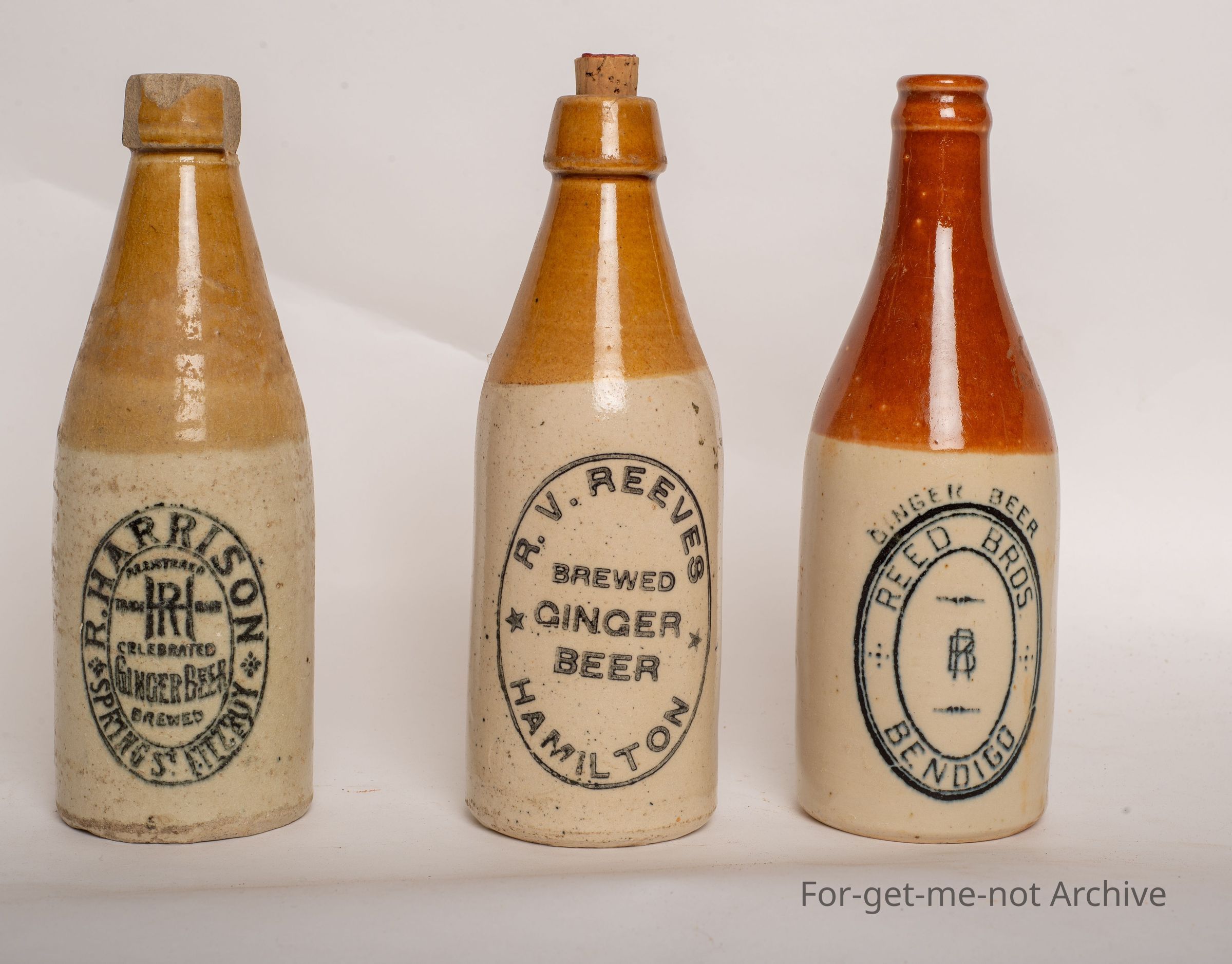 Stoneware ginger beer bottles, group of 3, Reed Bros Bendigo, Reeves Hamilton, R. Harrison Spring st Fitzroy.