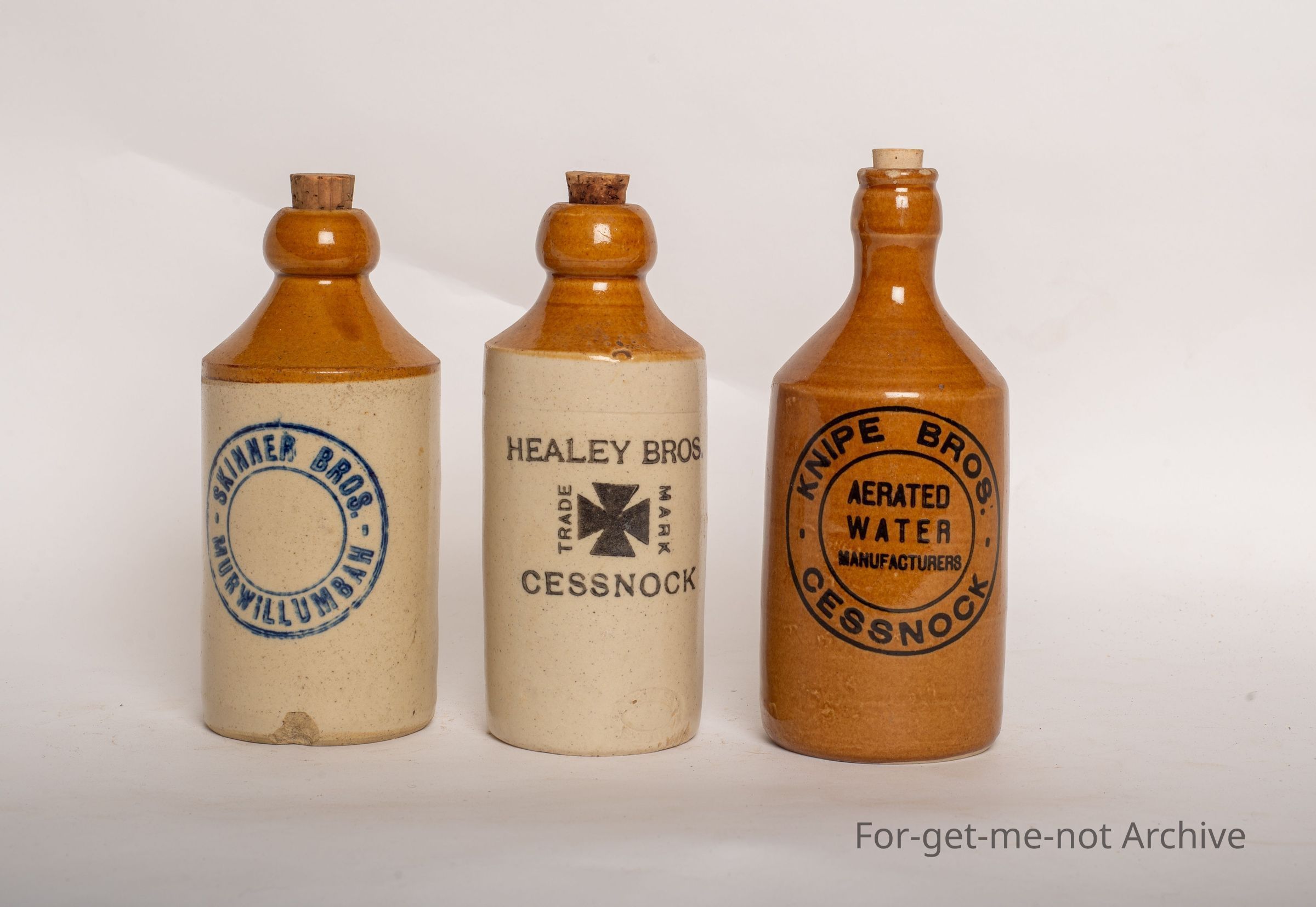 Group of 3 stoneware ginger beer bottles. One from Slinner Bros Murwillumbah, Healy Bros Cessnock, Knipe Bros Cessnock