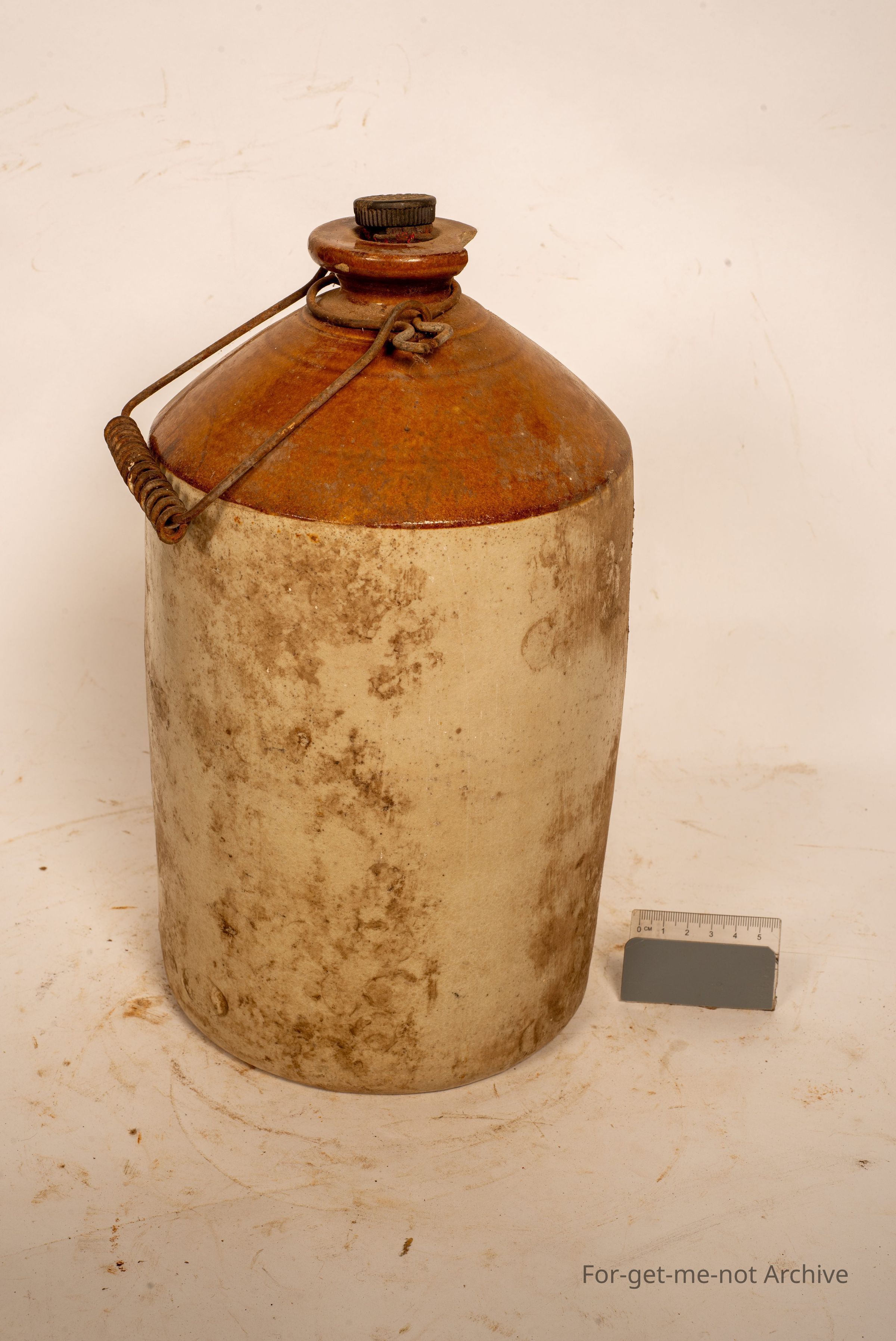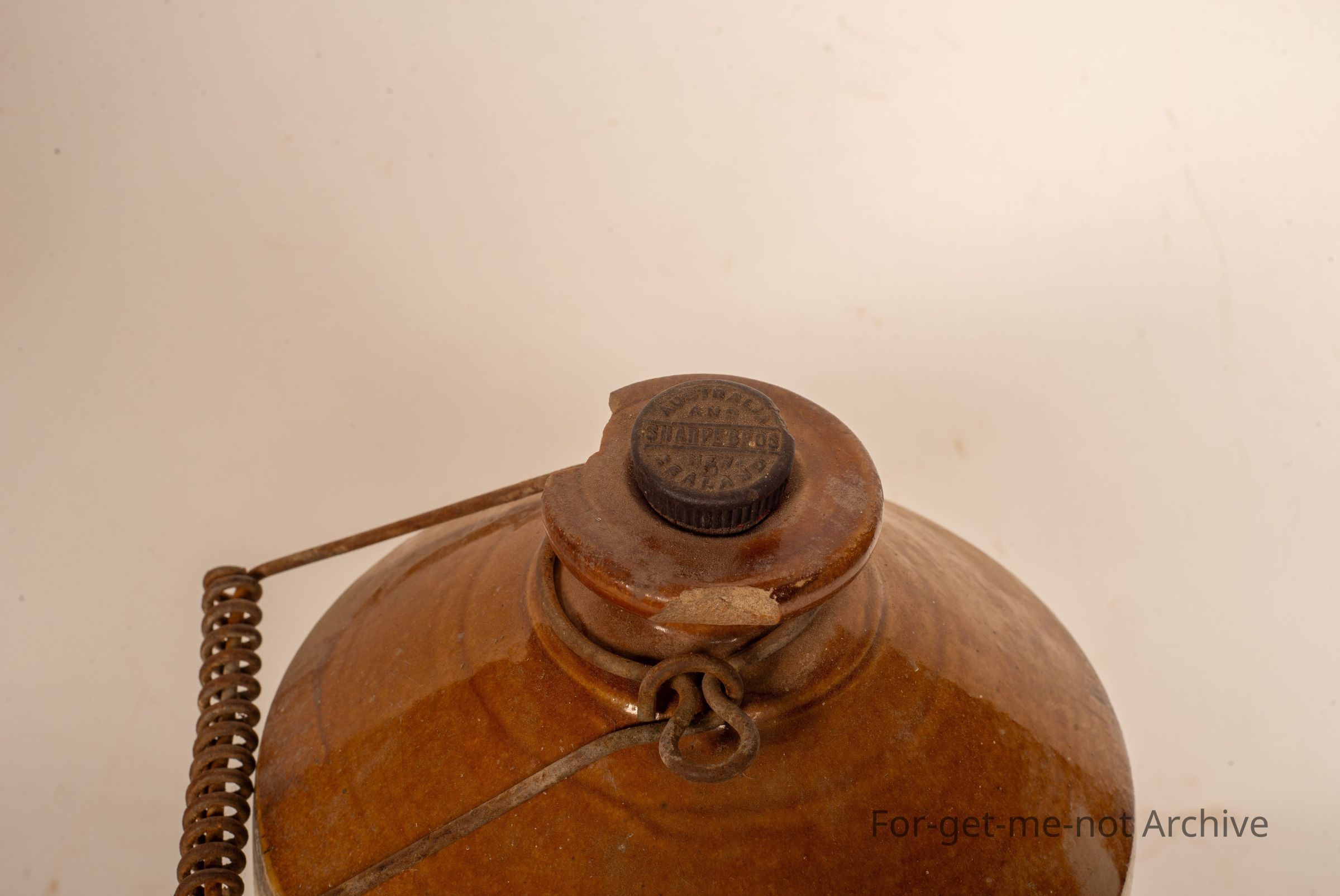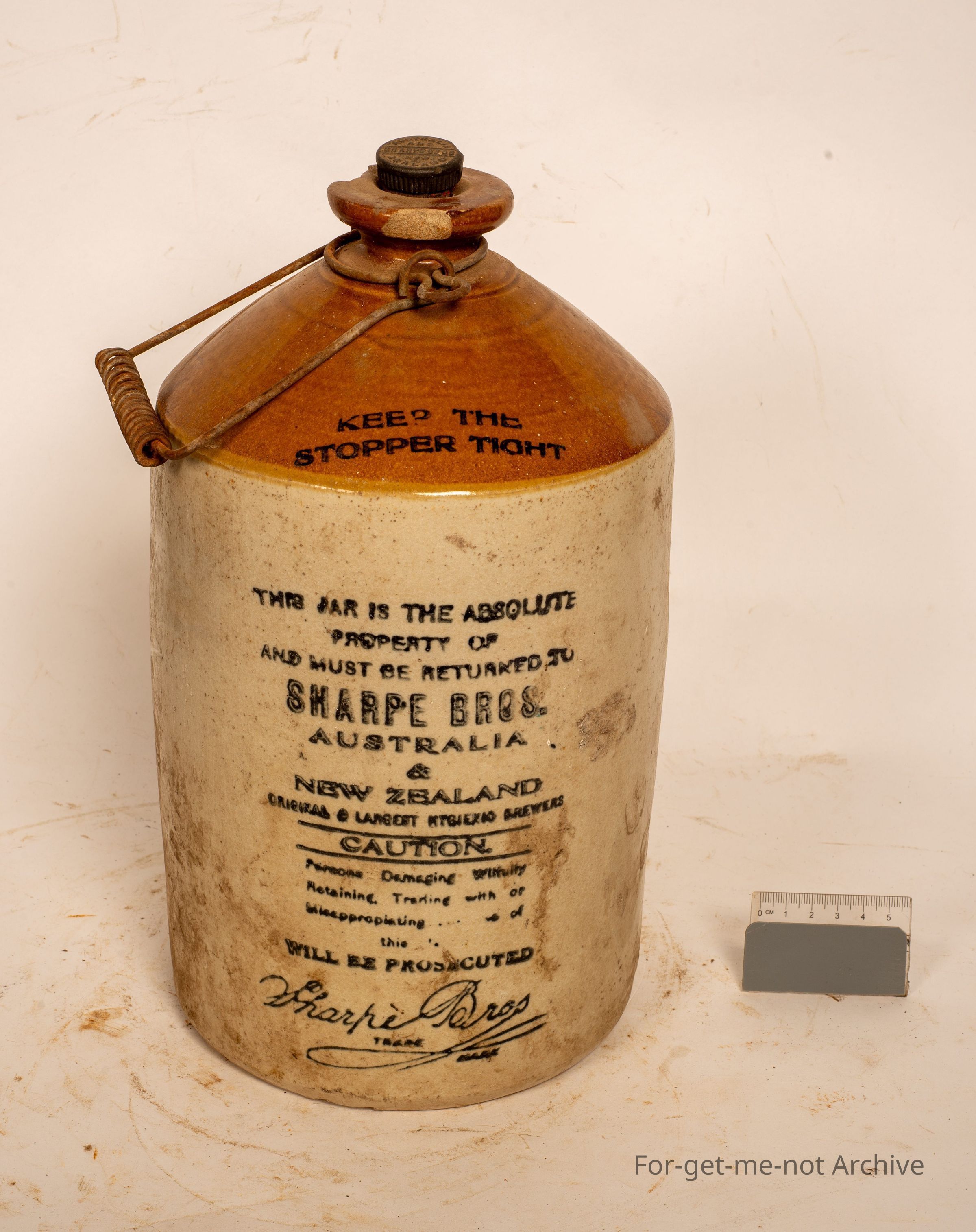 This is one of the Sharp Brothers Australia and New Zealand jars. This one is a fairly common one. Chips to the neck, original cork, and the lovely wire handle is still there.Collection