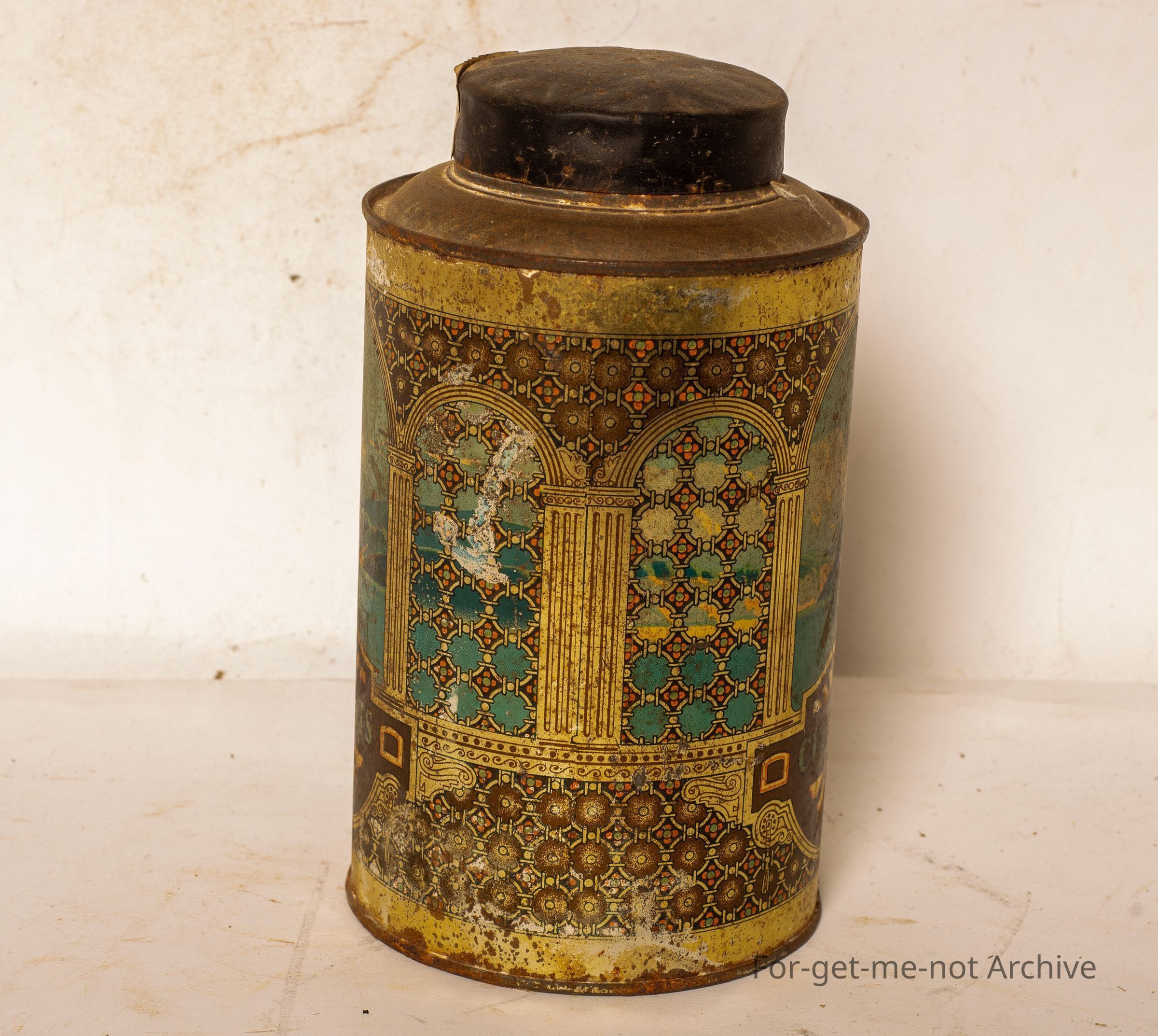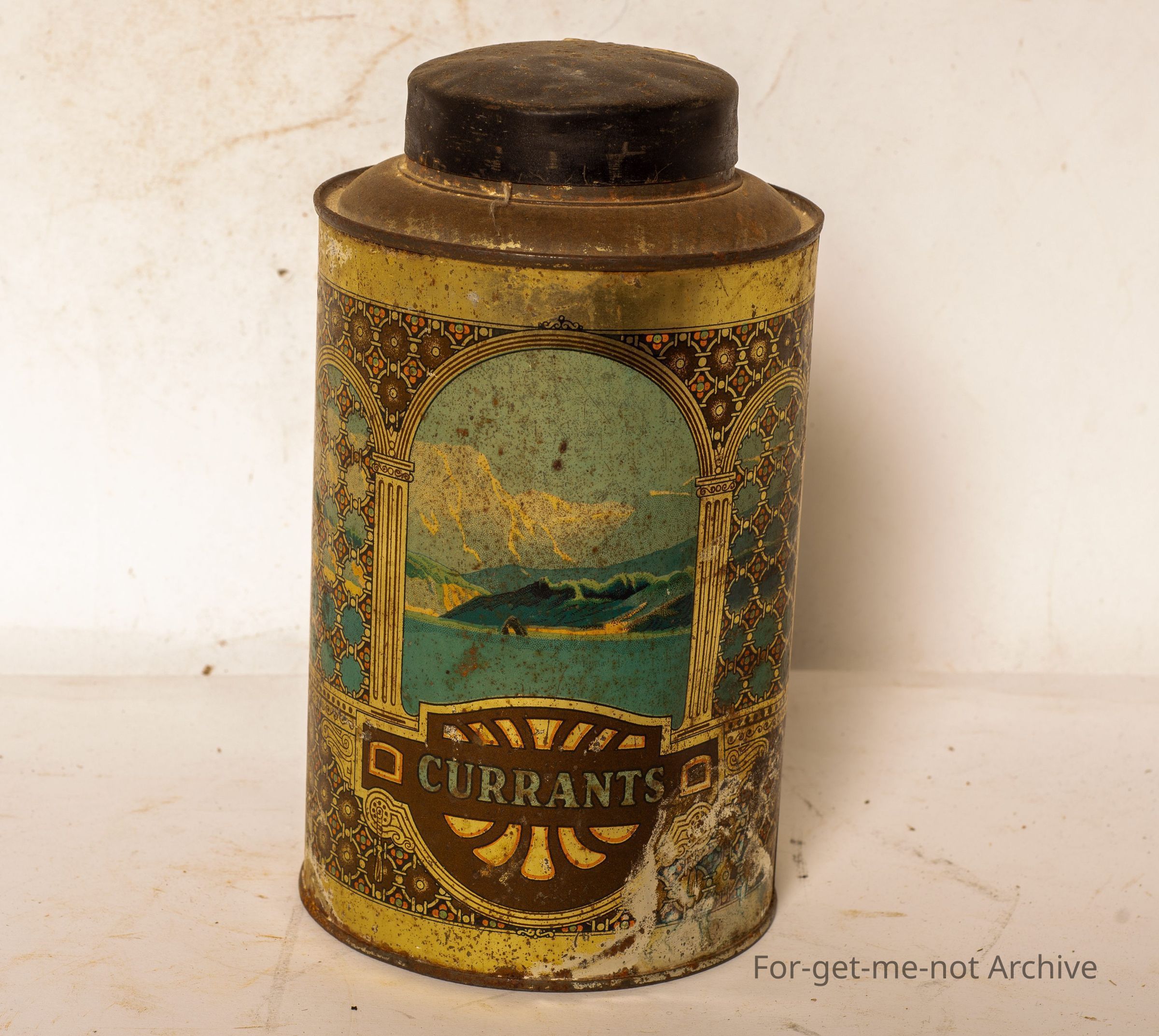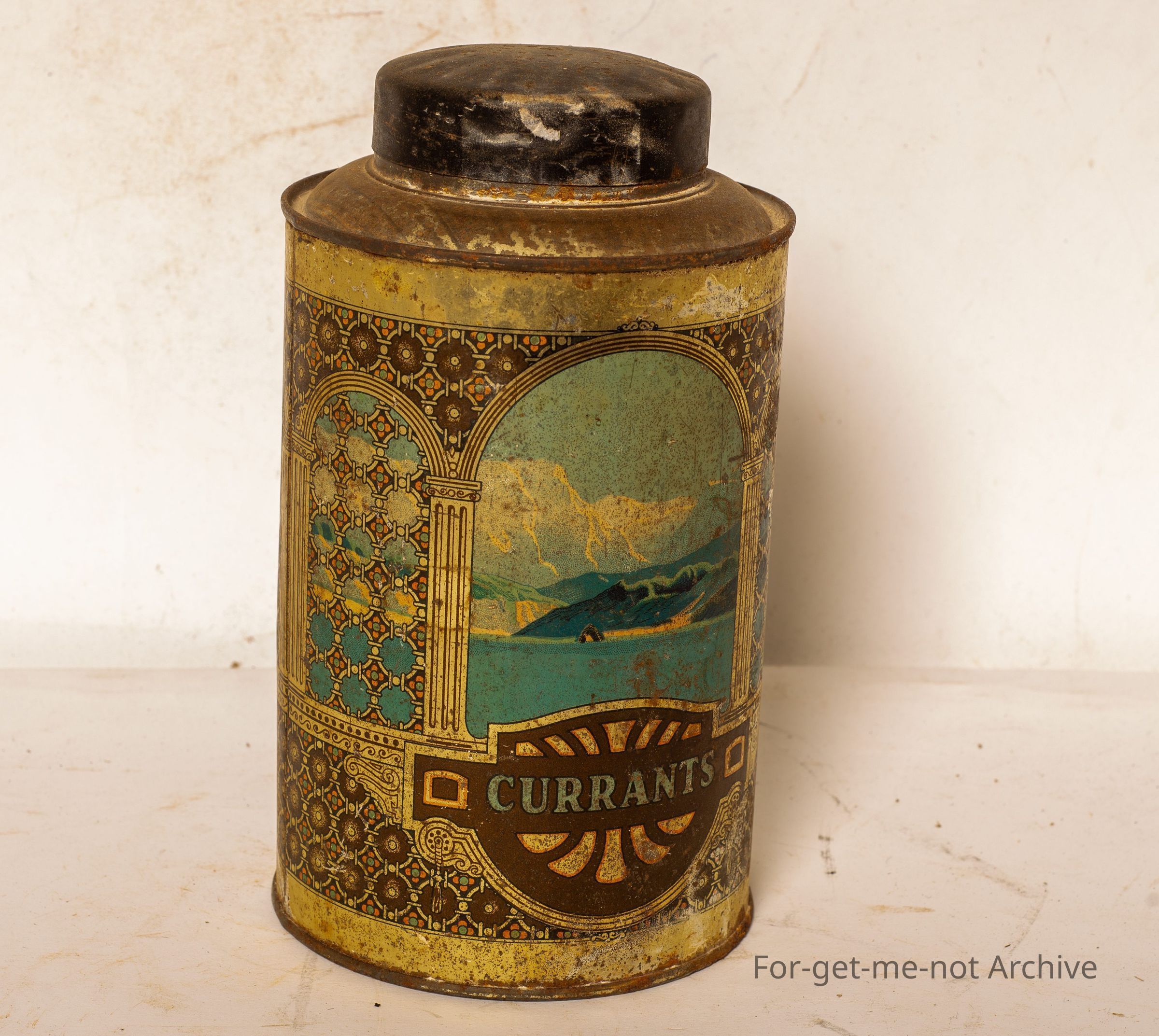 Tin storage can. This is out of a series, with different scenes. This one, it has currents on both sides with lid. Quite a quite a common set of canisters.