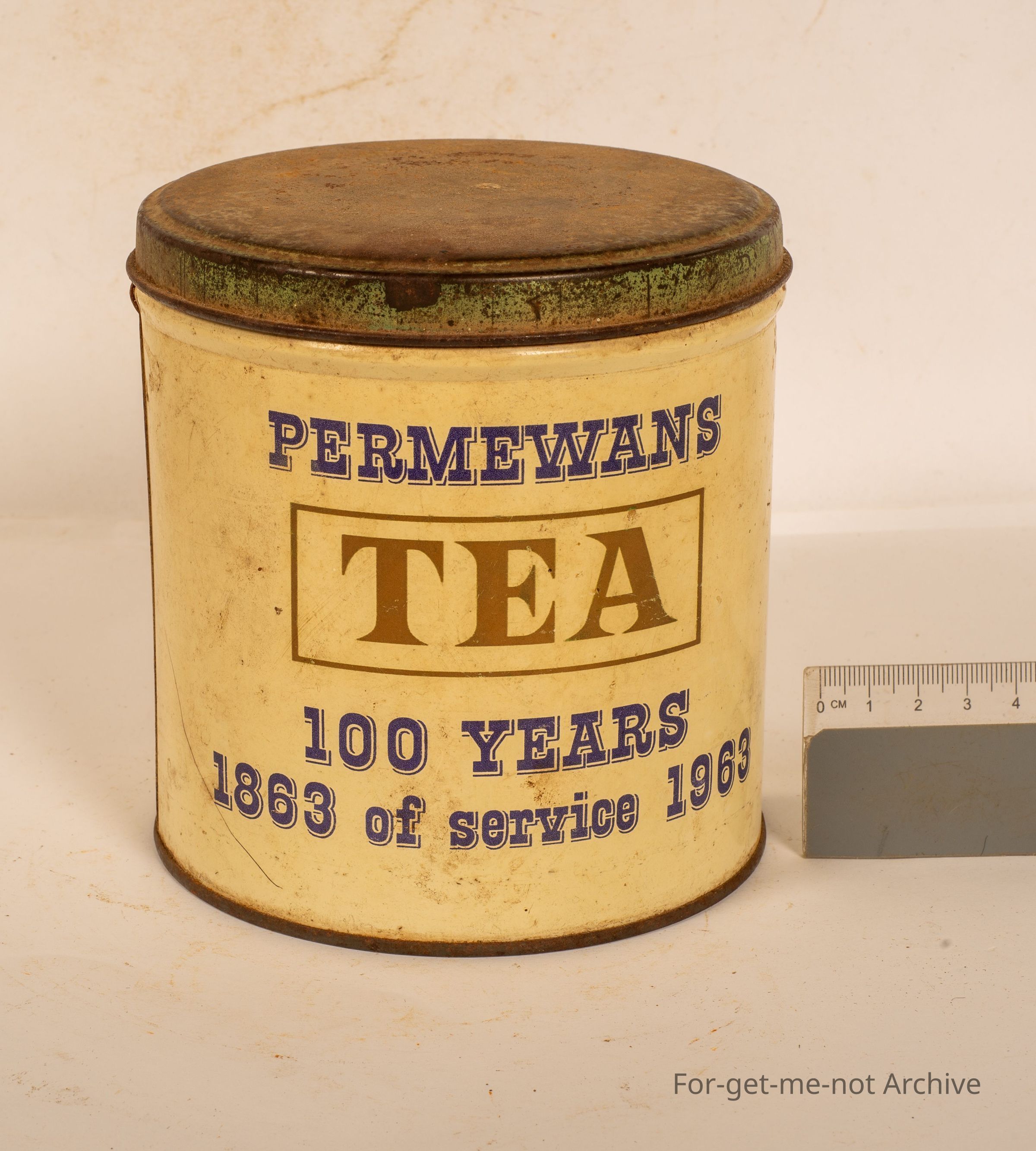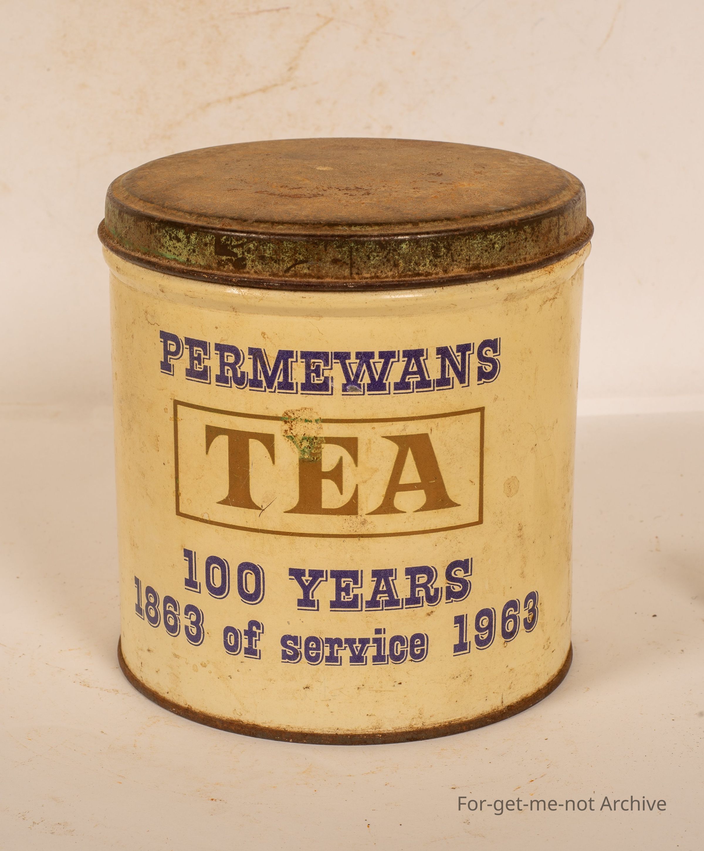 This is a tea storage canister to celebrate 100 years of Permewans. 1863 to 1963. This tin has been made, Willow Australia. Permewans grocery merchants were bought out in 1976 establish in 1850's as a general carrier in geelongCollection