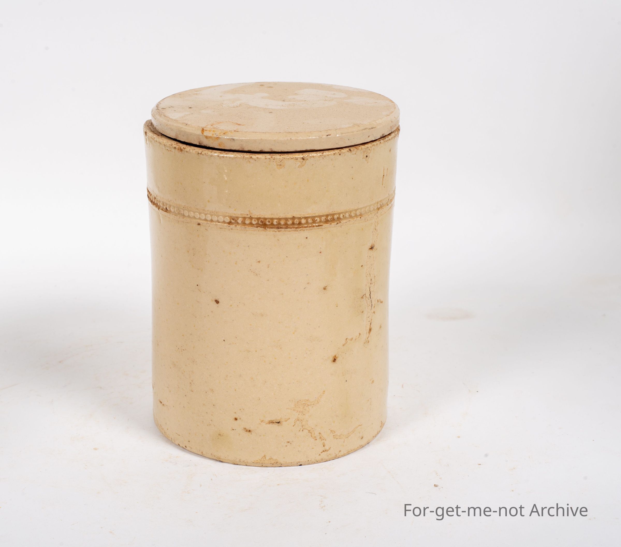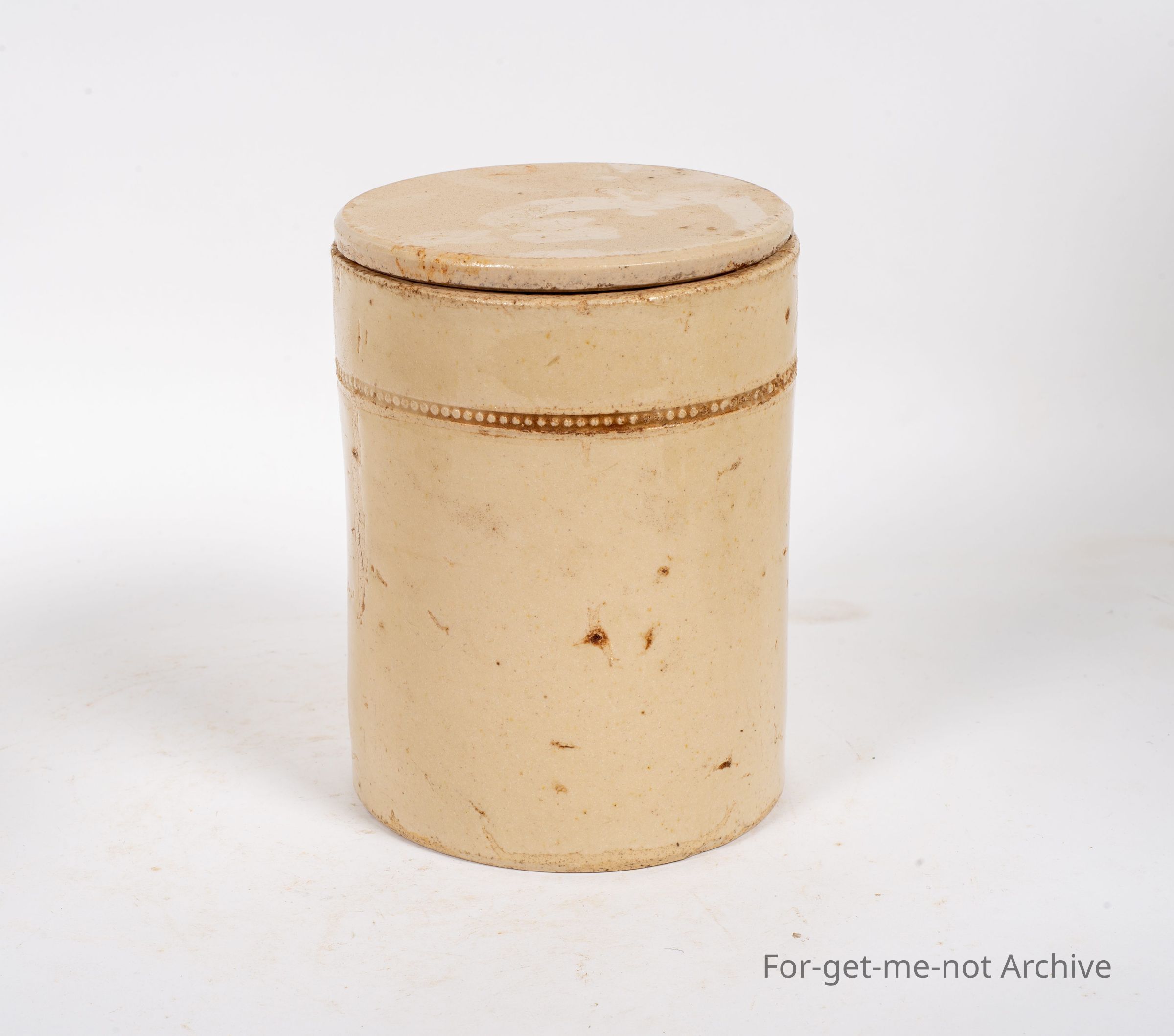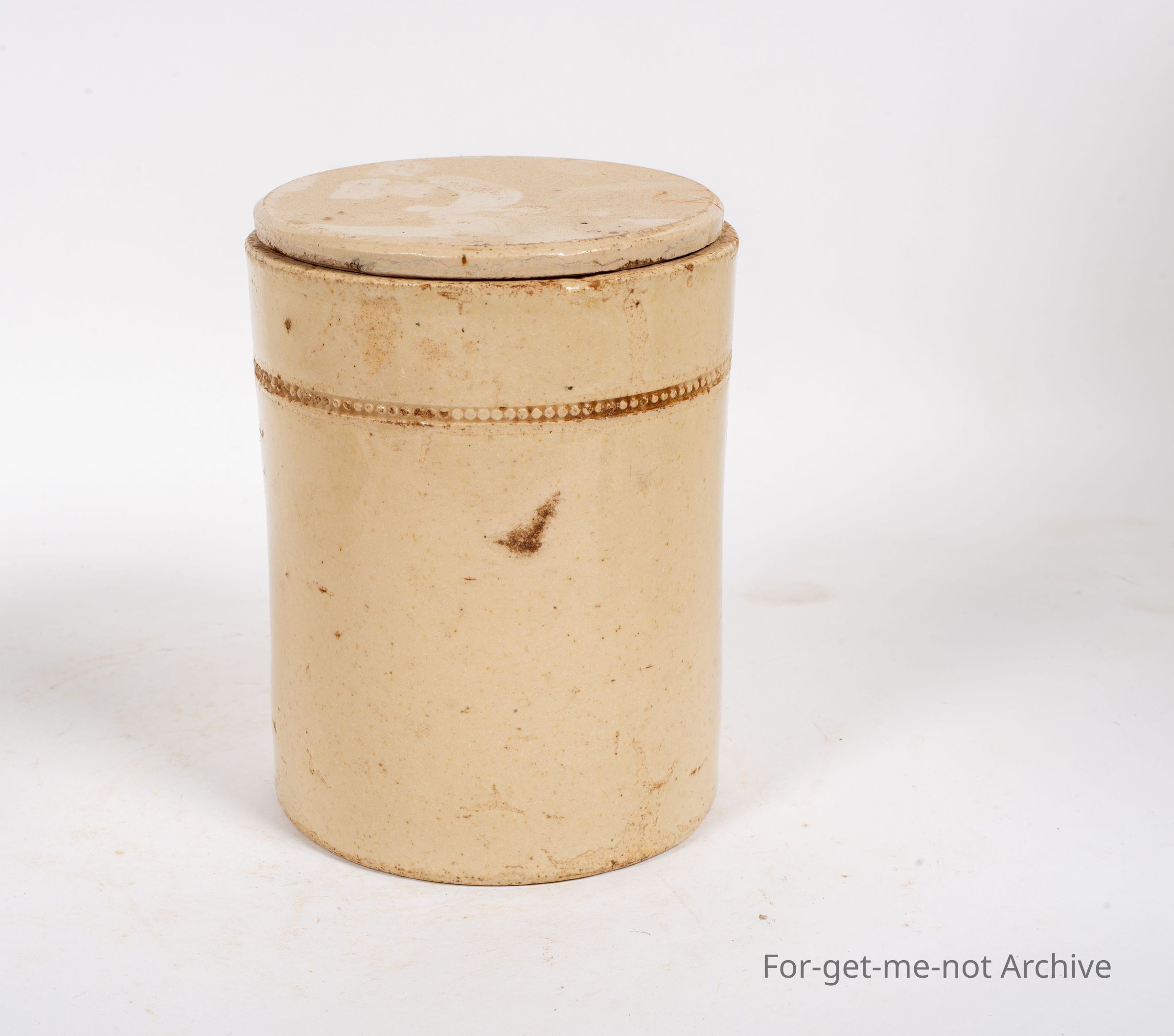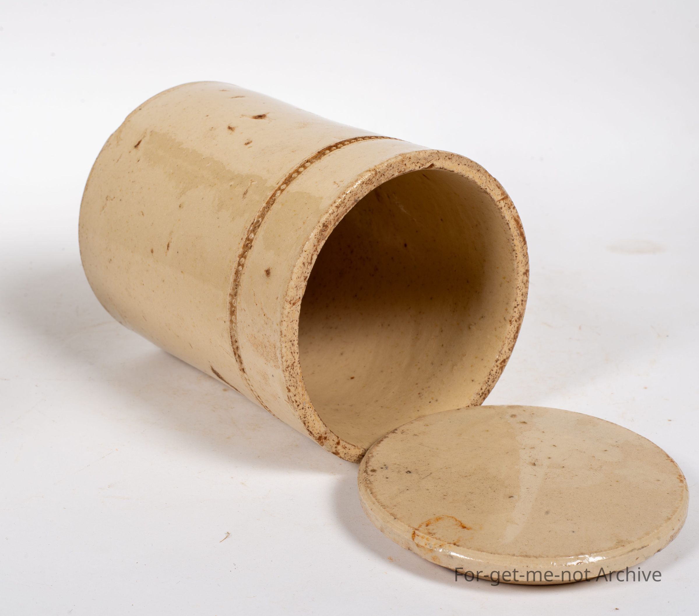 Stoneware pottery. This is like a flat or dripping storage jar, Bendigo cutlery, attributed only, colour work around the top neck with lid, which is uncommon. This is in very good order for one of these.Collection