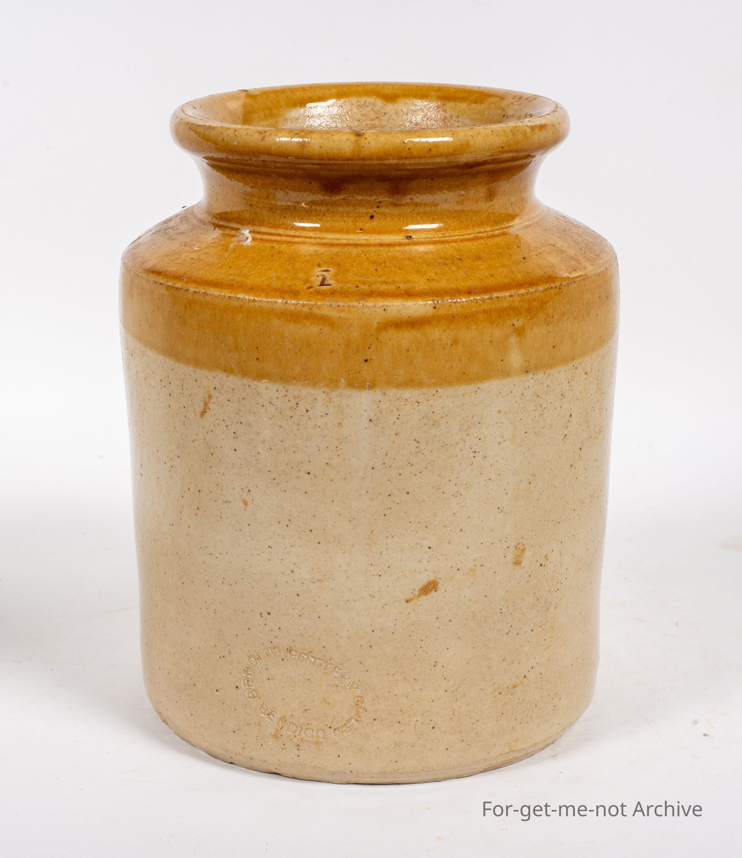 Stoneware, storage jar. This one would be worth $100 The is very good order, 2 quark size. This has the early Bendigo pottery stamp, in excellent condition.