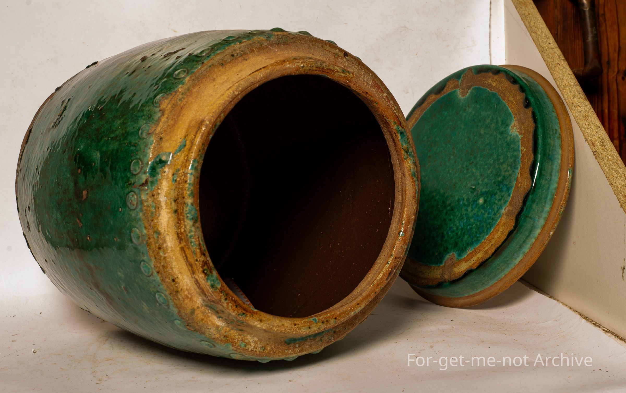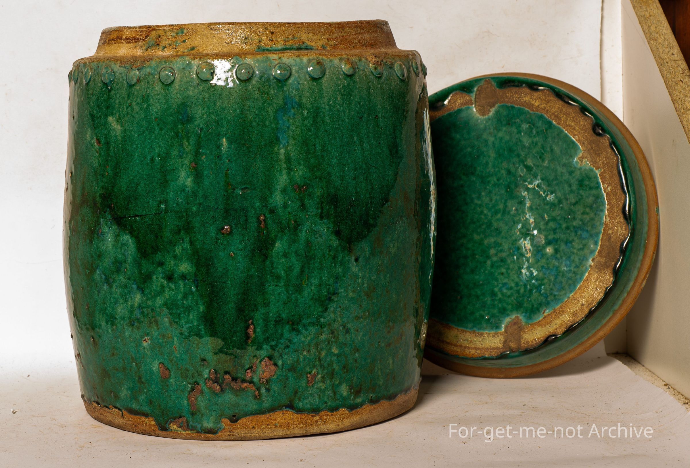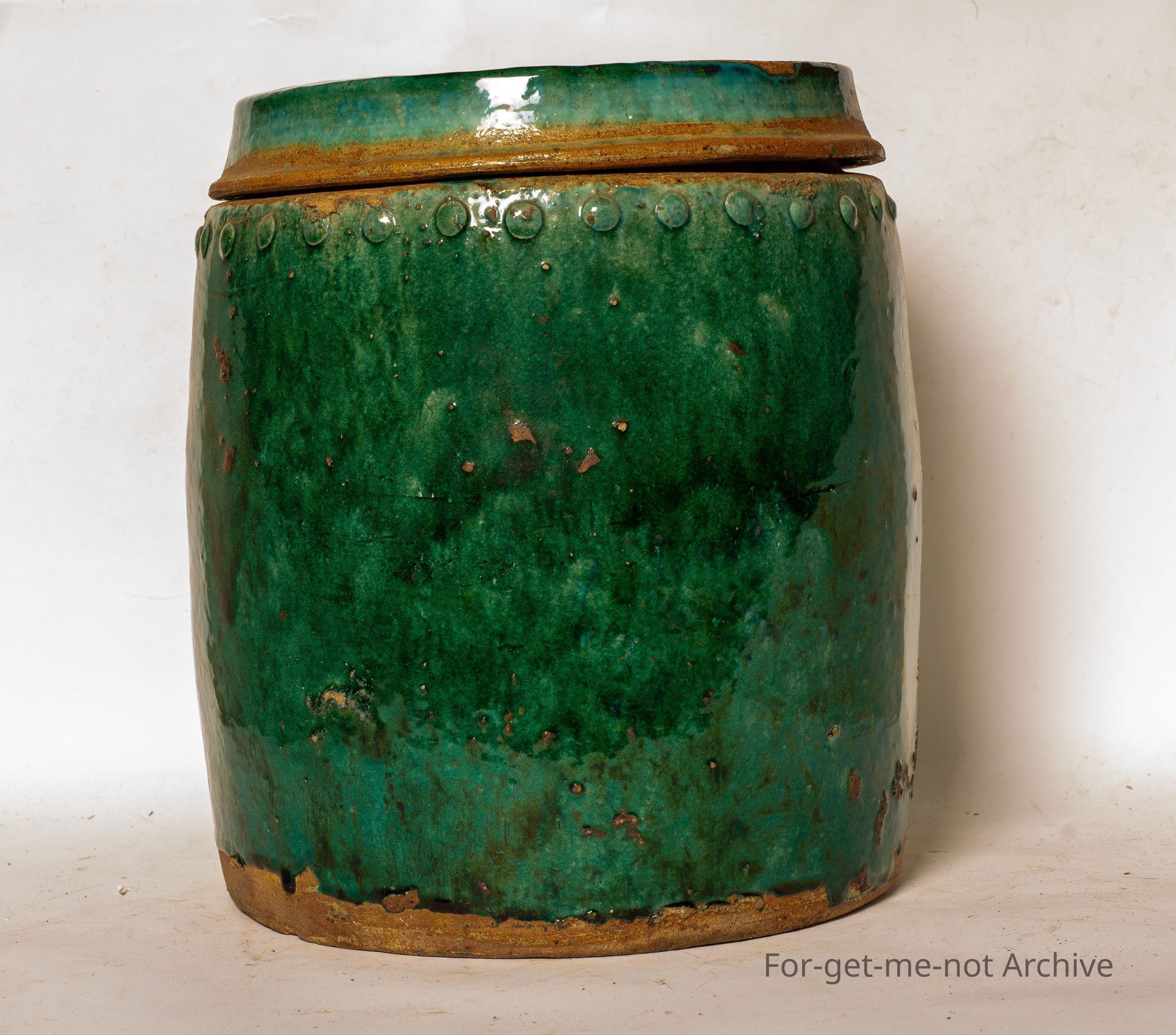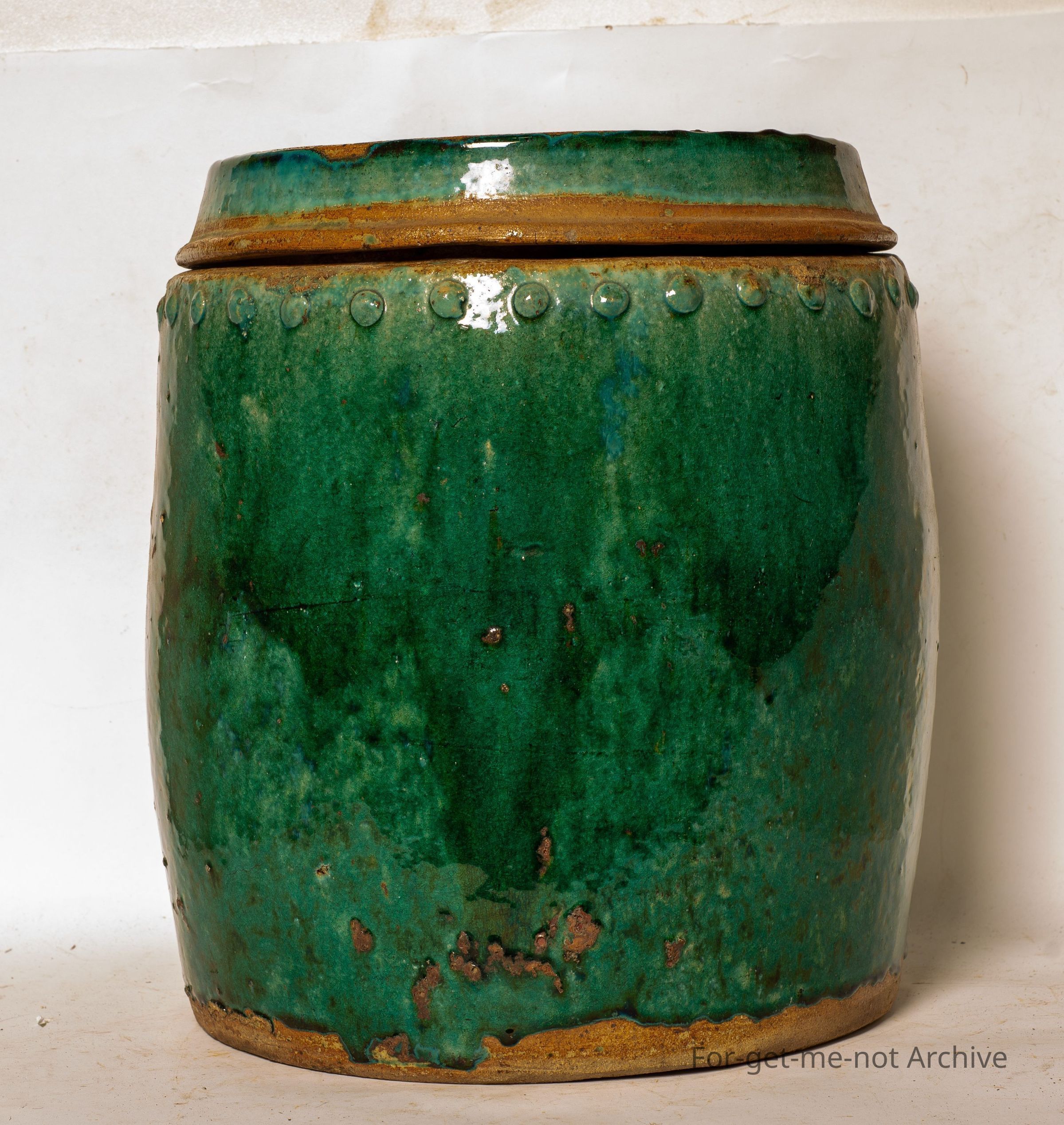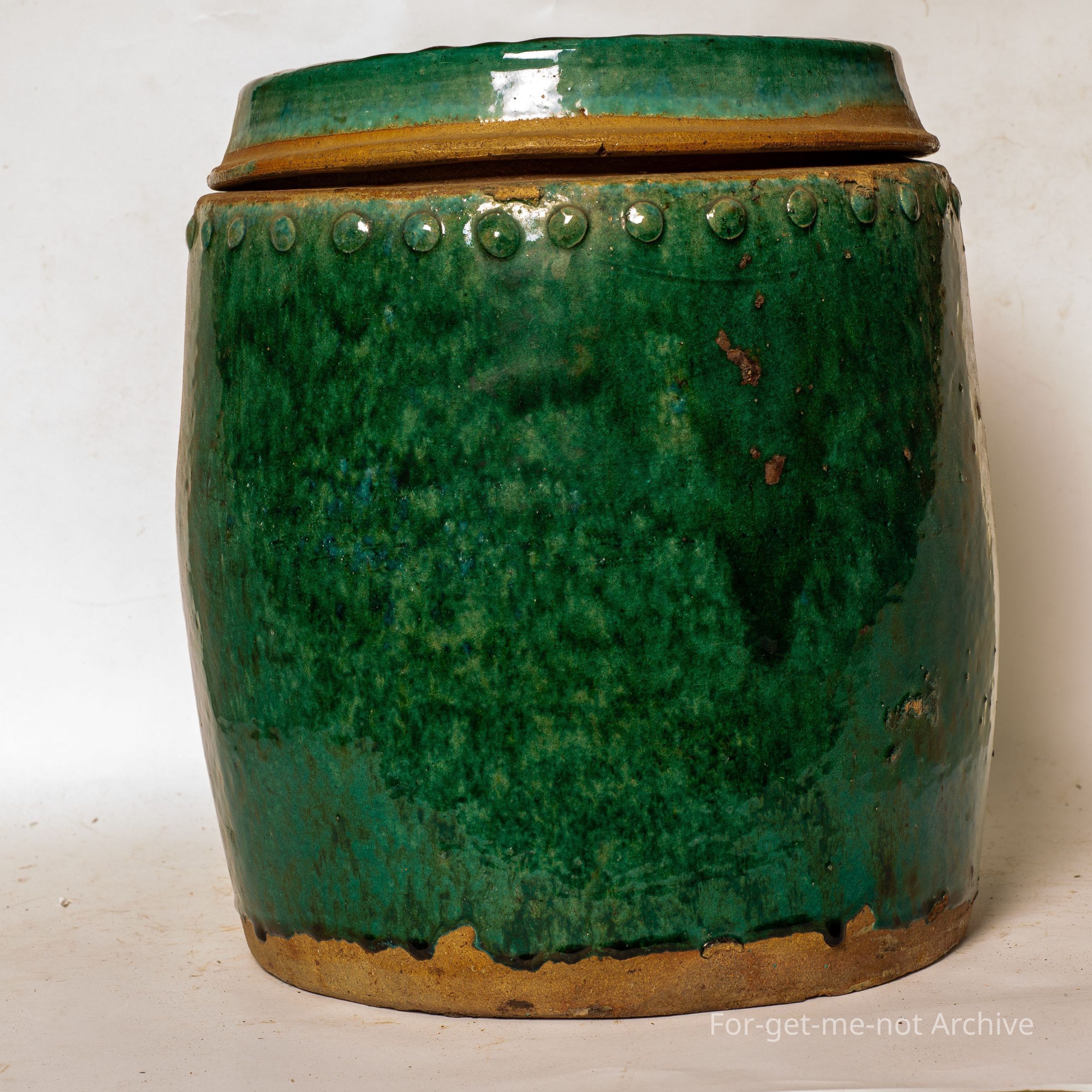 This is another splendid example of the heavily, lacquered Chinese storage jar. This one is an emerald green with the dimples around the top shoulder with original lid. This is in just as good a condition as the previous one. Is that glazed inside board? Yeah. But it's not green. Oh, yeah. This one doesn't have the green glaze on the inside, but still in very good condition.Collection