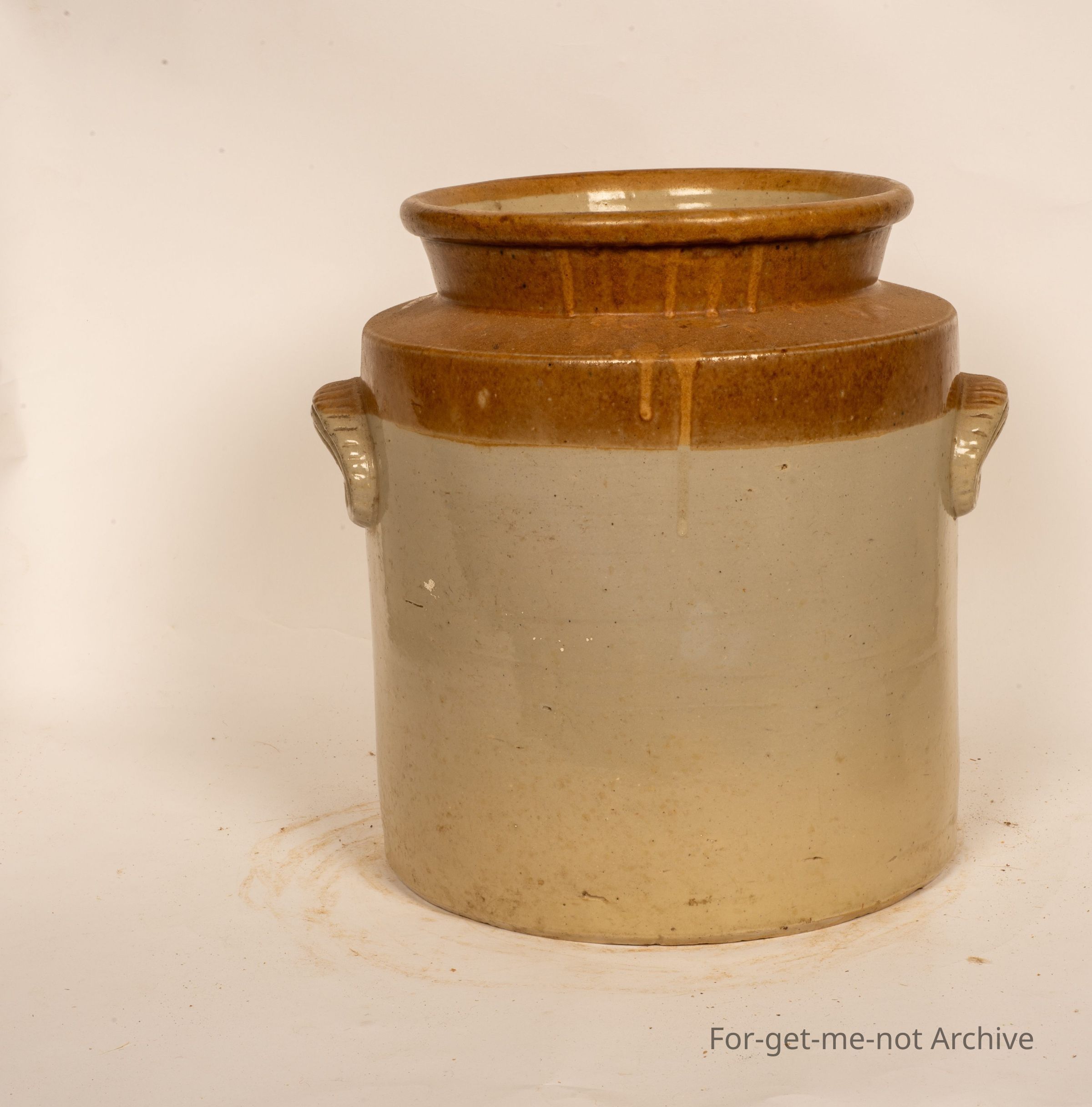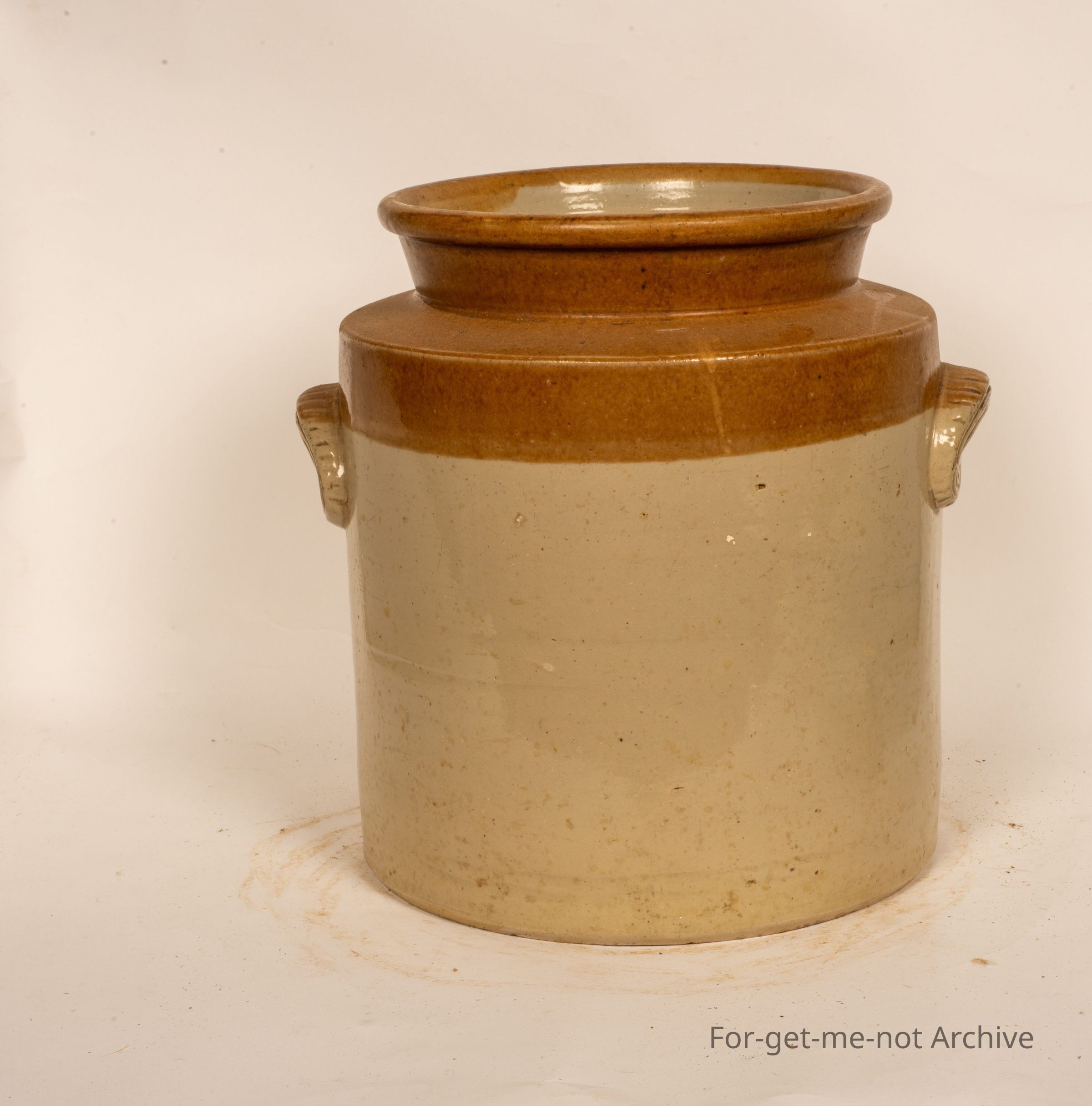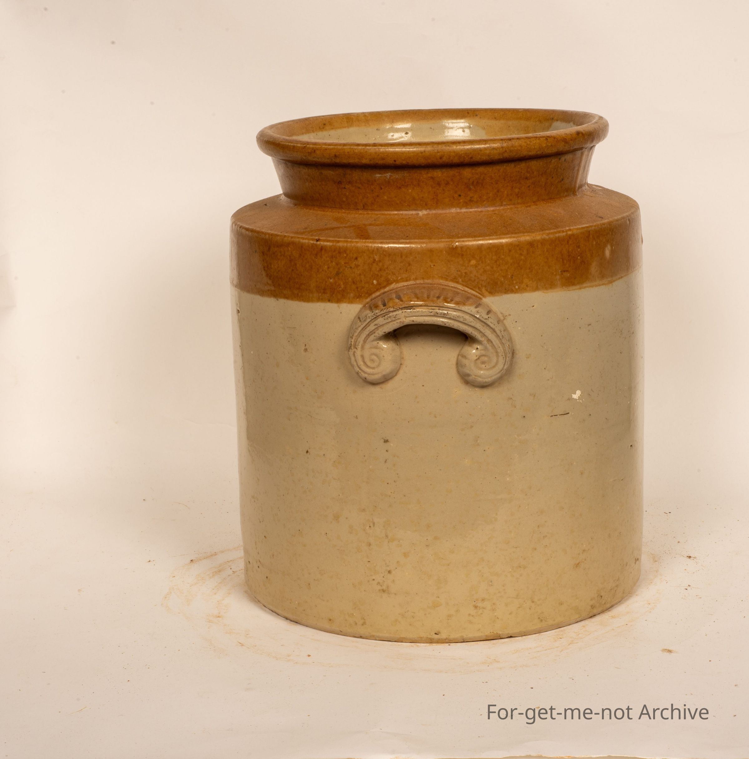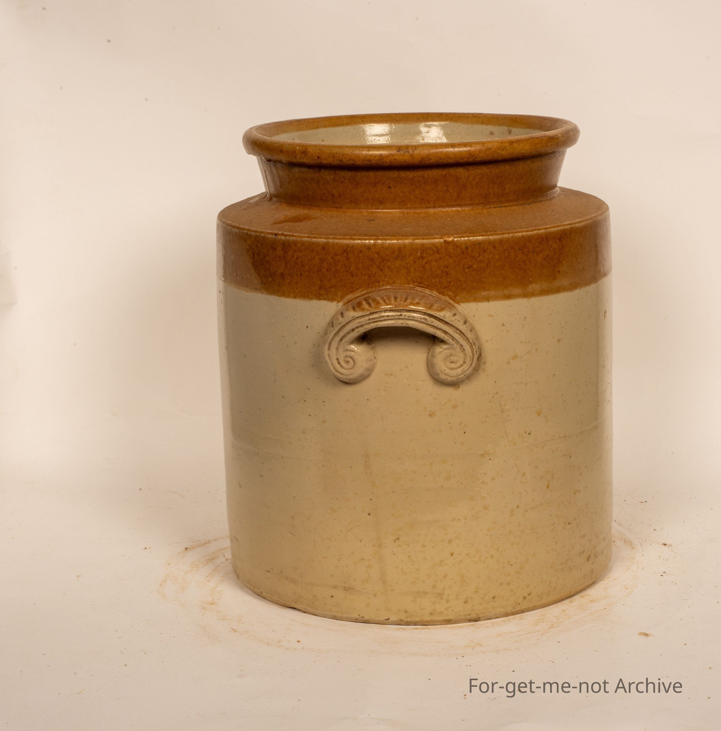This is a storage jar, in very good condition. No stampings, so hard to attribute. Handle's intact. The lip is in very good order.