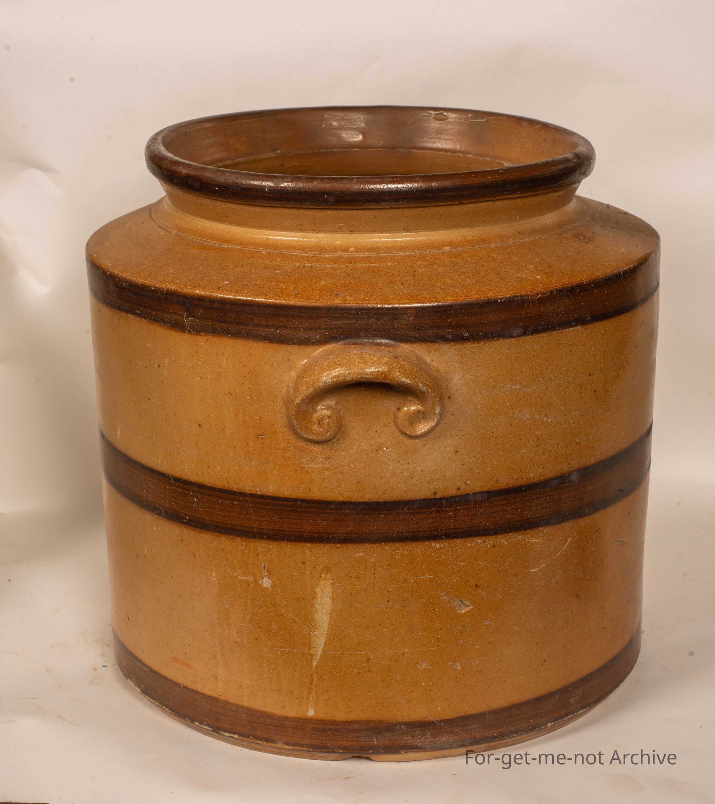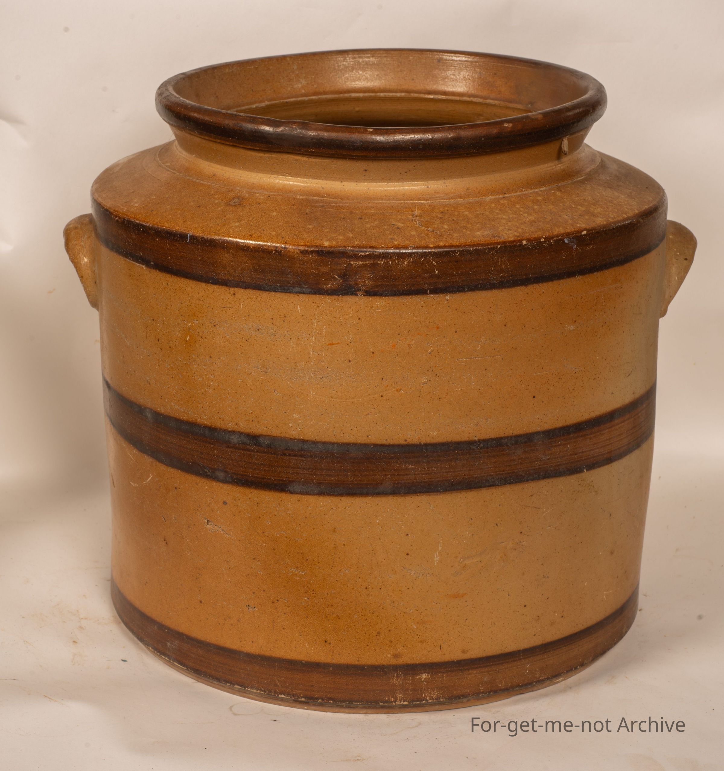 This is the largest of the Bendigo pottery storage jars. The dark glaze on the rim of the neck with 3, 1 on the shoulder, 1 in the middle, 1 in the on the base of further dark banding. This one is in good condition minus its original lid.Collection