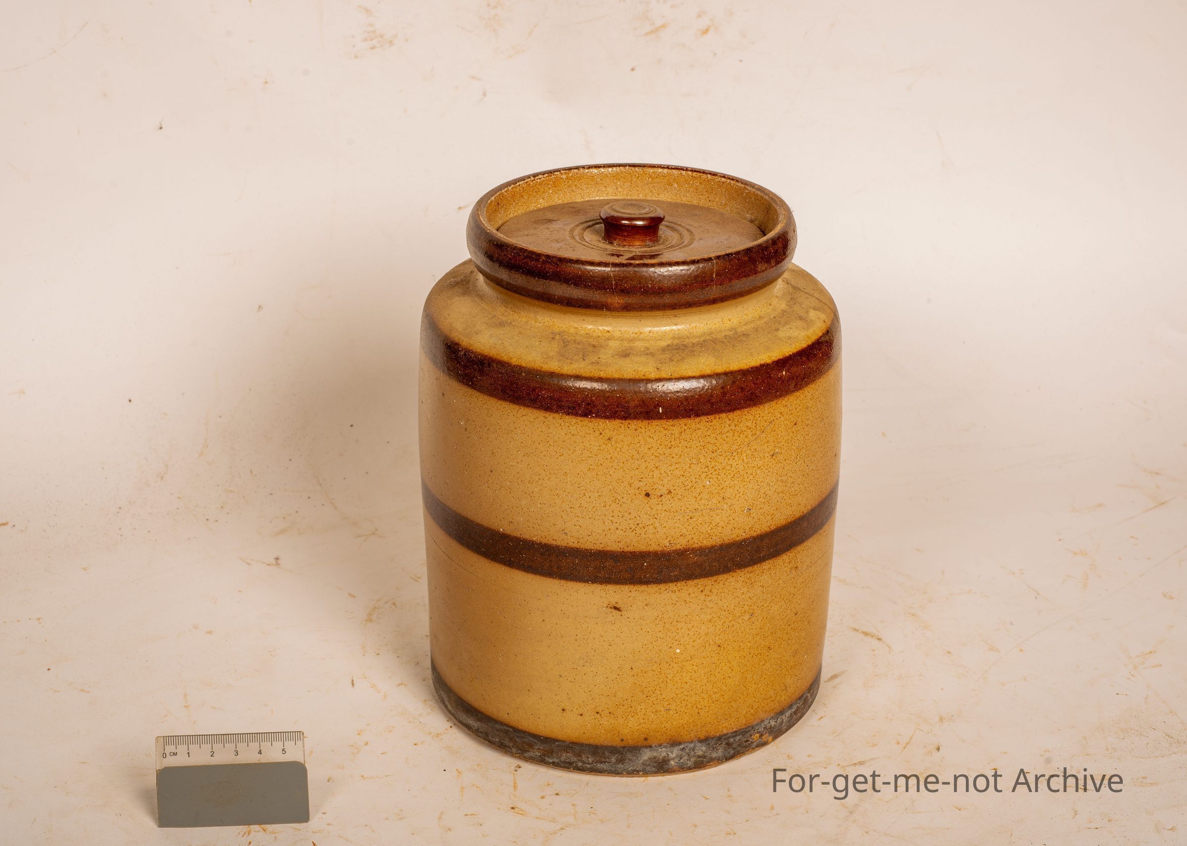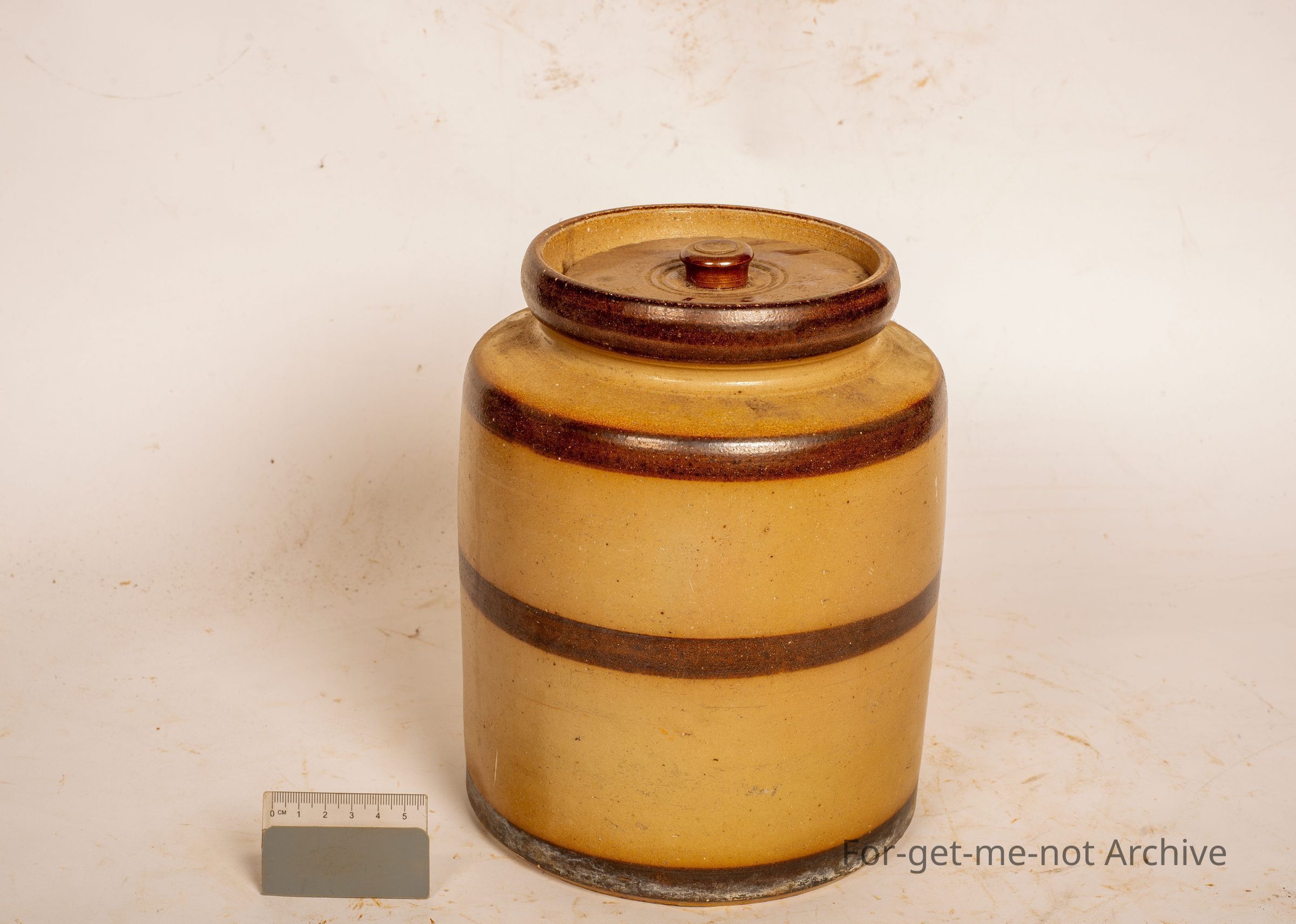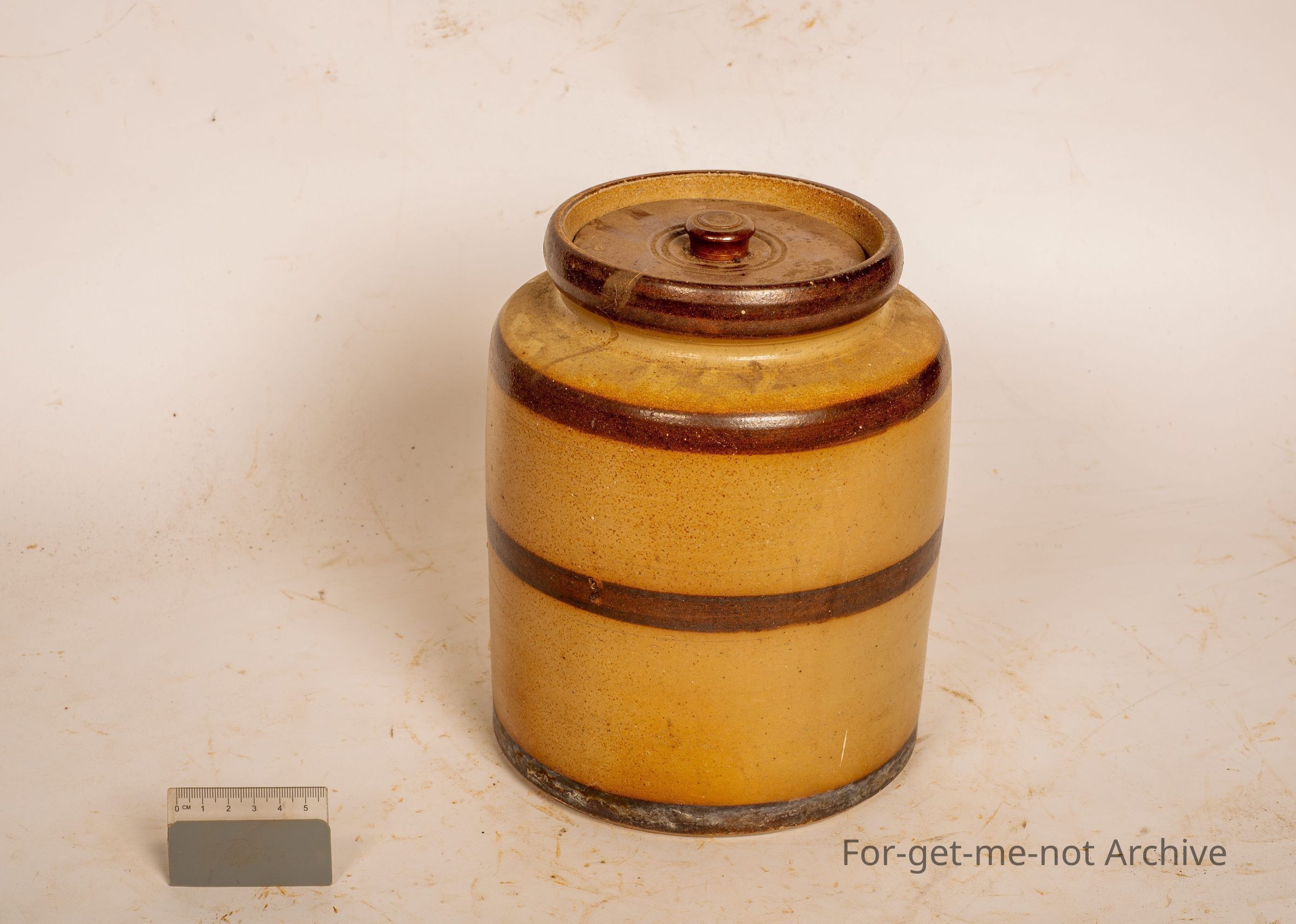This is a storage jar from Early Bendigo Pottery with the dark brown, stripes around the neck, the base, and the centre, with a lid in very good order, unstamped,
