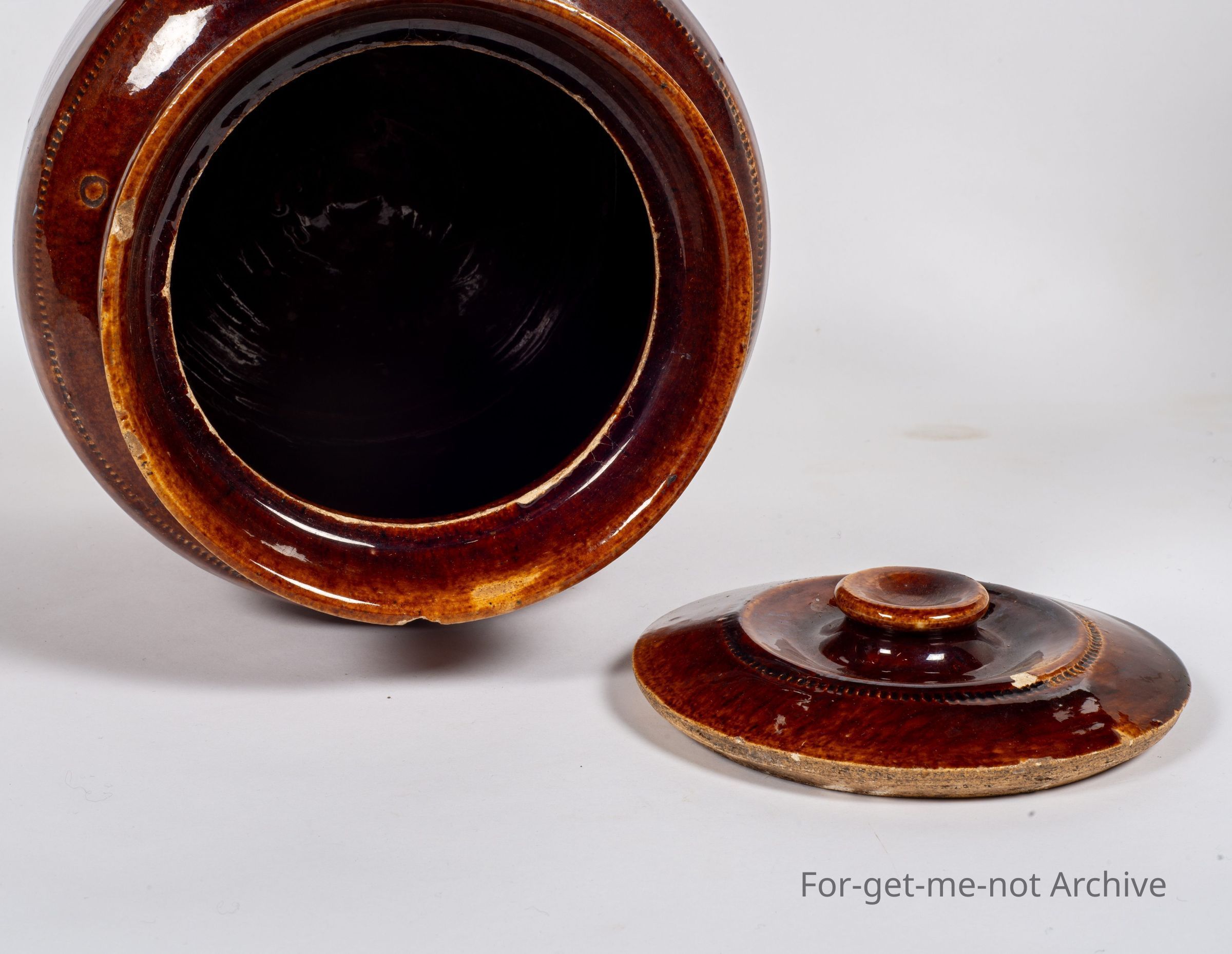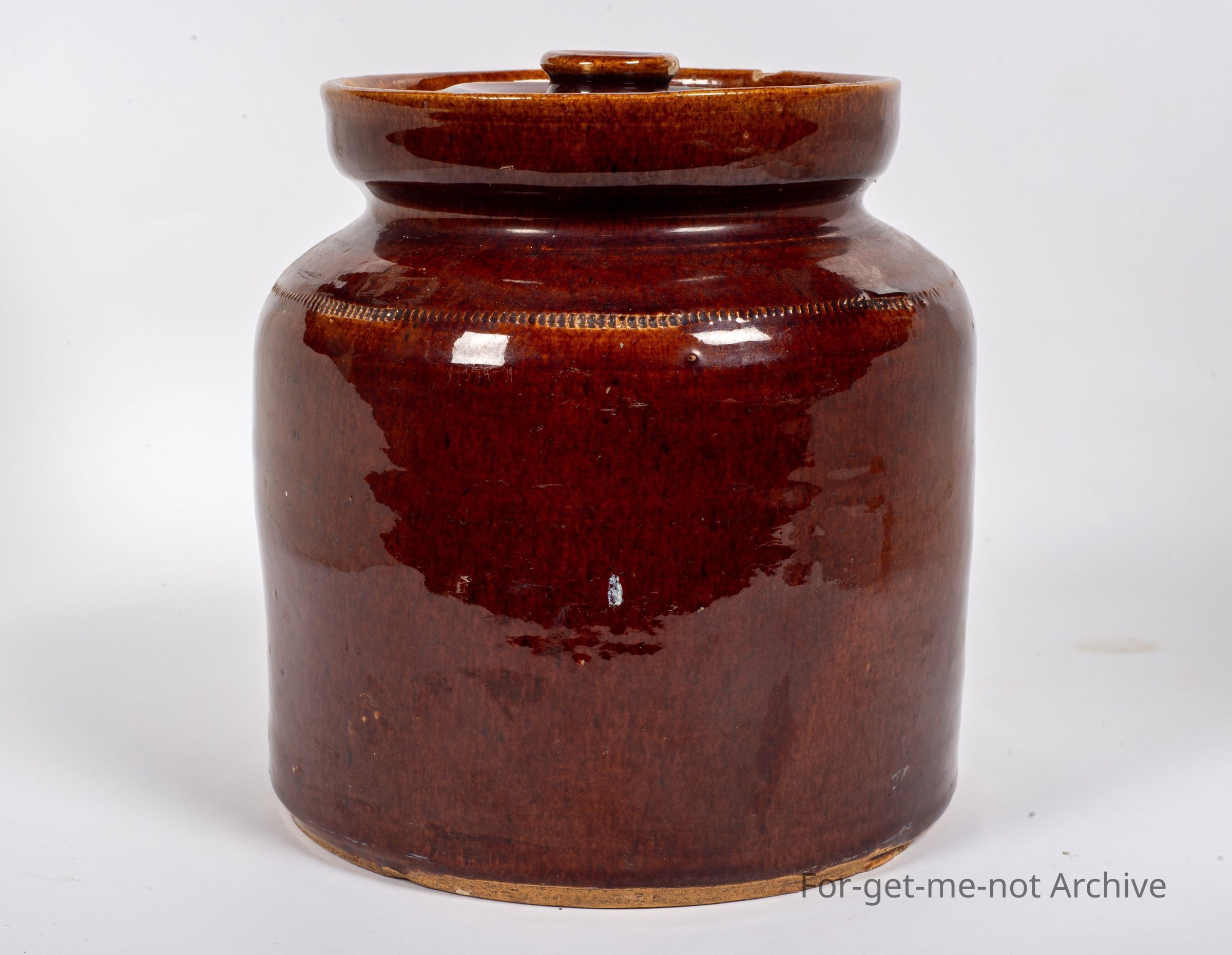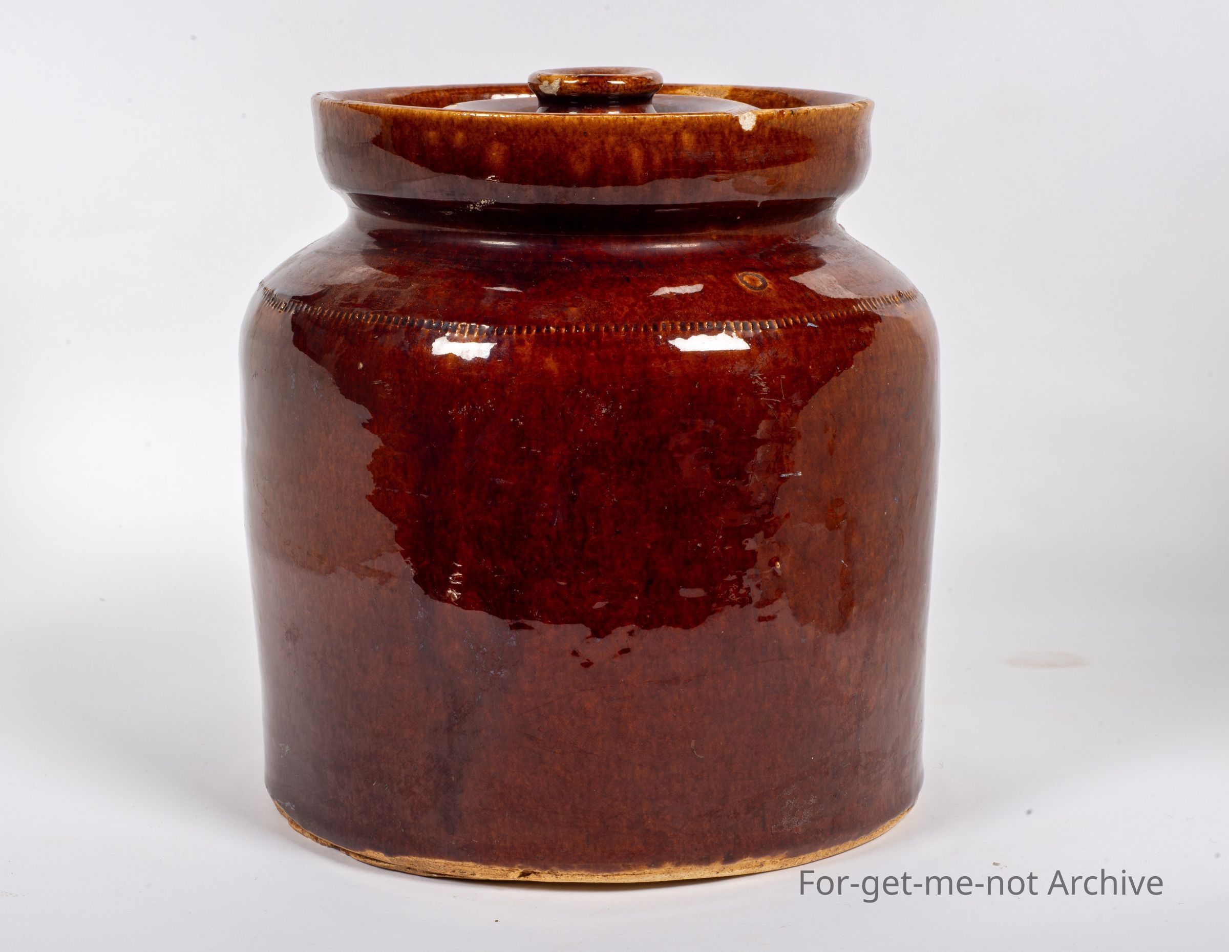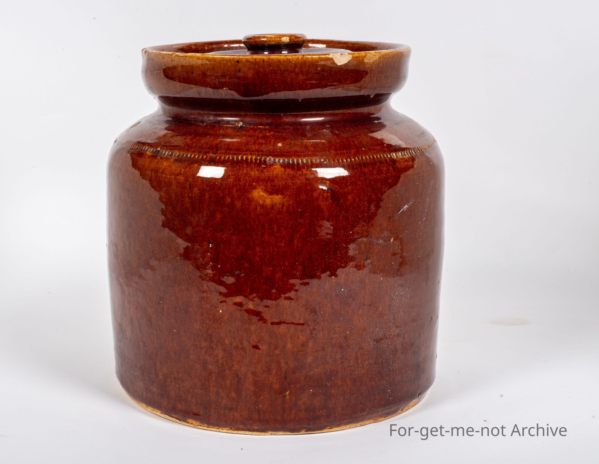 This is more stoneware pottery. This, time, a beautiful Rockingham glaze on a storage jar has the original lid. This piece is unstamped but attributed to, Lithgow potteries.