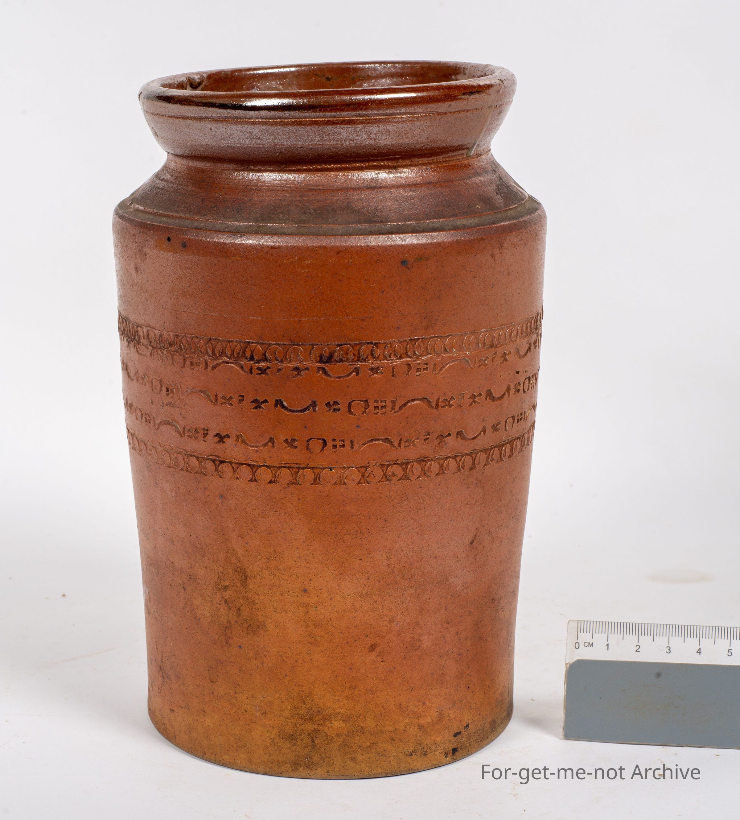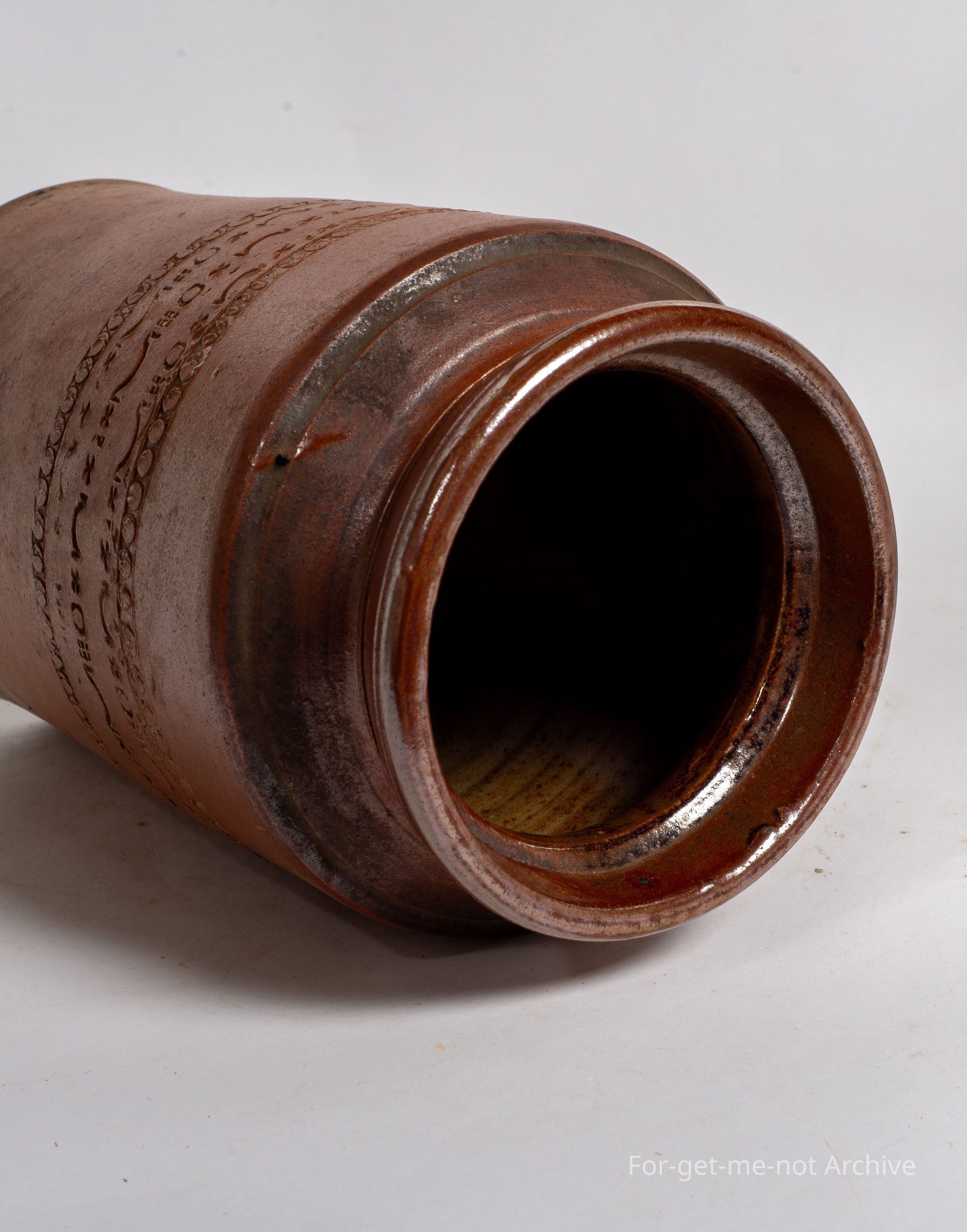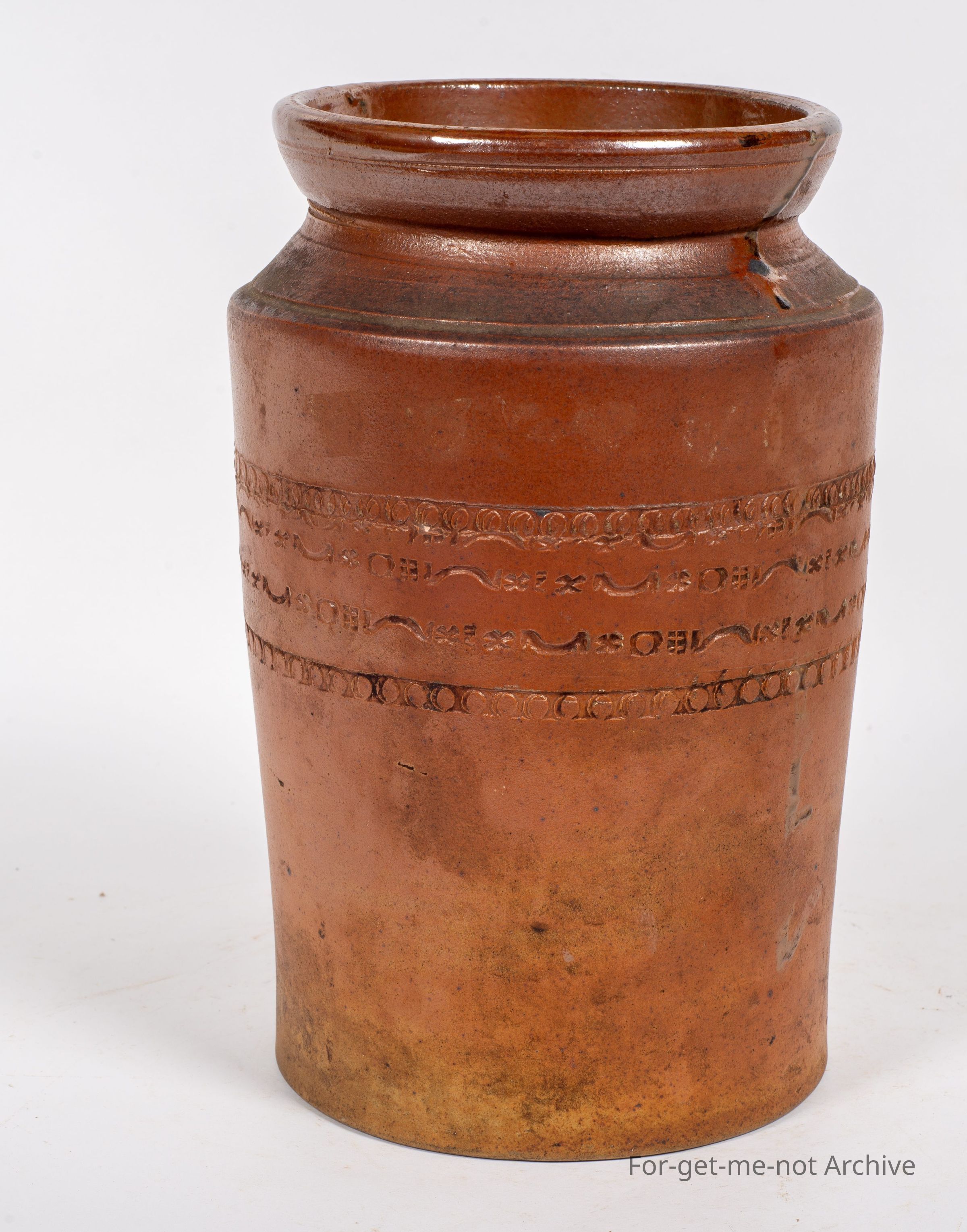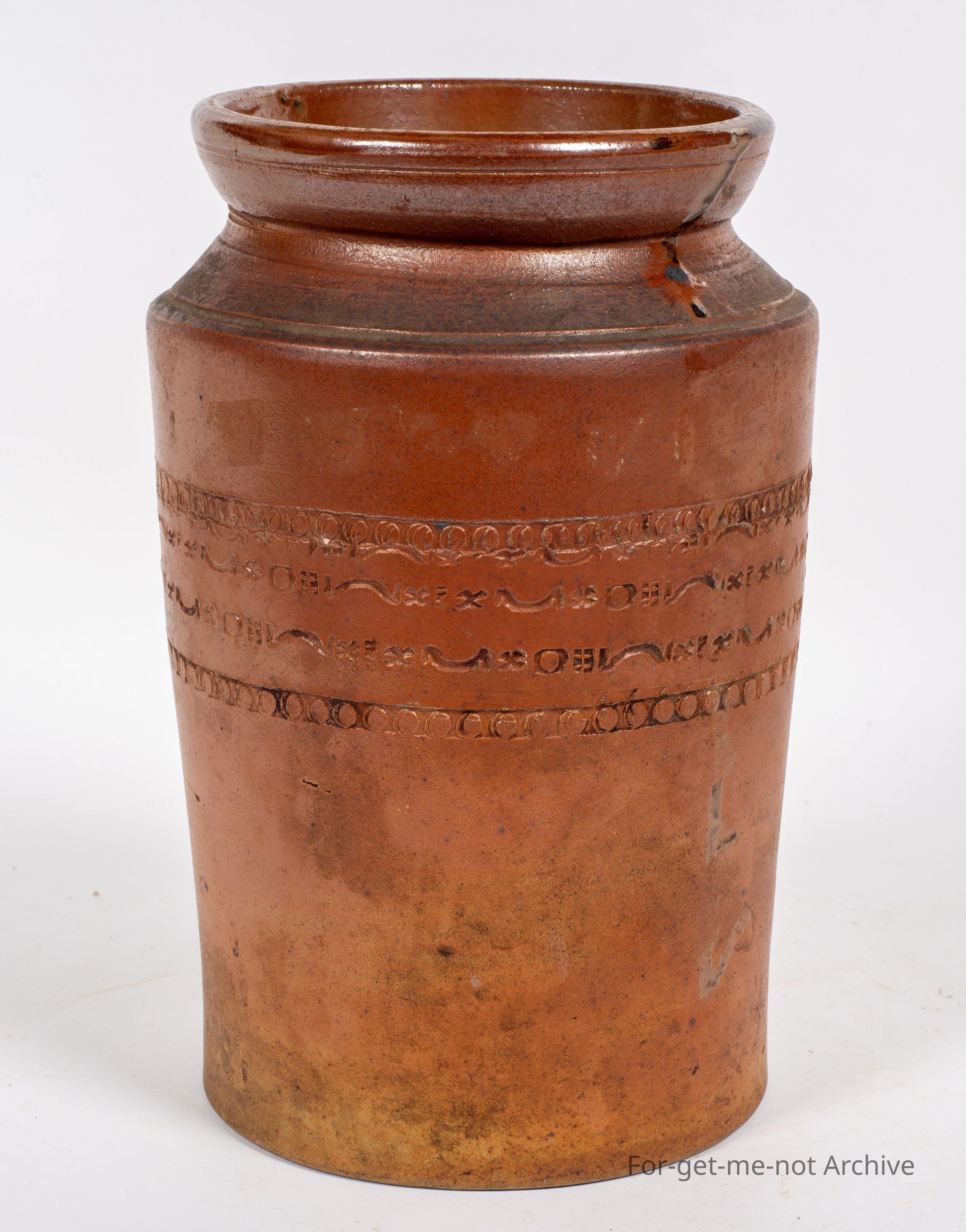 Stoneware pottery. This one is a storage jar, This piece is has very, . This piece has very ornate coggle work, 4 rows around the lower shoulder. No chips or cracks. This piece has been attributed to the early Beechworth Pottery and extremely rare.Collection