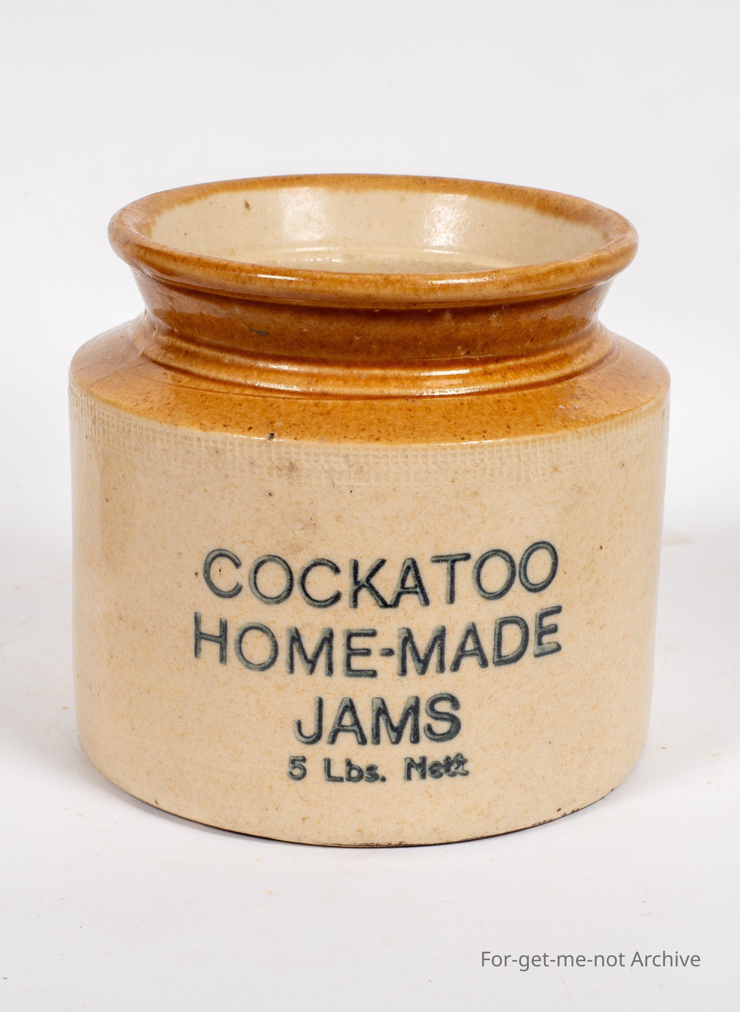 Stoneware pottery storage jar. This is, This is from Bendigo Pottery Inc, stamped cockatoo homemade jams, 5 pound net weight. This is in very good condition, no cracks or chips.