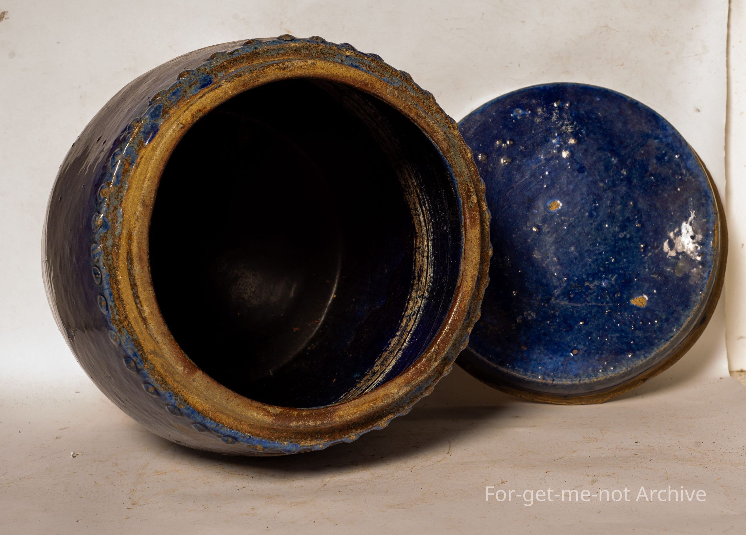 Chinese collection. This is a superb example of, a storage jar, a deep blue glaze, dimples around the, top shoulder with its original blue lid. This is also glazed inside. A wonderful example of Chinese ceramic,Collection