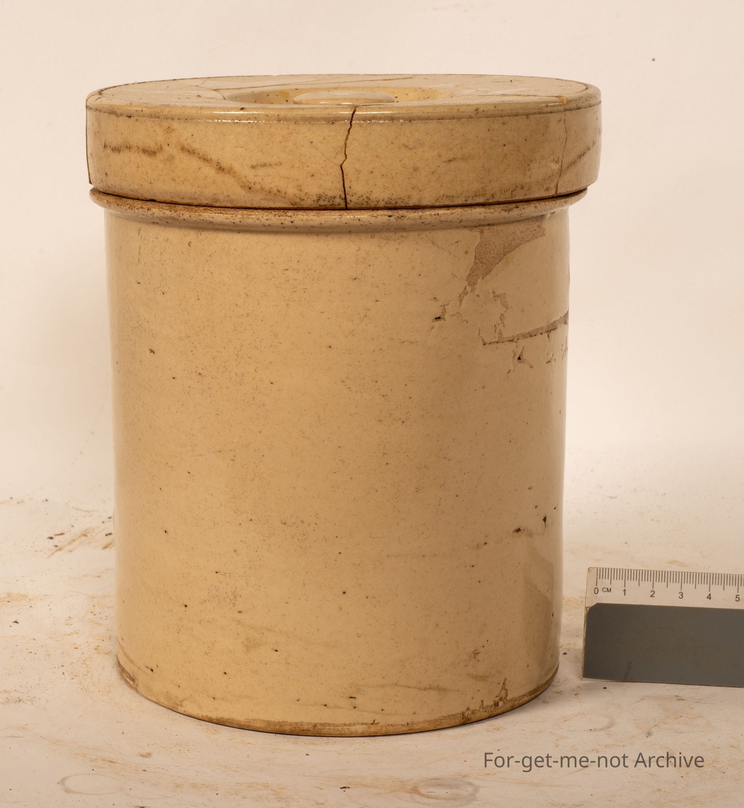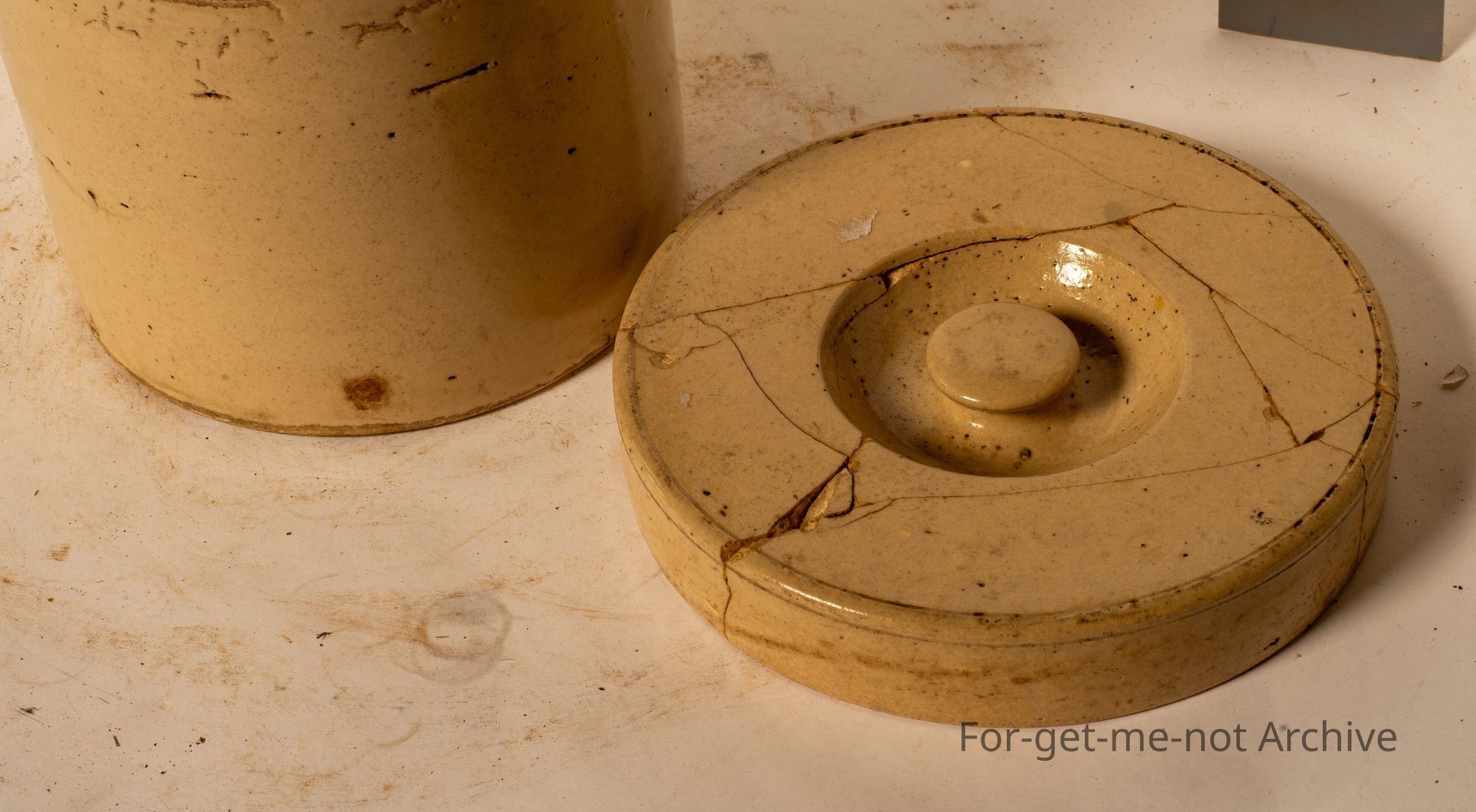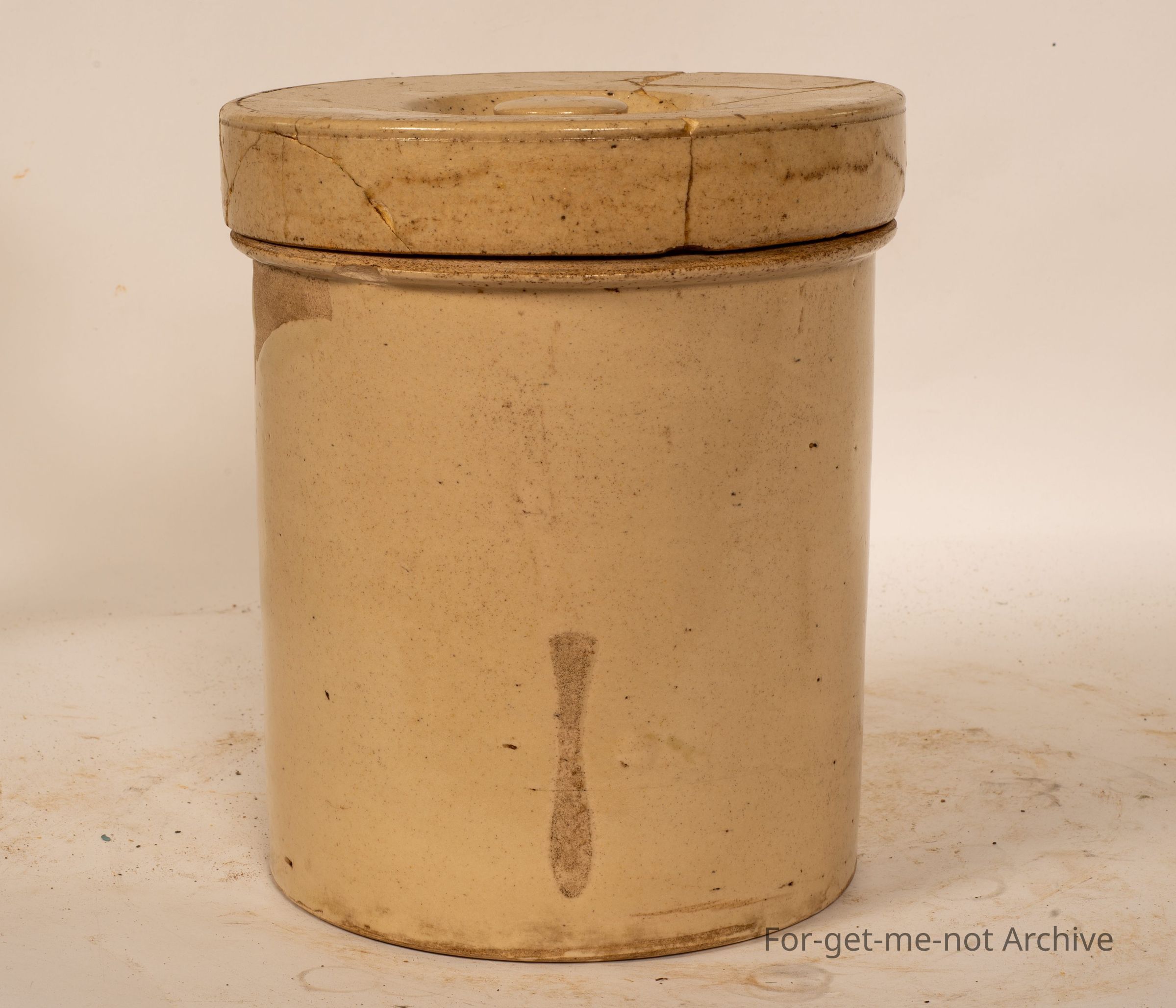 Stoneware Pottery section, This is an extremely early storage jar with lid. The lid has been broken and glued together, so numerous bolts with the lid. Unfortunately, not stamped, but definitely from one of the very early Australian potteries. To have a guess, it could be very early Fowler Sydney. Value, because of the breakagesCollection