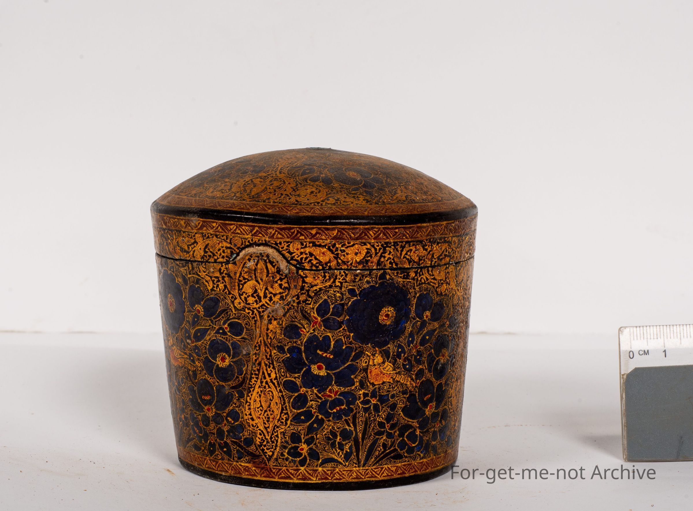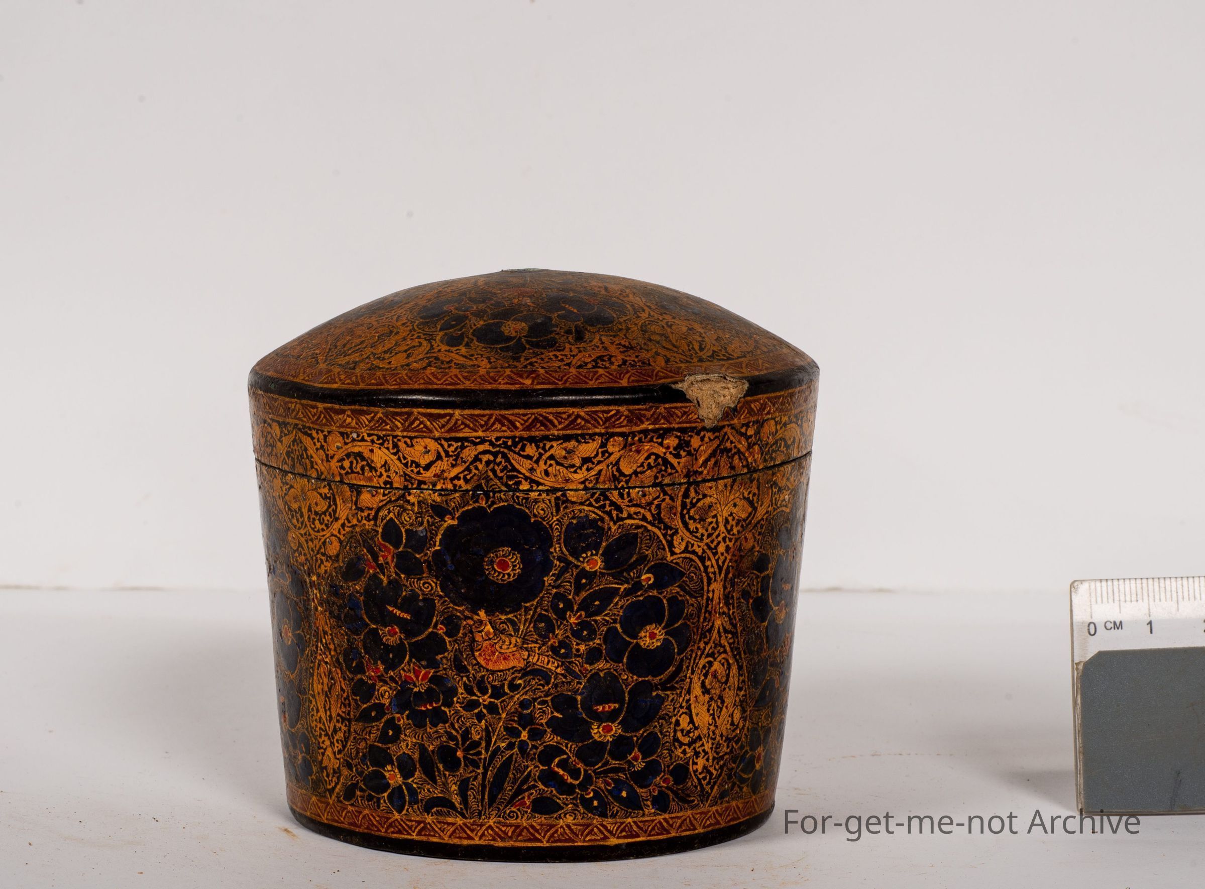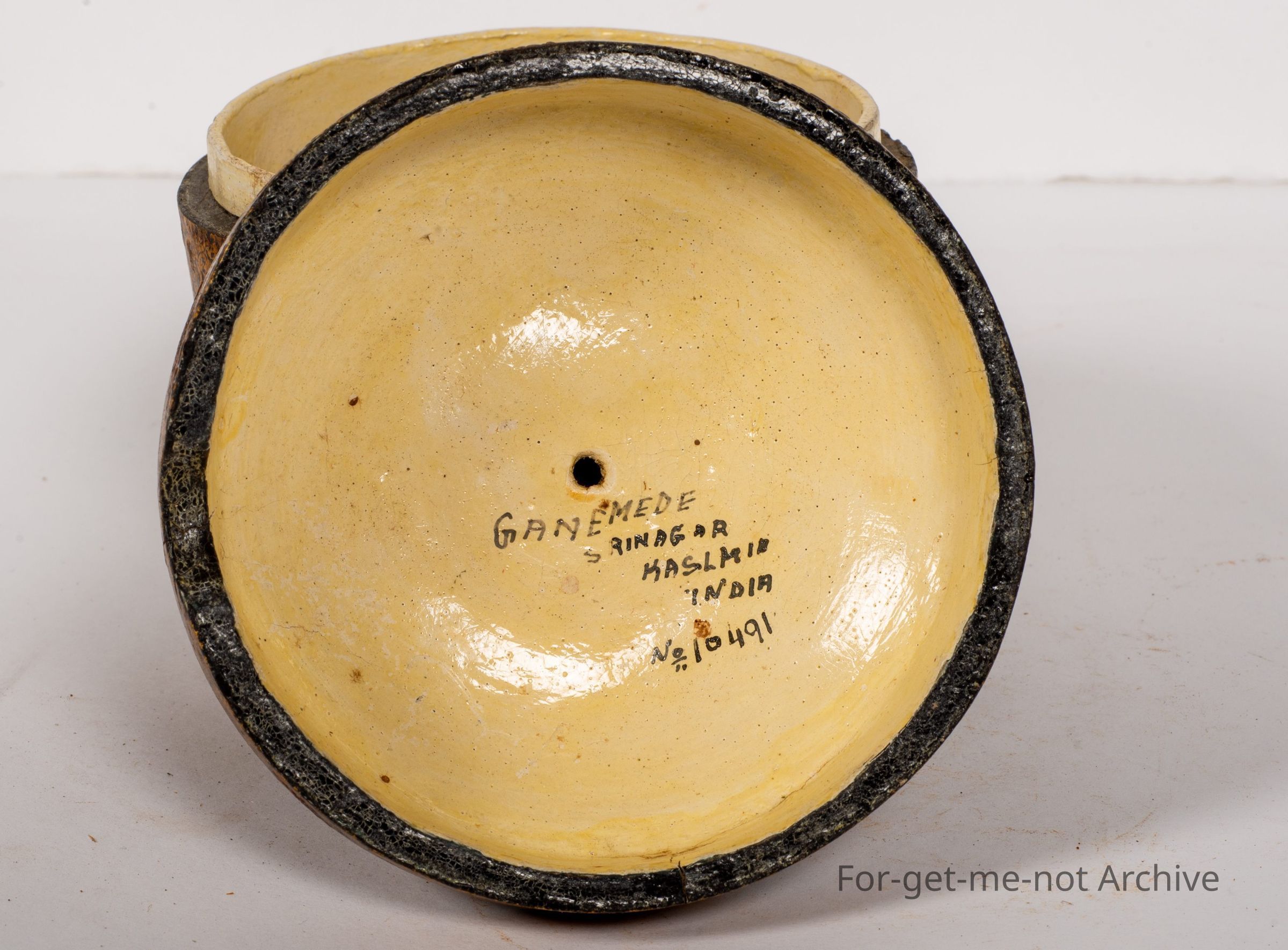 This is a craft piece description. This is a small pot with a lid, made from paper Mache. The top knob is missing. It's definitely of Indian heritage. In quite good order and very skilfully done.Collection