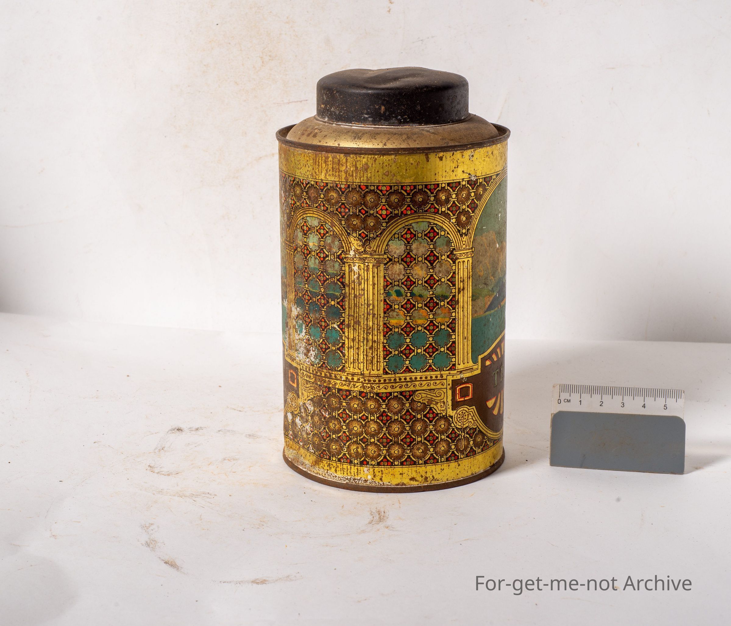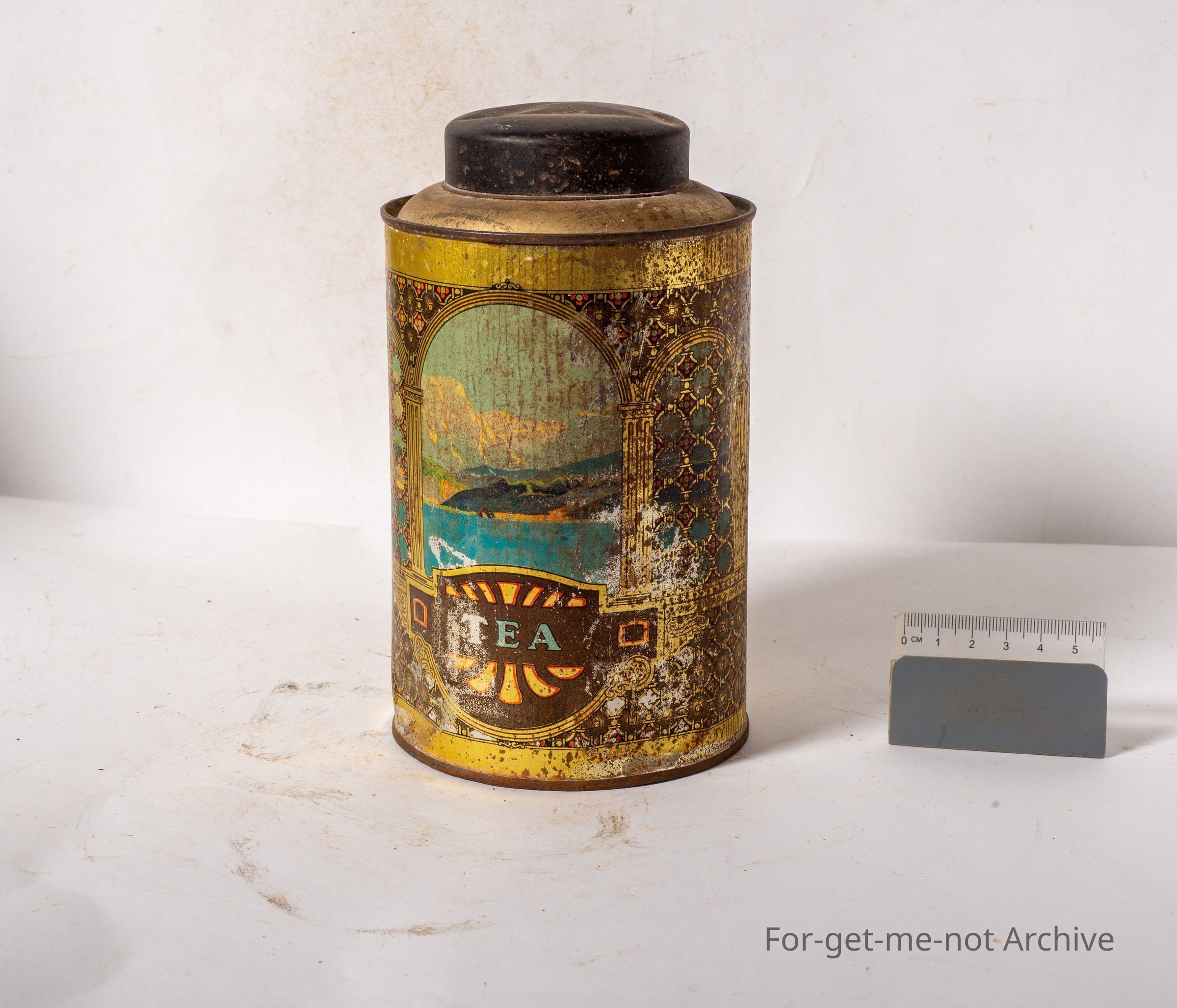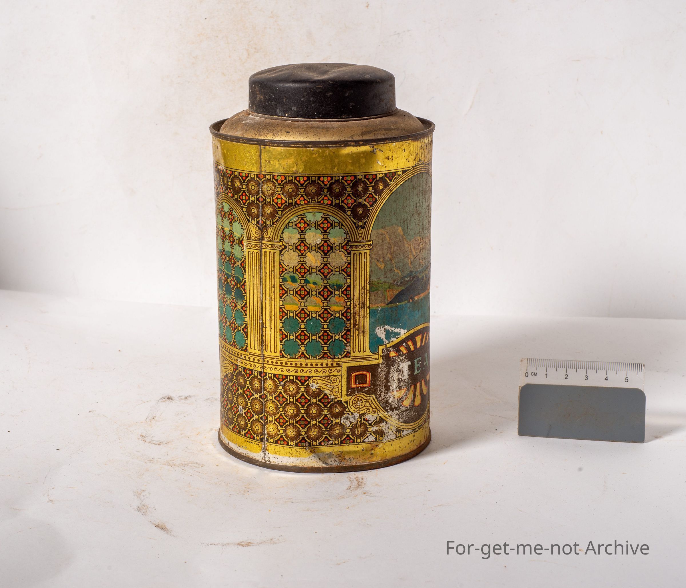 This is from a series of storage tins. This one is "tea" with a scene of this of the sea. Not in bad condition. This would have been a very attractive set when new.