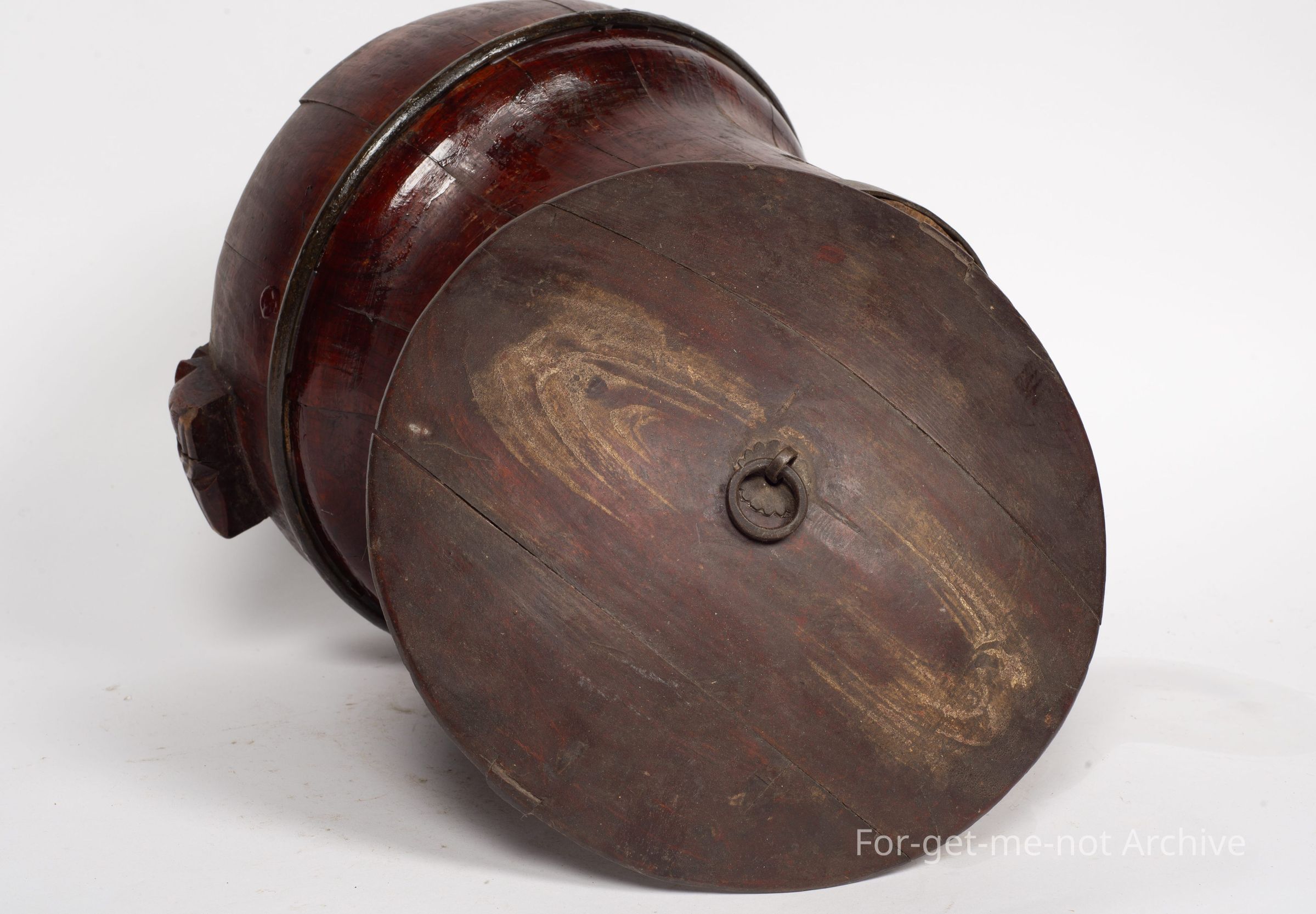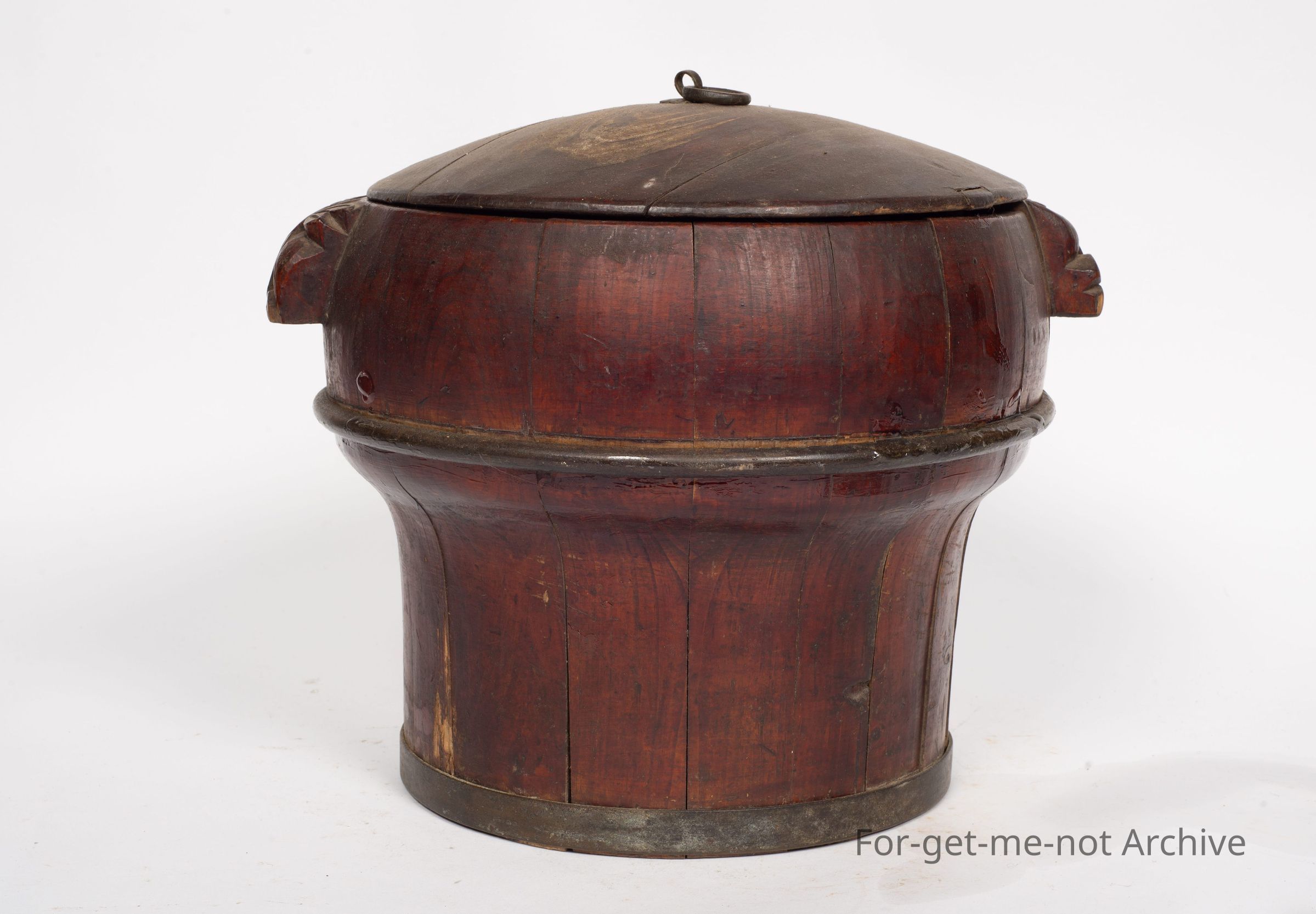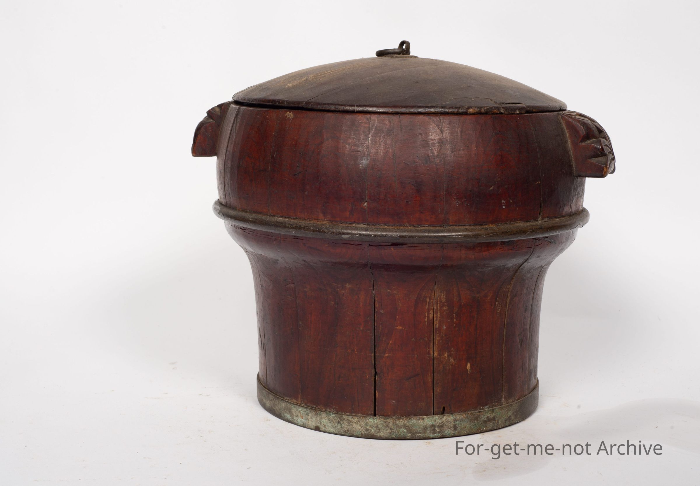 Is a Chinese storage vessel, lidded. This has the wooden handles on the side. It has the metal wings to retain its strength and shape. It has a diagram on the top which is really faded but still, quite a wonderful early Chinese piece,Collection