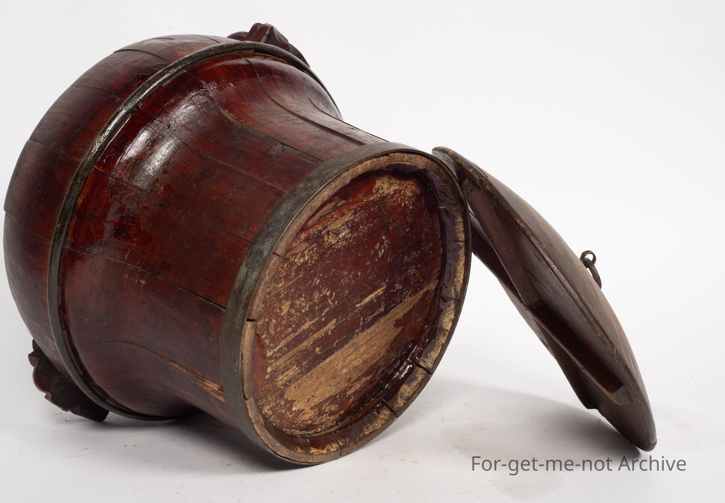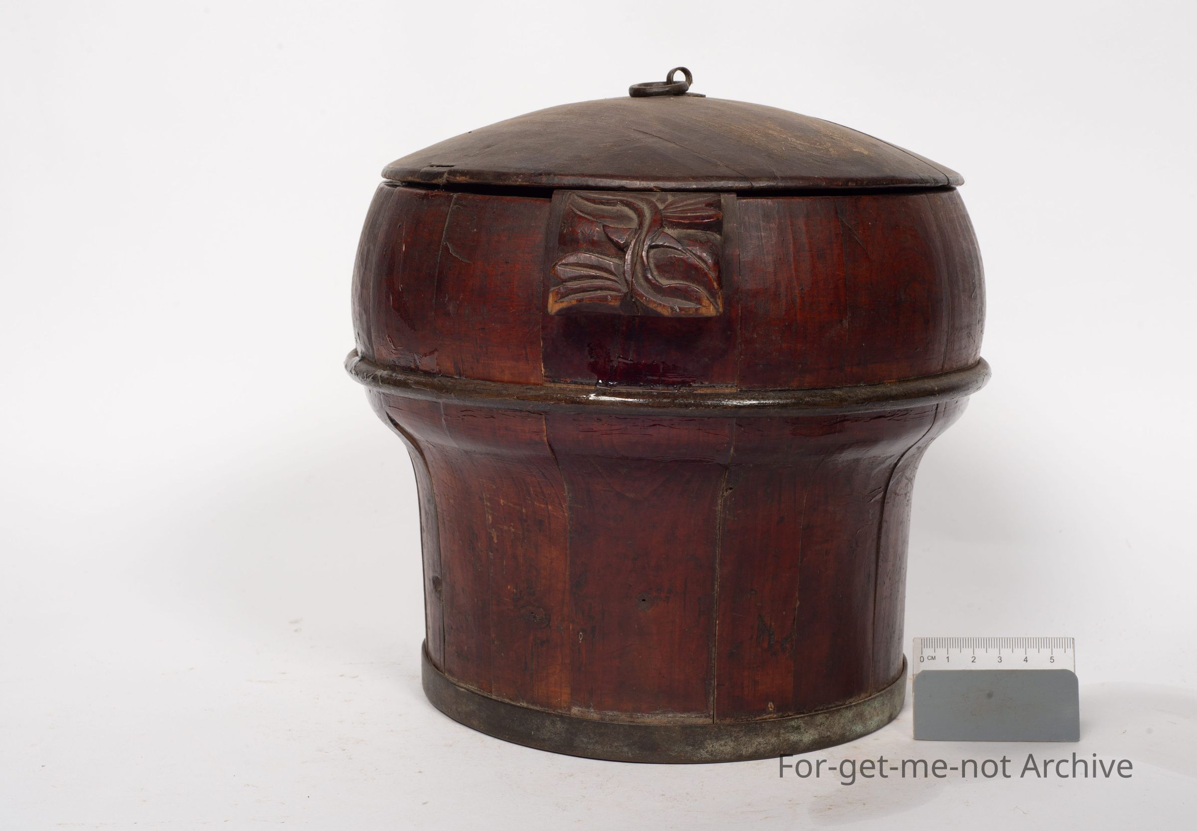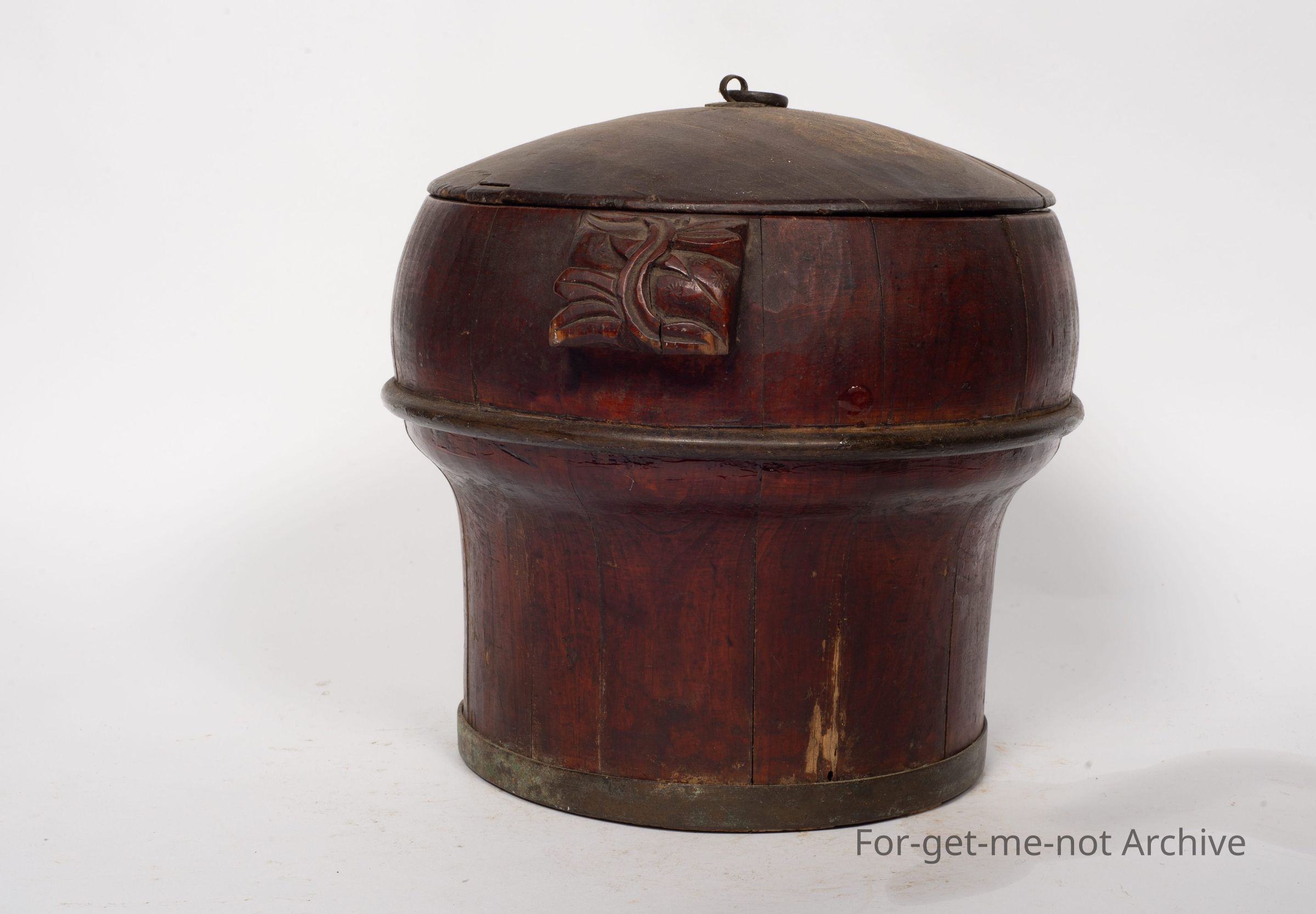 Is a Chinese storage vessel, lidded. This has the wooden handles on the side. It has the metal wings to retain its strength and shape. It has a diagram on the top which is really faded but still, quite a wonderful early Chinese piece,Collection